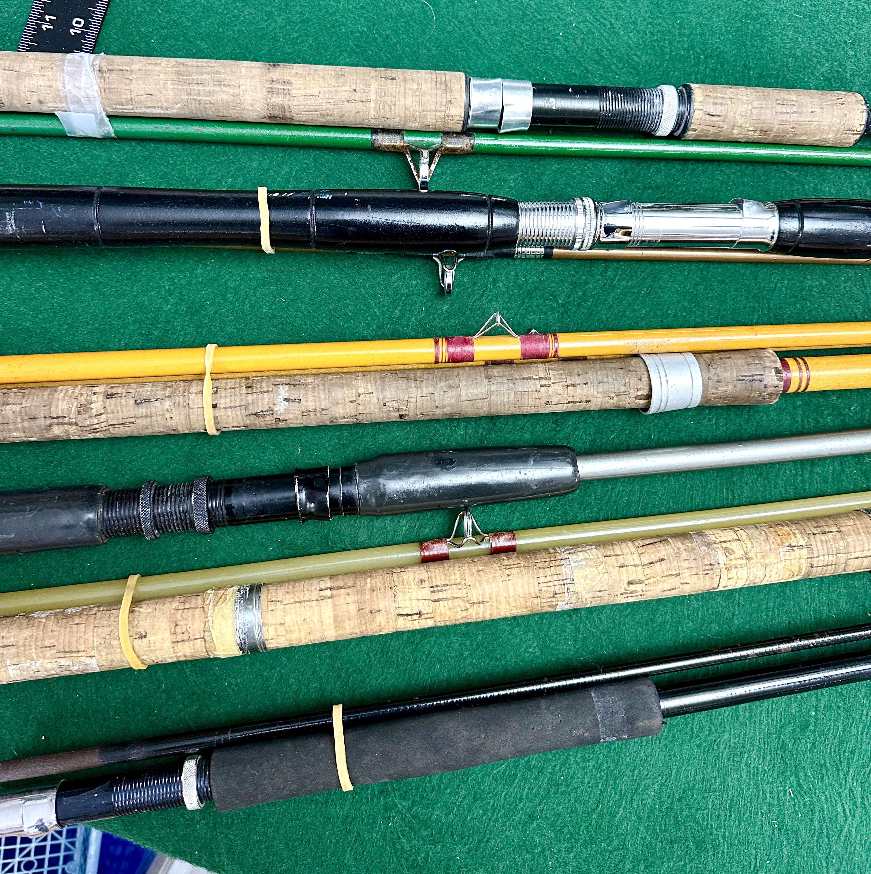 The collection is in used condition with signs of age and wear consistent with regular angling use. Surface scratches, oxidation to metal components, and wear to the cork and foam grips are present. Some sections are held together with tape which may leave residue upon removal.