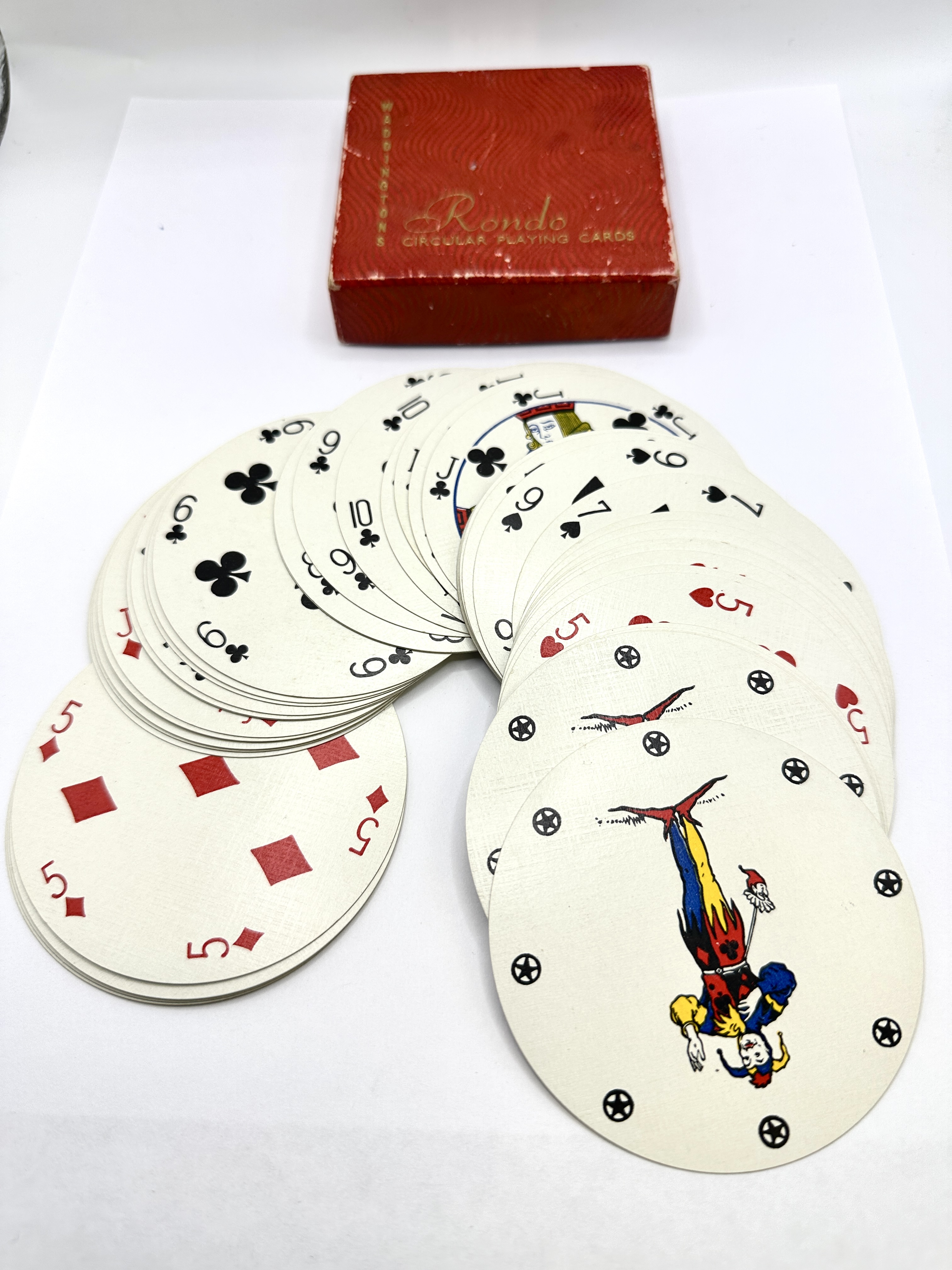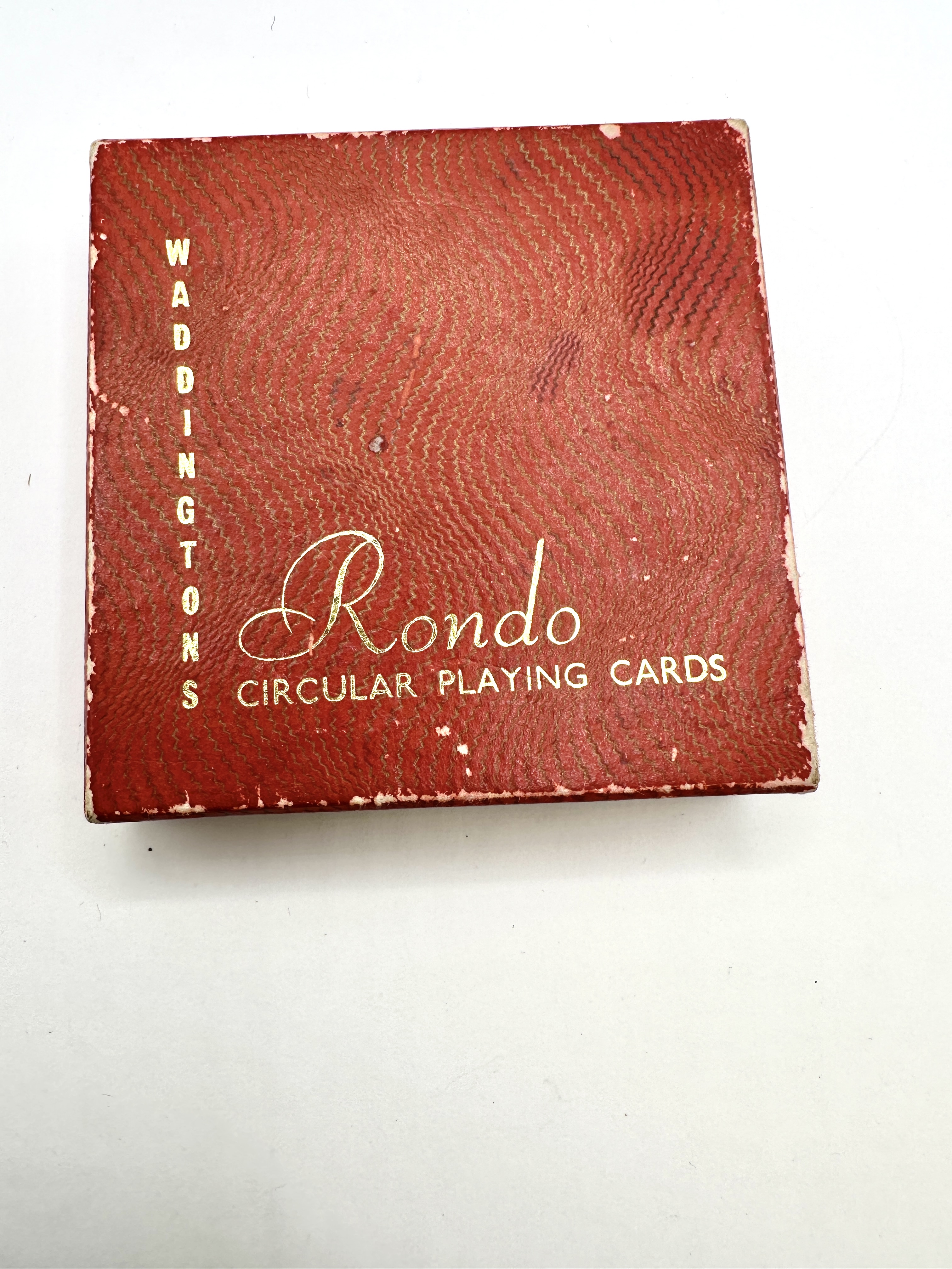 A set of Waddingtons Rondo circular playing cards, dating to the mid-20th century, circa 1950s. The set is housed in its original red cardboard box, which features a textured wavy pattern and gold-tone lettering to the lid. The cards are constructed from a textured cardstock, with standard suits and values printed along the circular perimeter. The set includes a Joker card depicting a colourful court jester.
