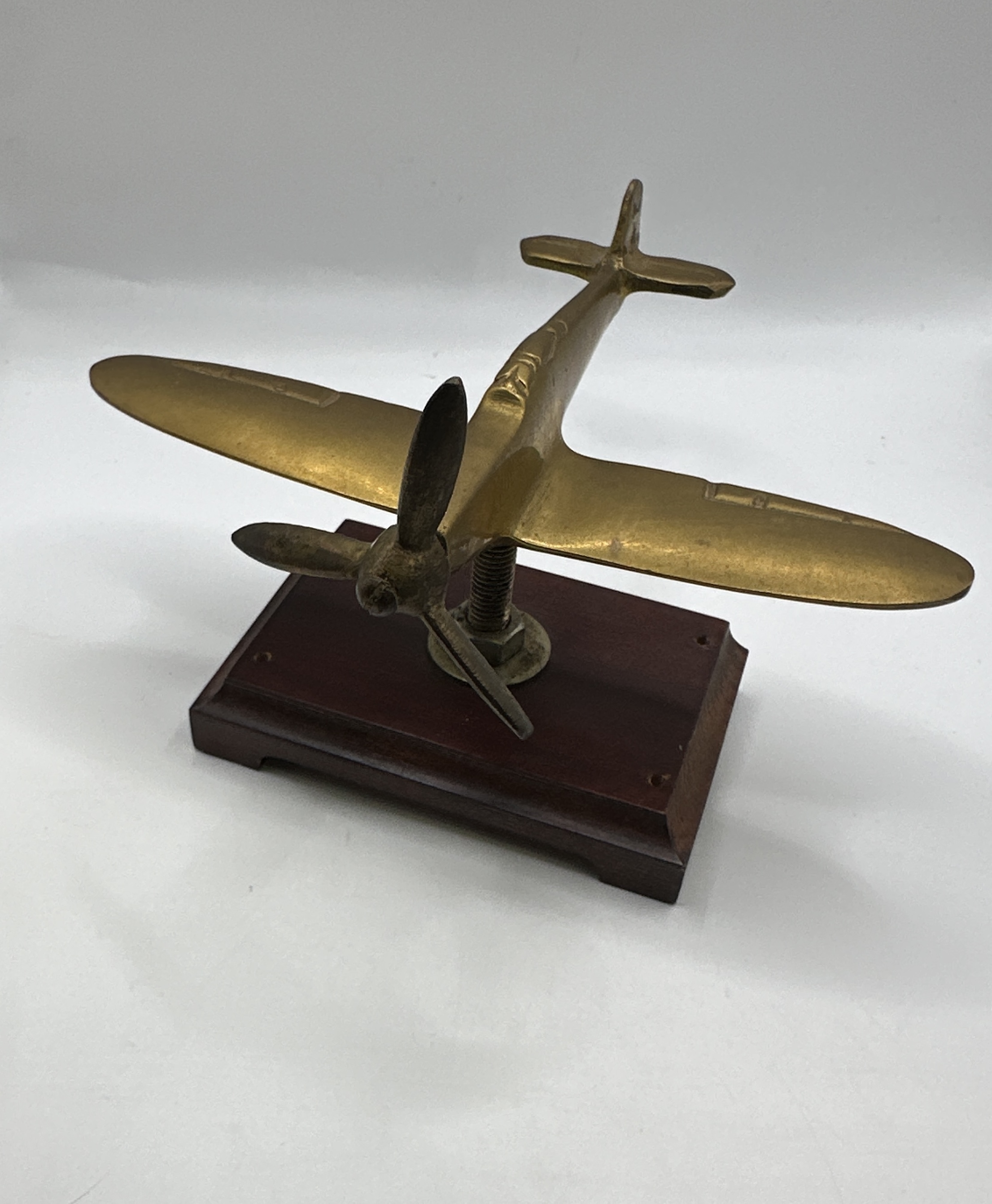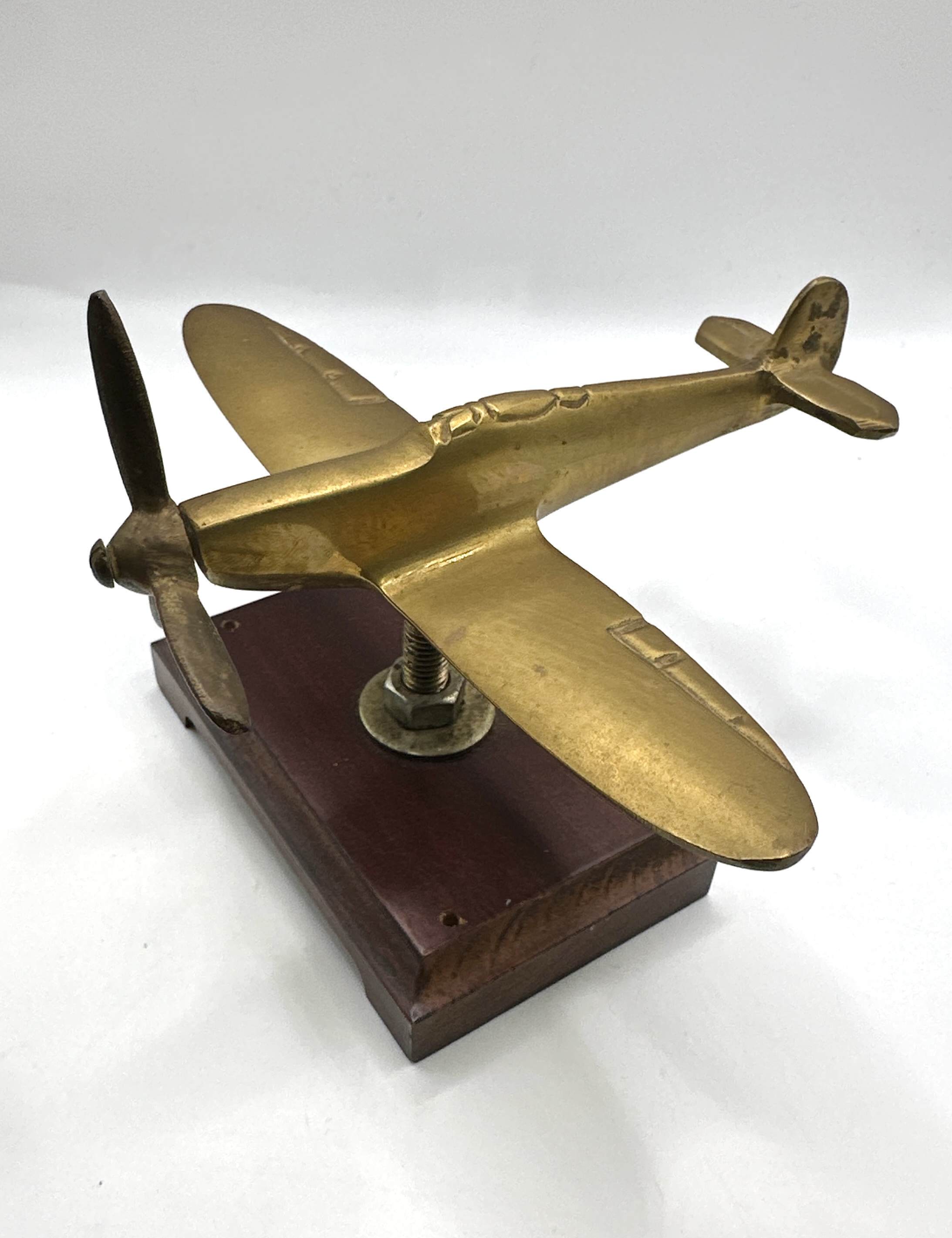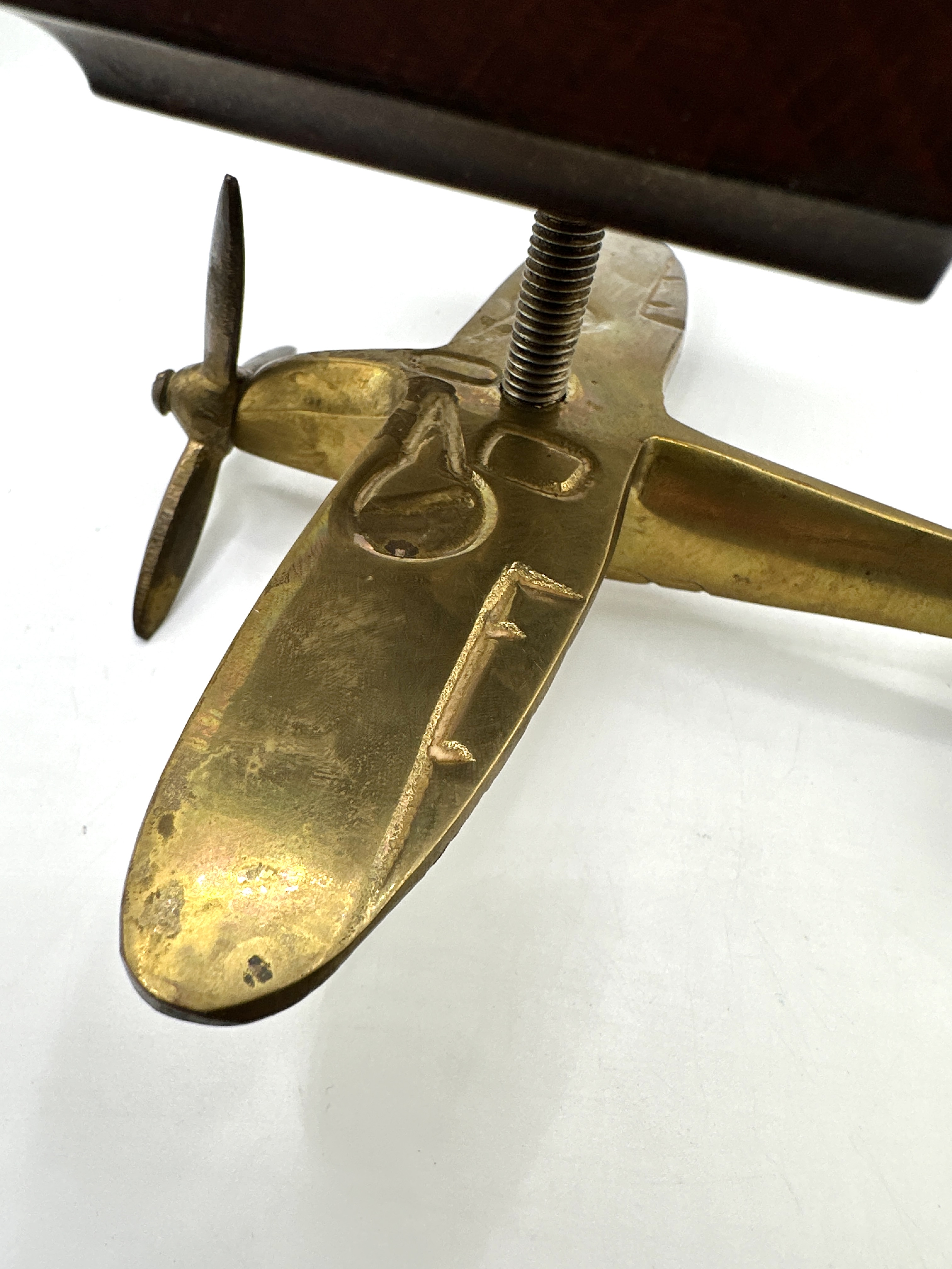 A Second World War trench art style brass model of a Supermarine Spitfire fighter aircraft. The model is cast from a yellow metal alloy and features a three-bladed propeller with stylised detailing to the fuselage and wing undersides. The aircraft is elevated upon a dark-stained rectangular wooden plinth, secured by a threaded metal rod and nut.