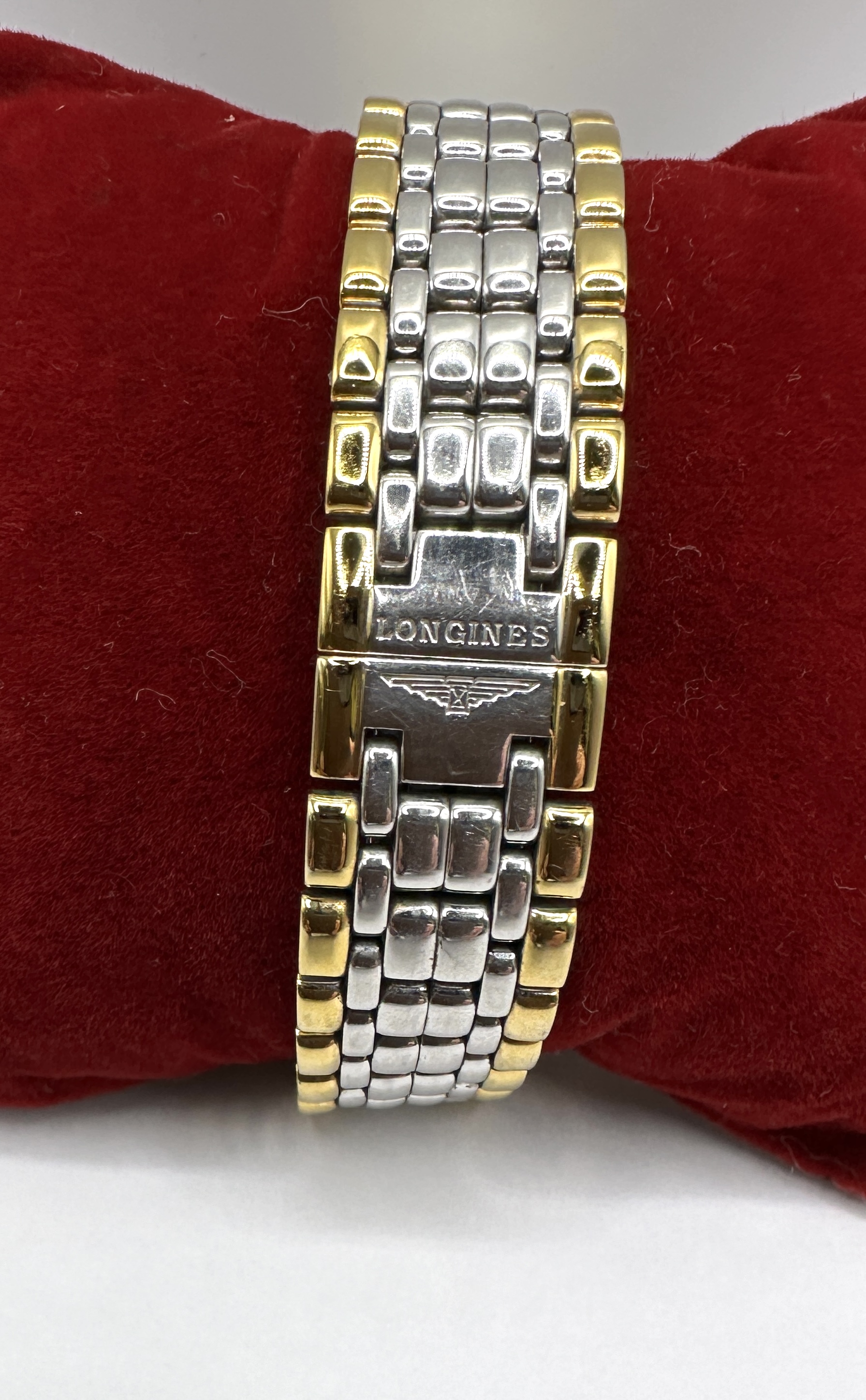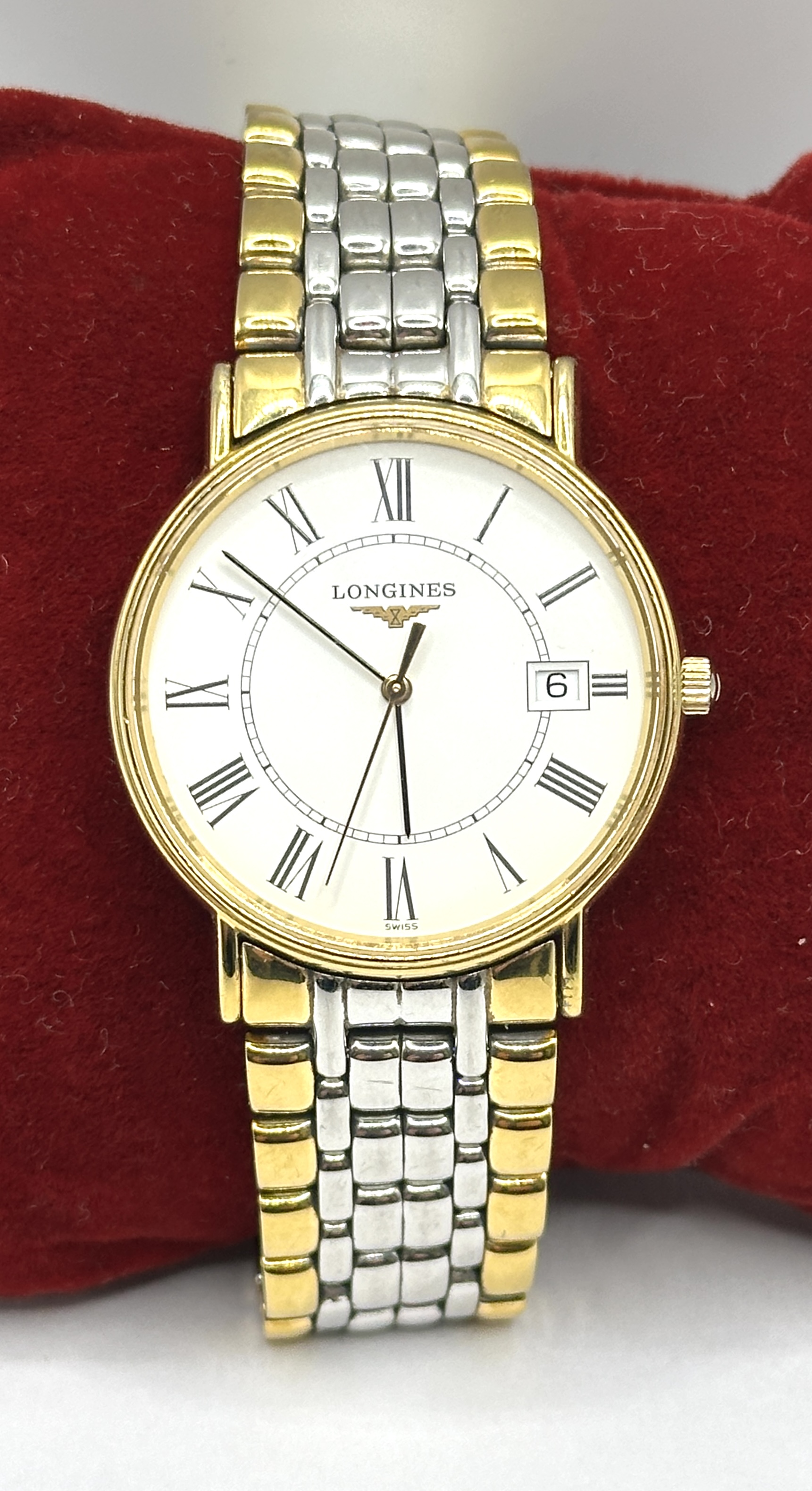 A Longines Presence quartz wristwatch, reference number L4.720.2. The timepiece features a circular gold-plated stainless steel case housing a white dial. The dial displays black Roman numeral hour markers, a date aperture at the 3 o’clock position, and a peripheral minutes track. The dial is signed Longines with the winged hourglass logo and marked Swiss at the 6 o’clock position. The watch is mounted on a two-tone stainless steel bracelet with alternating gold-toned and silver-toned links, finished with a signed folding clasp. The case back is engraved with the reference number L4.720.2 and the text All Stainless Steel.