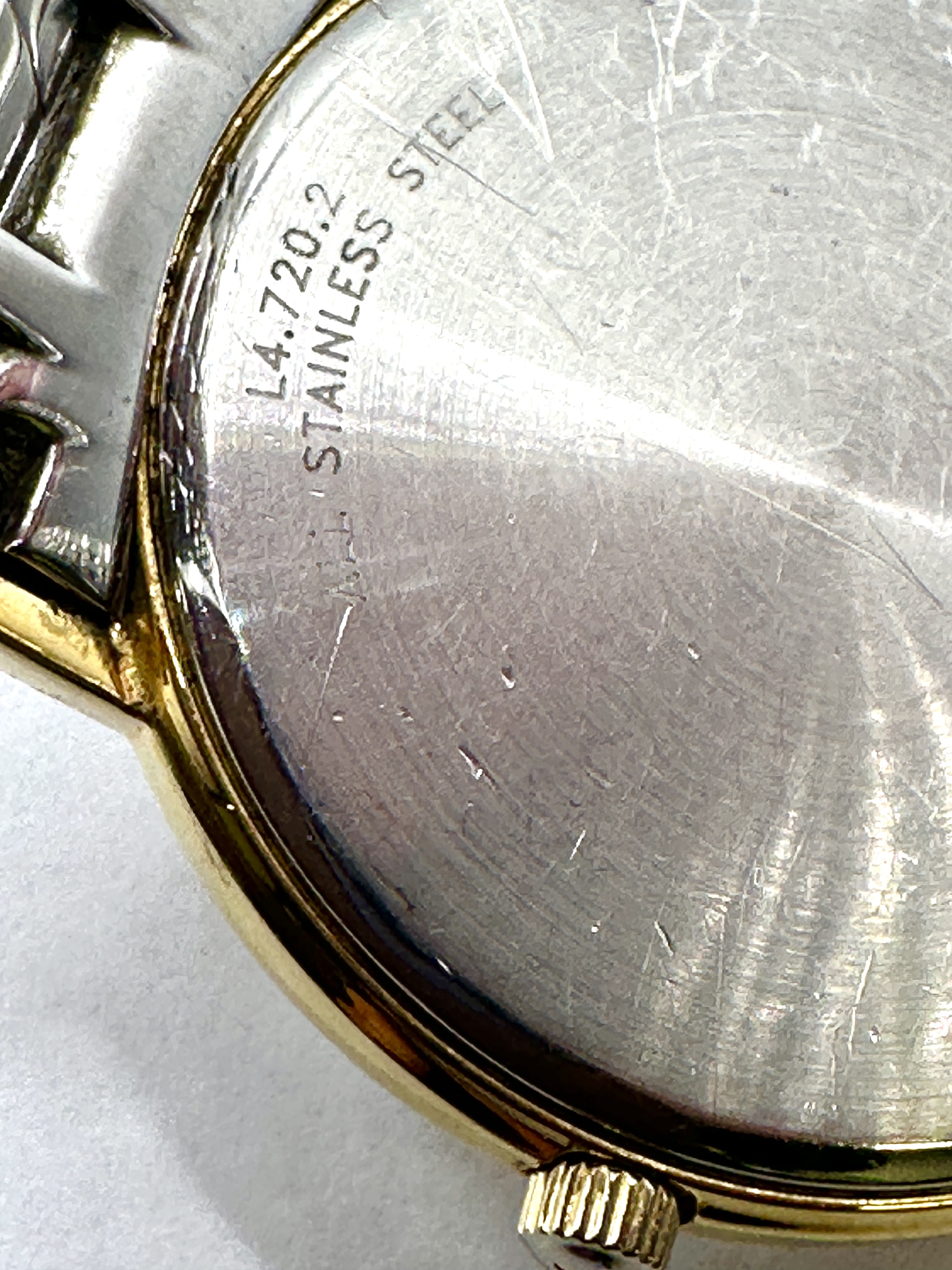 The watch exhibits signs of wear consistent with age and use. There are visible surface scratches across the case back and minor thinning of the gold plating on several bracelet links. The movement is currently untested and the battery condition is unknown.