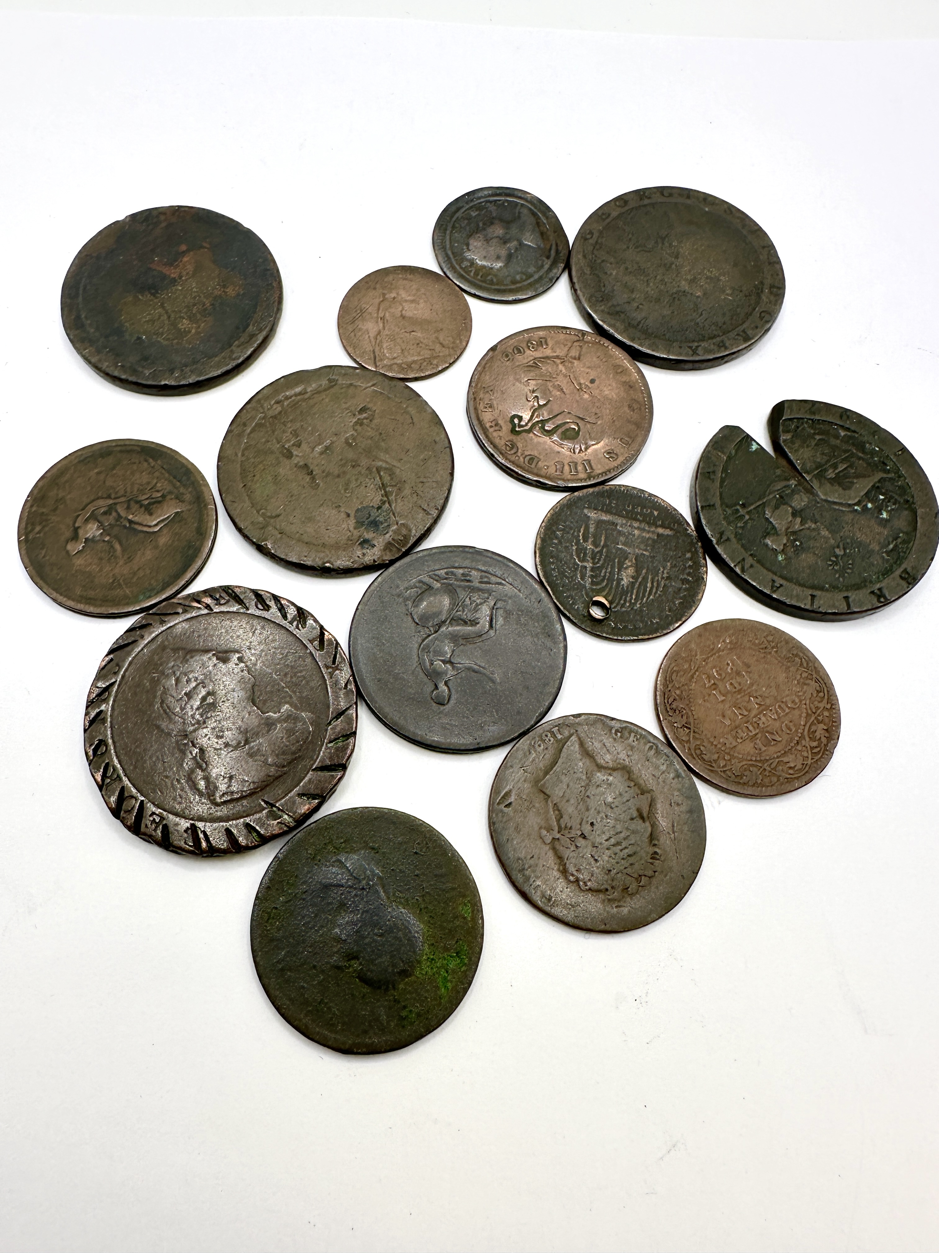 A collection of copper-alloy coins and tokens, primarily UK and British Colonial issues. The group includes a British India one-quarter anna dated 1887, featuring a floral wreath reverse. Included is a George III copper coin dated 1806 with a laureate bust obverse. The lot contains a Princess Charlotte memorial type token, dated 6 November 1817, with a suspension hole. Several George III copper issues are present, including a Cartwheel type coin with a significant triangular segment removed and others featuring a Britannia reverse. One piece features an ornamental notched border and a worn central portrait. Visible legends on multiple items include GEORGIUS III D G REX. The 1797 Cartwheel issues represent the first British coins produced by steam-powered machinery at the Soho Mint.