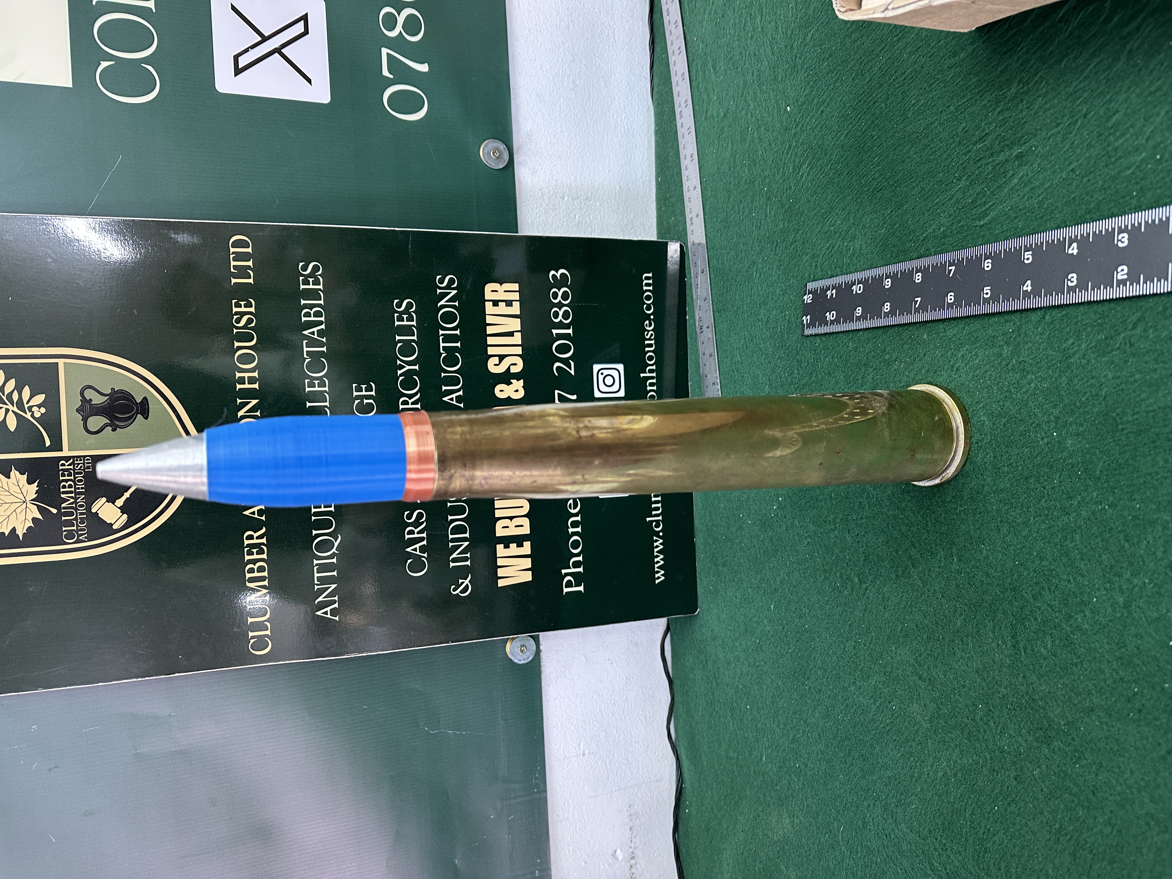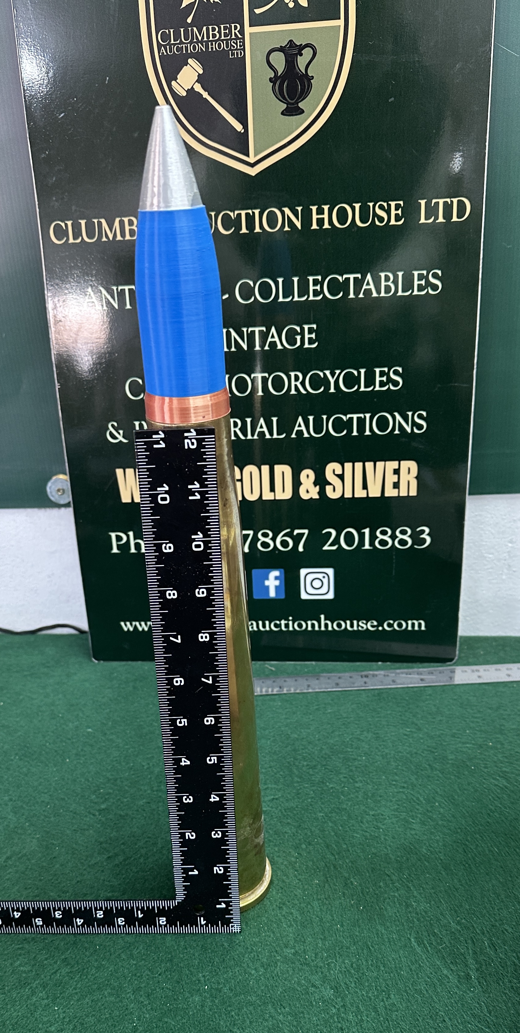 A Bofors 40mm round, The round consists of a projectile finished in blue paint, which is the standard international convention for practice ammunition, featuring a silver-coloured nose cone and a copper driving band. The projectile is seated within a long, tapered brass casing. No legible characters, symbols.