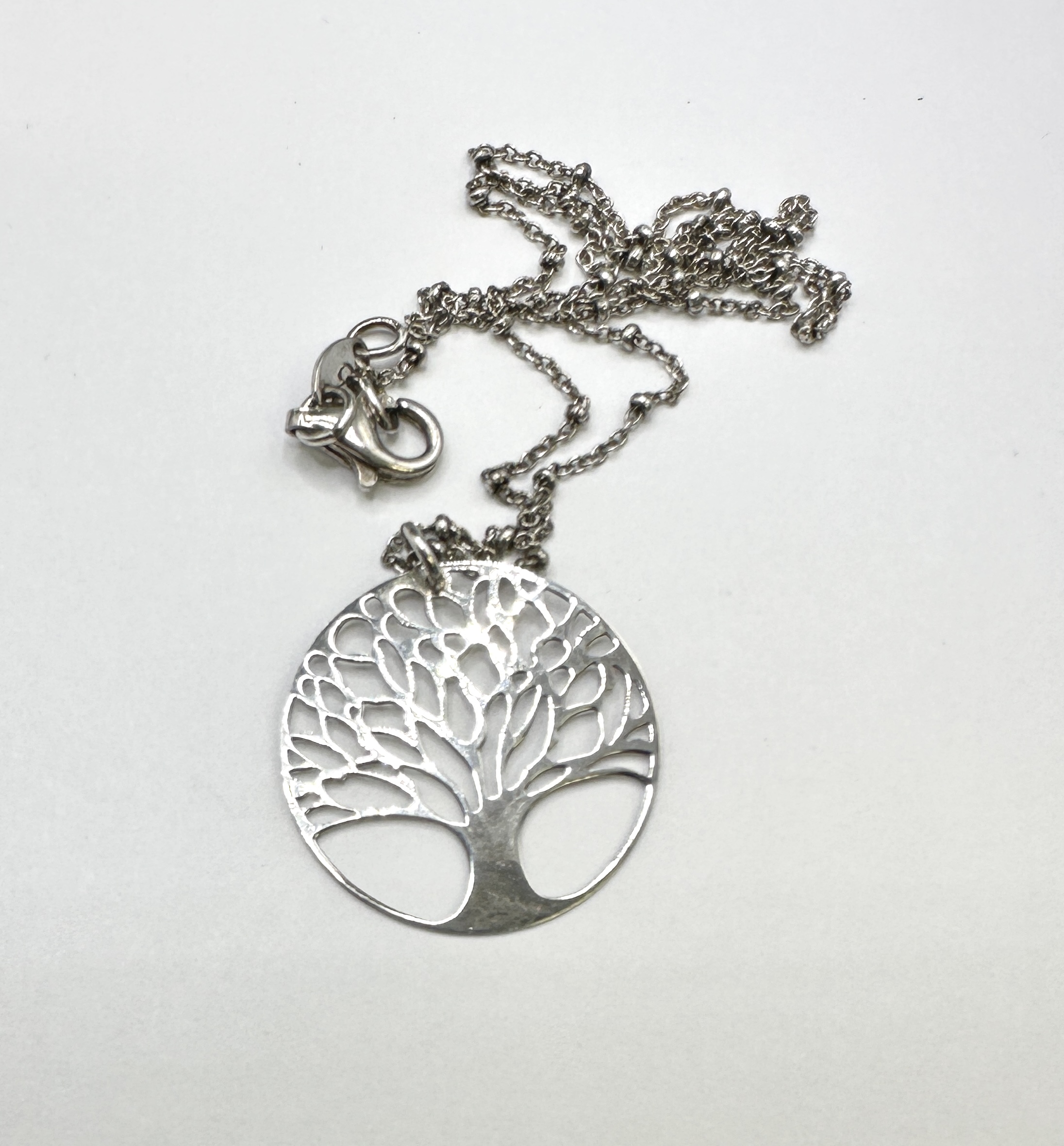 A 925 silver necklace featuring a circular pendant with a pierced openwork Tree of Life motif. The pendant is suspended from a satellite-style chain, comprising a trace link chain with integrated spherical bead stations at regular intervals. The necklace is secured with a lobster claw clasp.