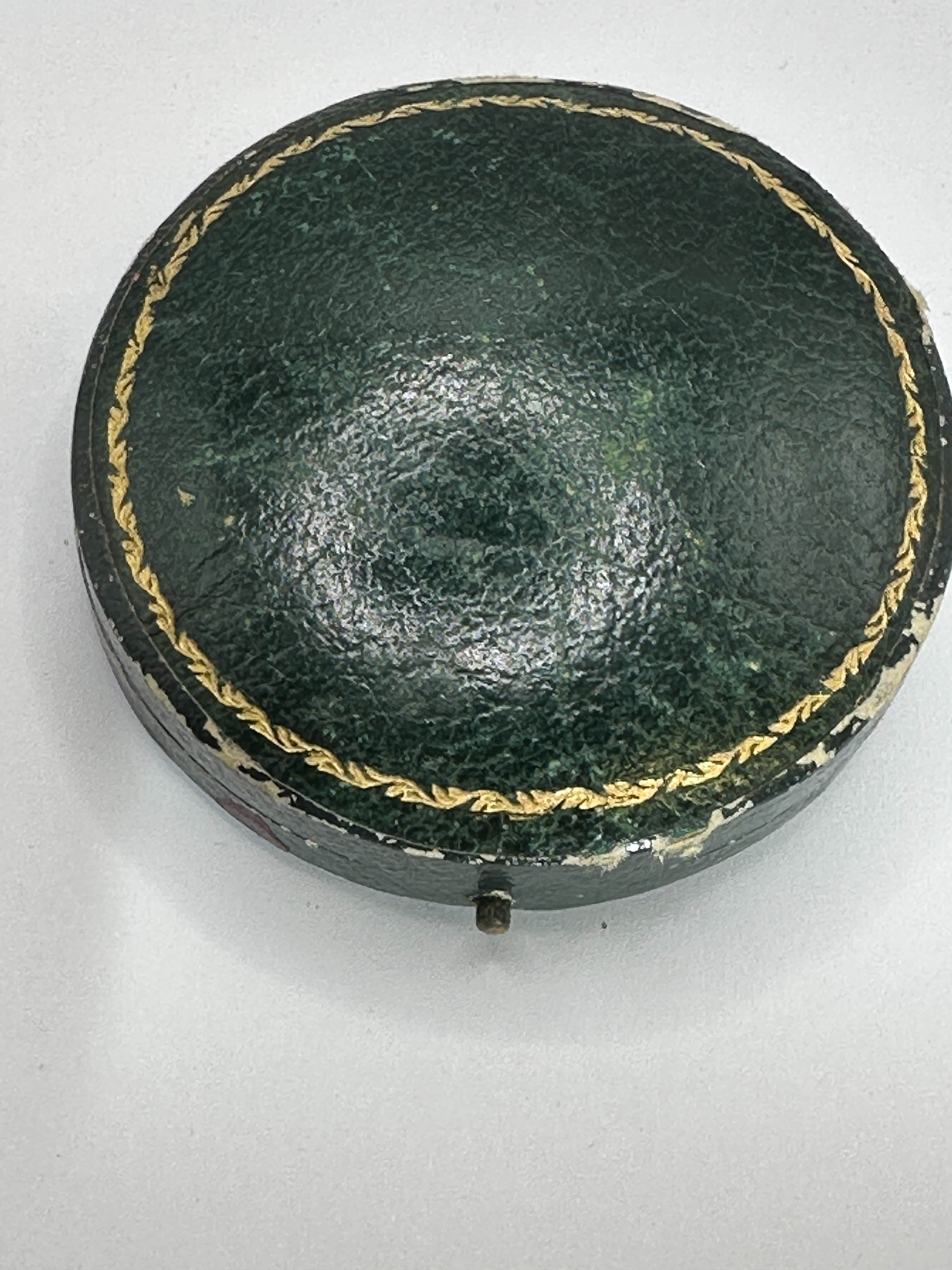 A set of six dress buttons of Edwardian style, constructed from 9 carat rose gold plated and mother-of-pearl. Each circular button features a polished white mother-of-pearl face set within a slim rose gold border. The centre of each face is decorated with a twisted rose gold wire cross-stitch motif. The reverse of each button is finished with a rose gold metal backing and a fixed eyelet loop. The set is accompanied by six brass-tone split pins for attachment to a garment. The collection is housed in an original fitted circular case with a dark green leatherette exterior, featuring a gold-tooled foliate border on the lid. The interior is lined with cream-coloured satin and velvet.