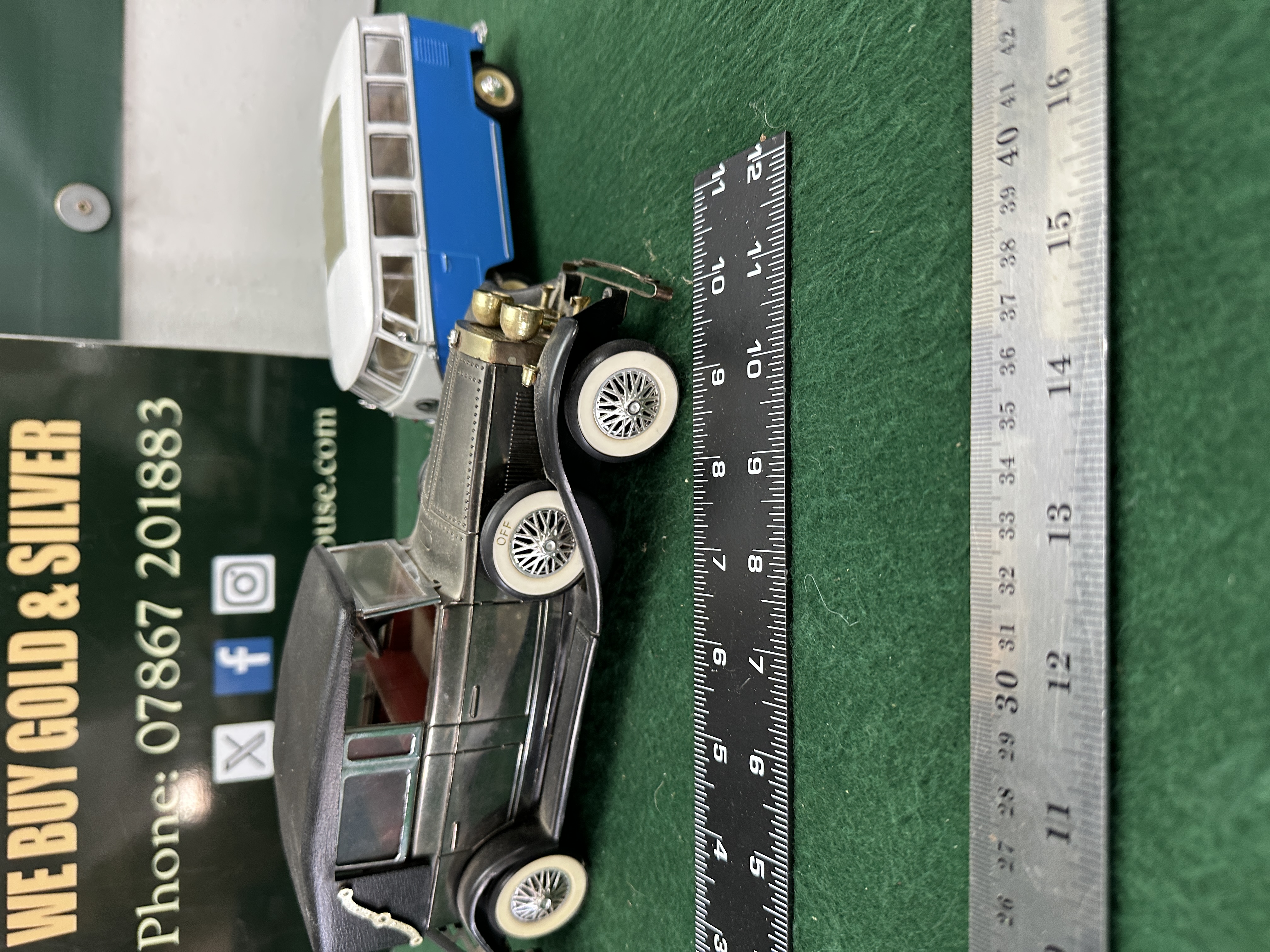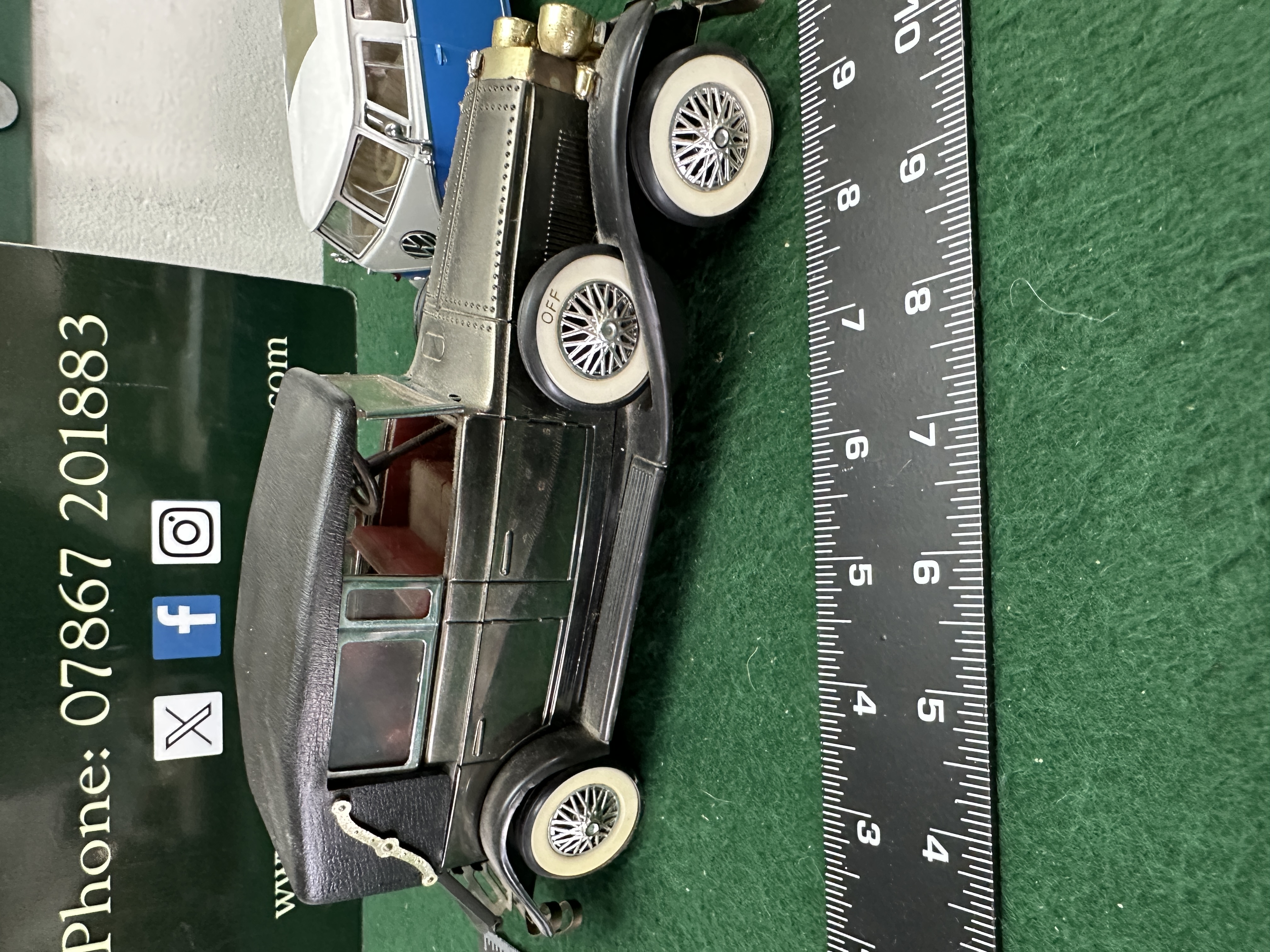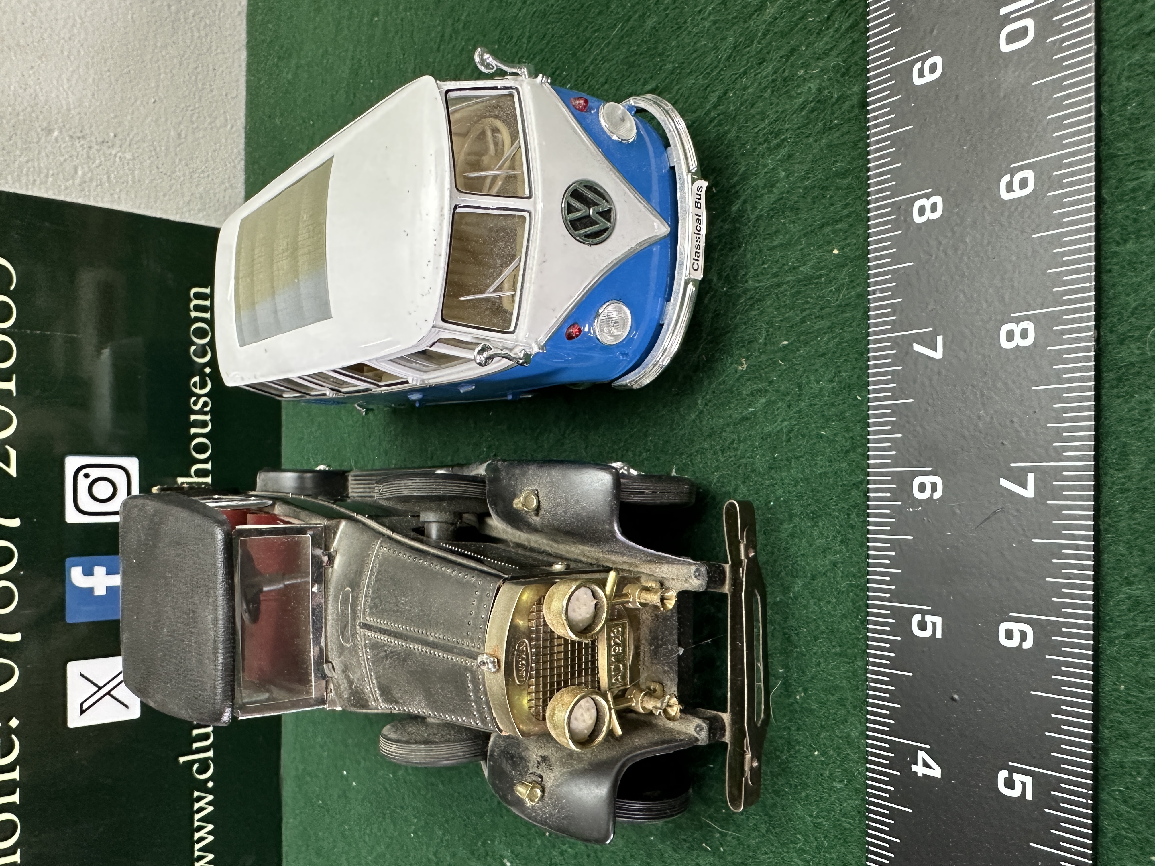 This lot consists of two model vehicles of different scales and construction. The first is a large-scale model of a 1928 Lincoln limousine, primarily constructed from tinplate and pressed steel. The vehicle features a black and grey body with a textured faux-leather effect roof and a red interior. Decorative components include brass-toned headlights and a radiator grille marked LINCOLN, with a front bumper plate reading AD 1928. The model is fitted with plastic tyres, including a side-mounted spare tyre marked with an OFF switch, indicating an internal battery-operated or clockwork mechanism. The second item is a die-cast metal model of a Volkswagen Type 2 Microbus, finished in a two-tone blue and white colour scheme. It features plastic windows, trim, and a front license plate marked Classical Bus. The front of the bus bears the circular VW logo.