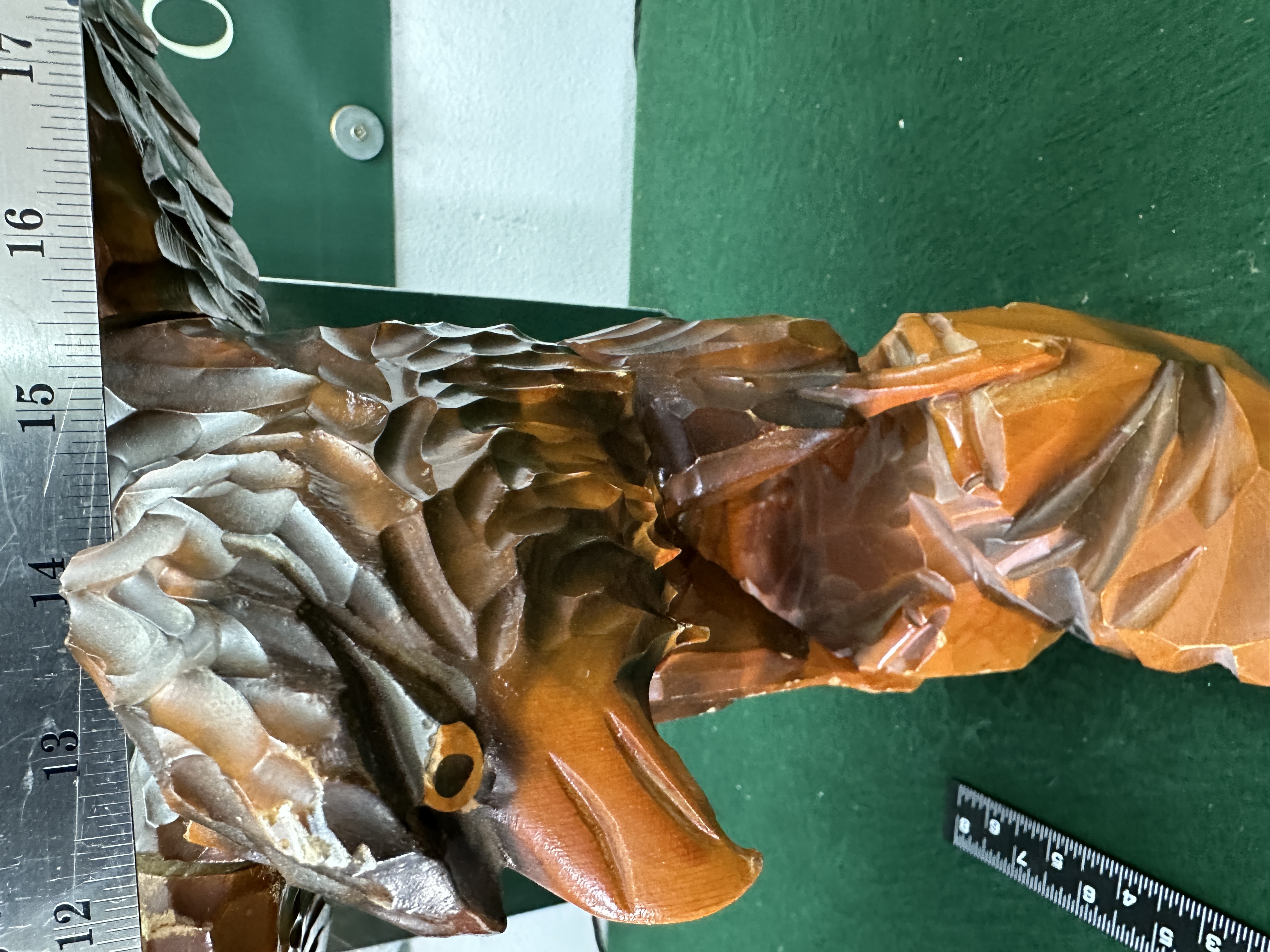 A large hand-carved wooden sculpture depicting an eagle with wings outstretched, perched upon a craggy rock-form base. The figure is executed in a rustic, faceted style with prominent chisel marks defining the feathers, talons, and head. The wood is finished in a multi-toned brown stain, highlighting the textured surface. The wings are separate components attached to the central body. No maker’s marks or signatures are visible.