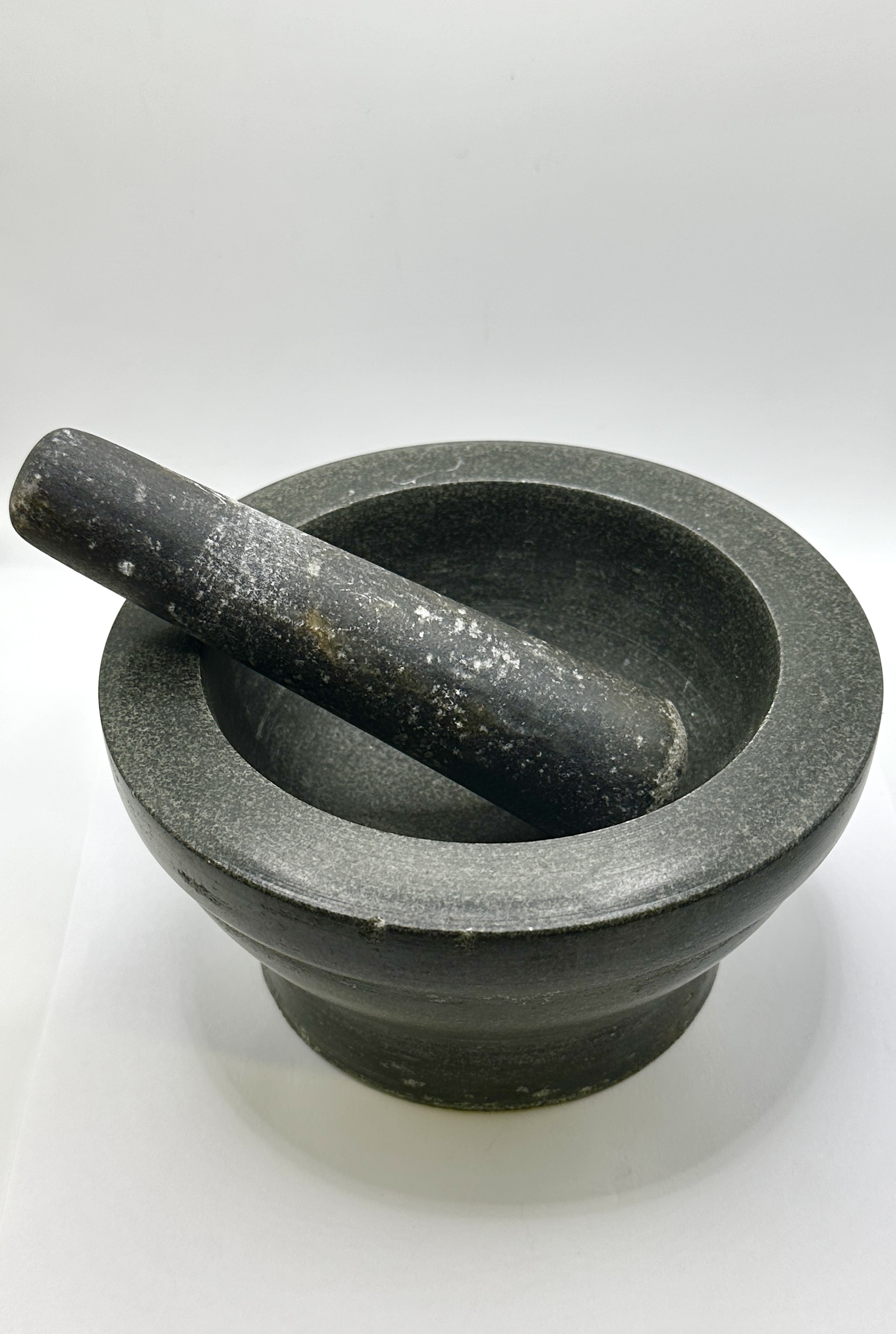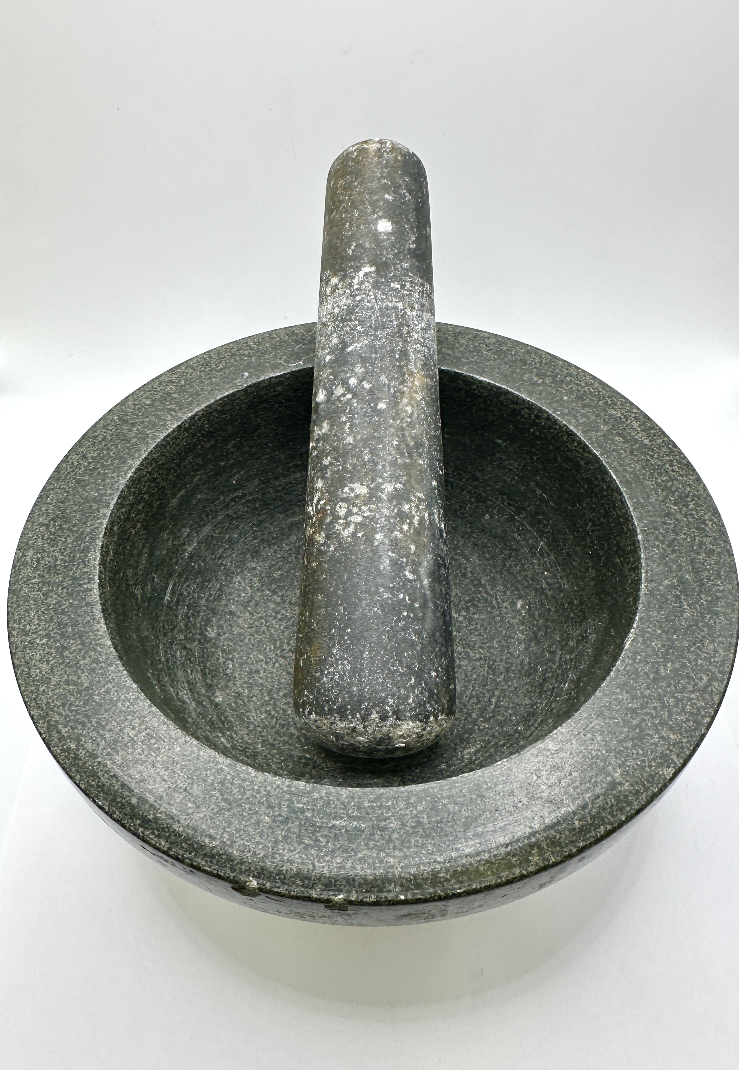 The mortar shows small chips to the outer edge of the rim. The pestle exhibits surface residue and pitting consistent with previous use.