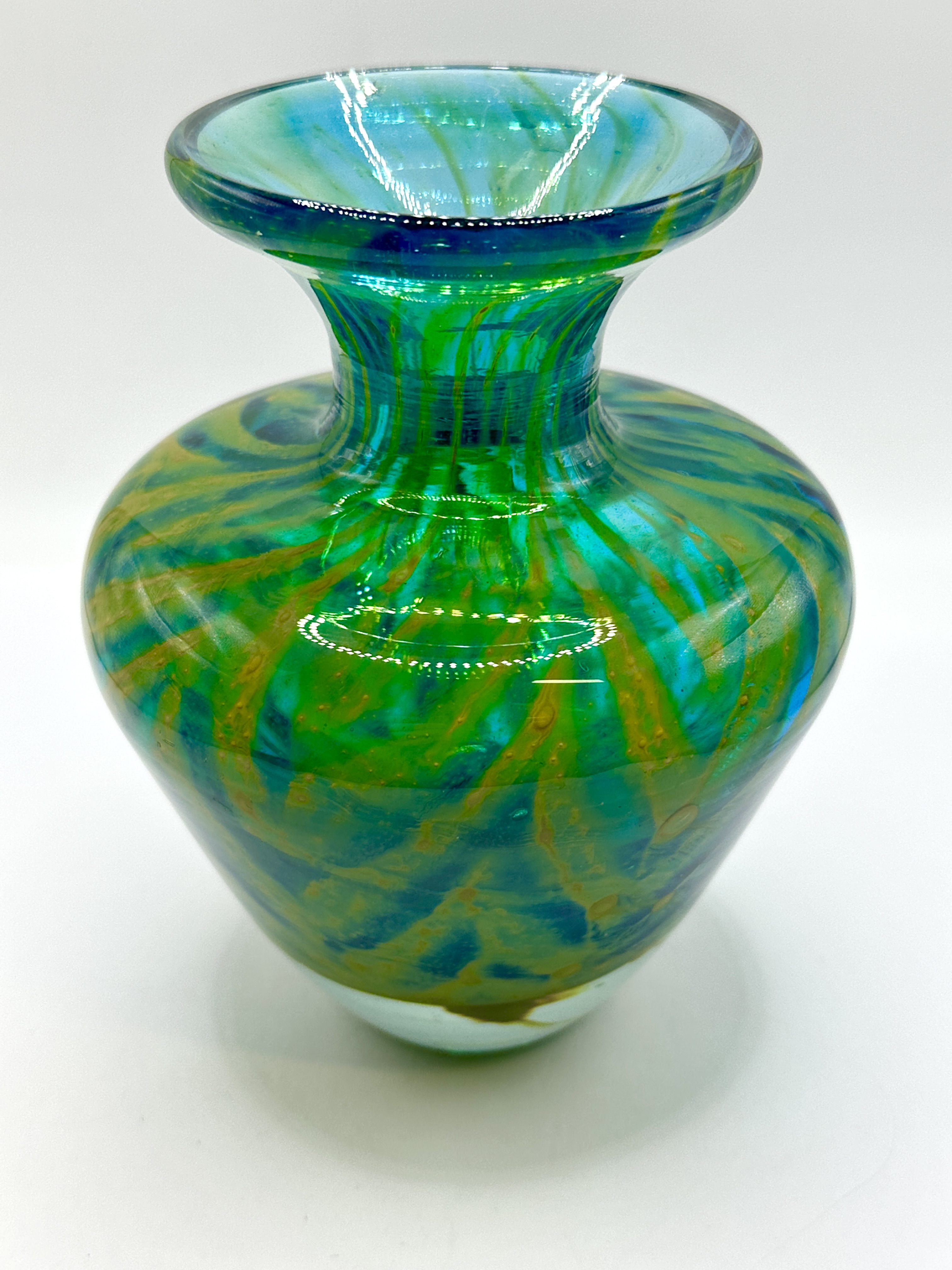 A contemporary studio art glass vase attributed to Mdina Glass, featuring a pattern consistent with the Crystal Blue Stripe range. The vessel is designed with a squat, bulbous body tapering to a narrow base and rising to a flared rim. It is constructed from translucent glass with a pulled pattern of swirling green, turquoise, and amber tones throughout. No maker marks or inscriptions are visible on the exterior of the vessel.