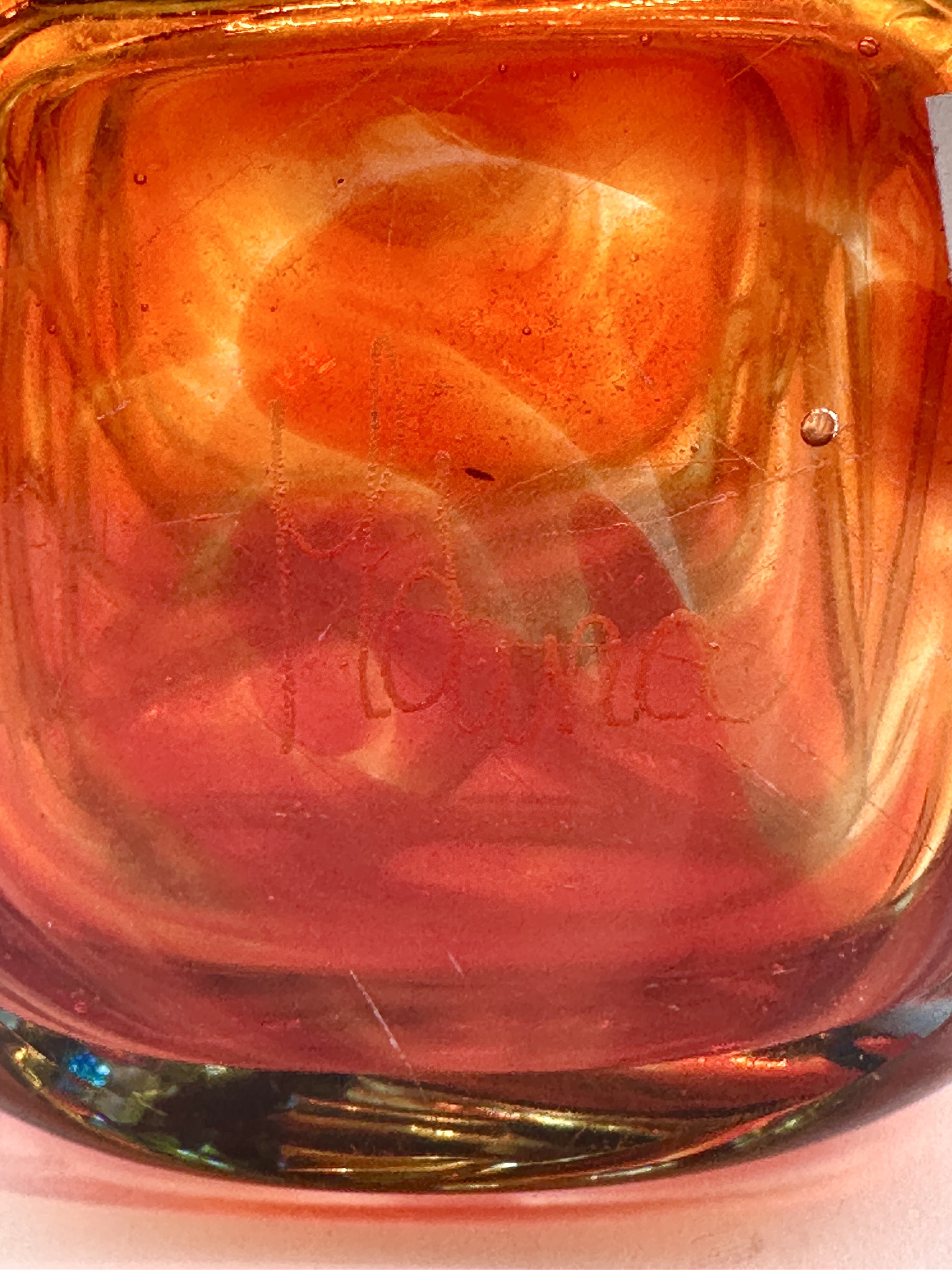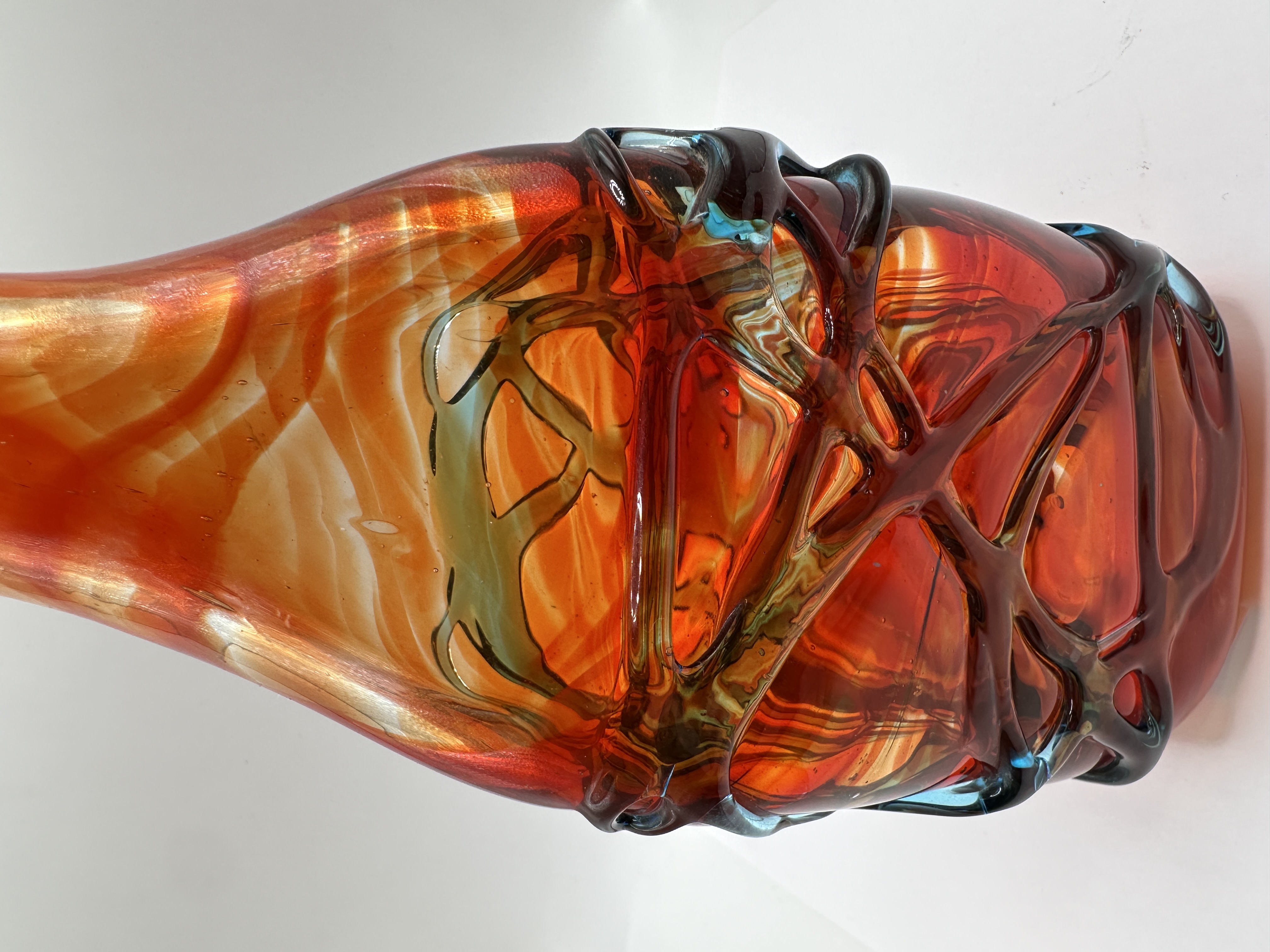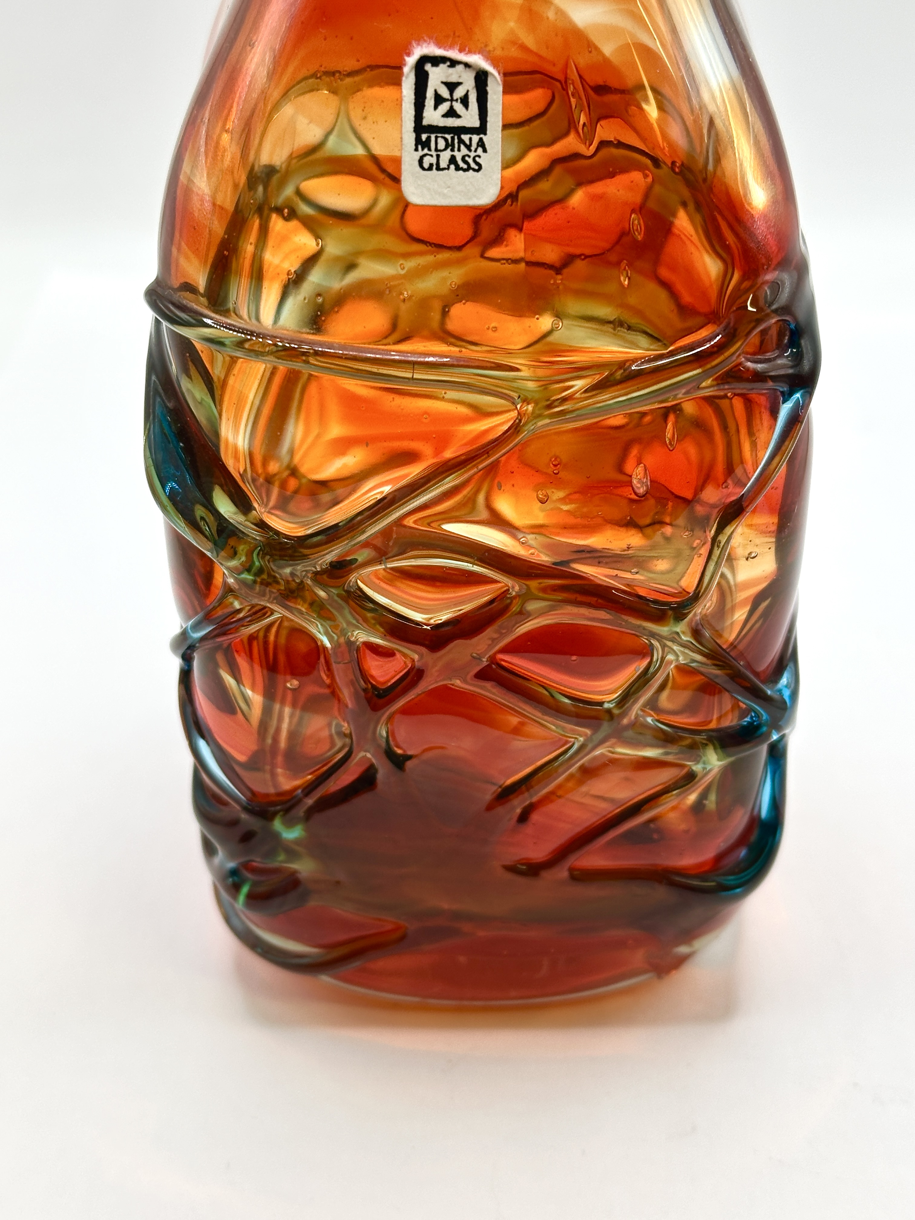 An Mdina studio glass vase of slender form featuring a flared rim and a bulbous body. The vessel is constructed with internal swirls of red, orange, and amber glass. The exterior surface is decorated with applied dark turquoise glass trailing in a web-like pattern. The base bears an incised signature for Mdina. The shoulder of the vase retains an original paper label featuring a Maltese cross above the text MDINA GLASS.