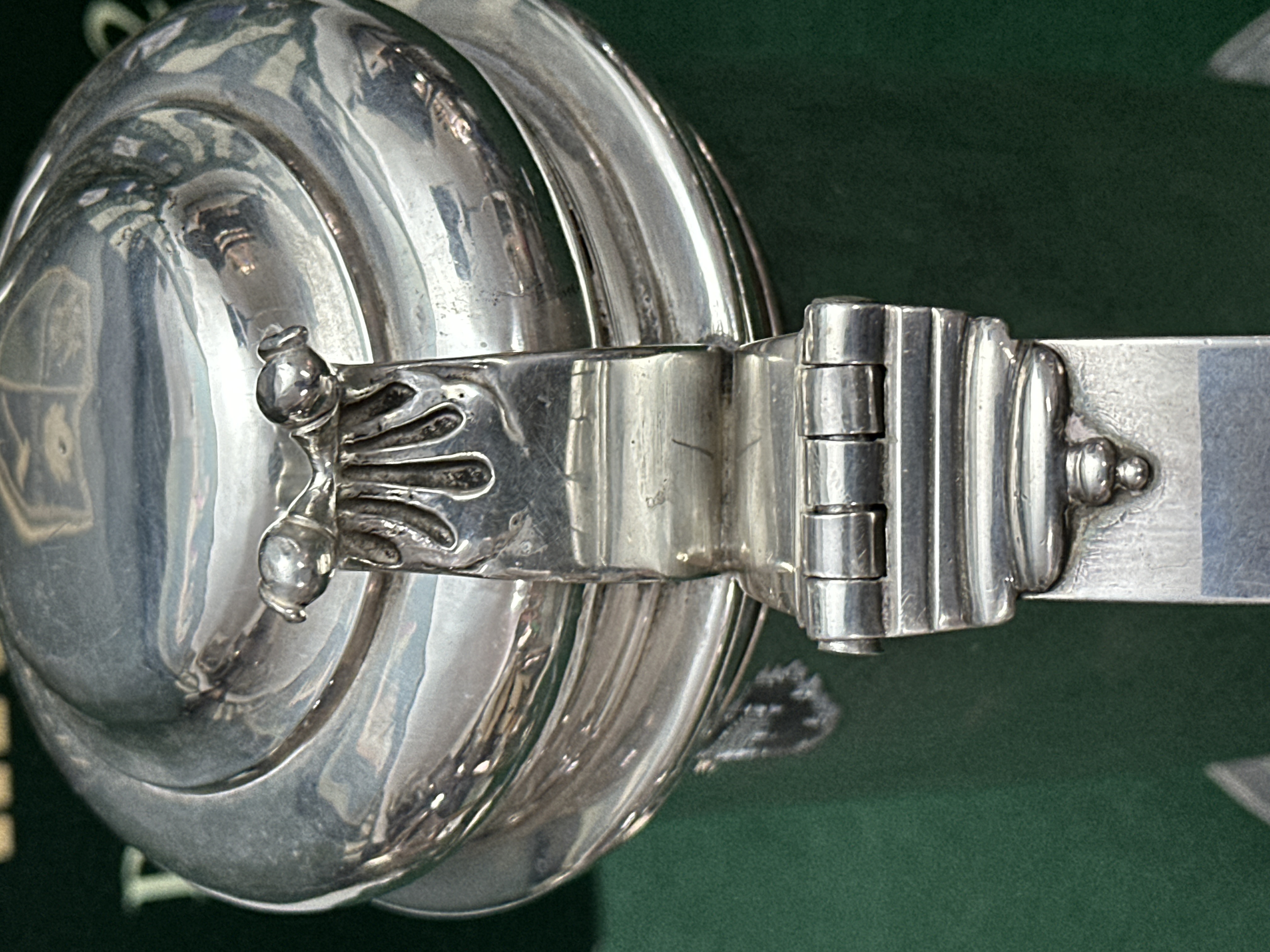A George II lidded tankard by Richard Bayley, constructed from 925 silver. This vessel, dating from the reign of King George II, features a tapering cylindrical body and a tiered, domed cover with an ornate scrolled thumbpiece. The tankard is equipped with a substantial S-scroll handle terminating in a heart-shaped shield and stands on a widely flared, moulded circular base. The lid is engraved with a faint armorial crest. A set of hallmarks is struck to the interior of the lid and the body, including the lion passant, the leopard’s head for London, the maker’s mark RB for Richard Bayley, and the date letter A for 1736.