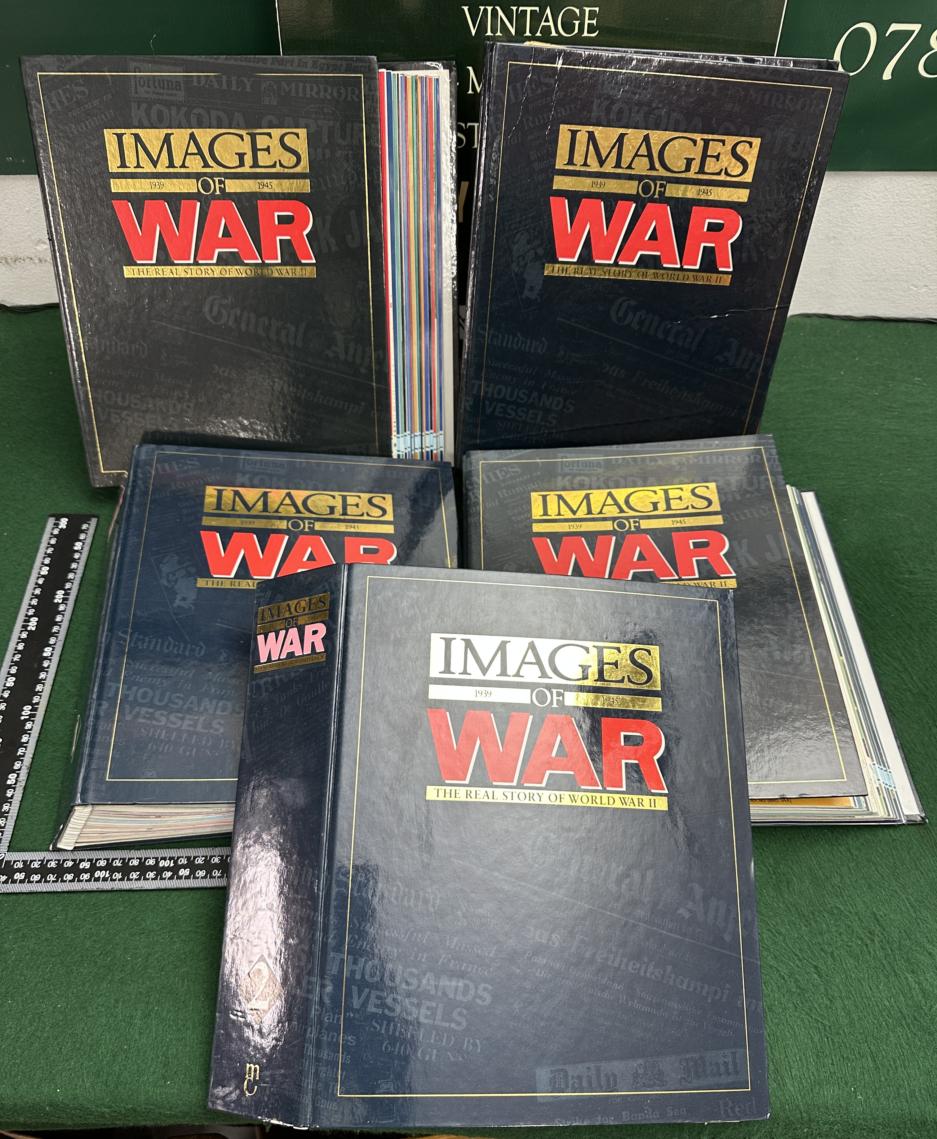 A collection of hardcover binders titled Images of War: The Real Story of World War II, published by Marshall Cavendish. The binders are finished in dark blue with red and gold typography, featuring a background of ghosted period newspaper headlines from publications such as the Daily Mail. These volumes contain multiple issues of a serialised magazine publication detailing the events of the Second World War between 1939 and 1945. The magazines are held within internal ring-binder mechanisms and feature various coloured spines. The Marshall Cavendish monogram is visible to the lower left corner of the binder covers.