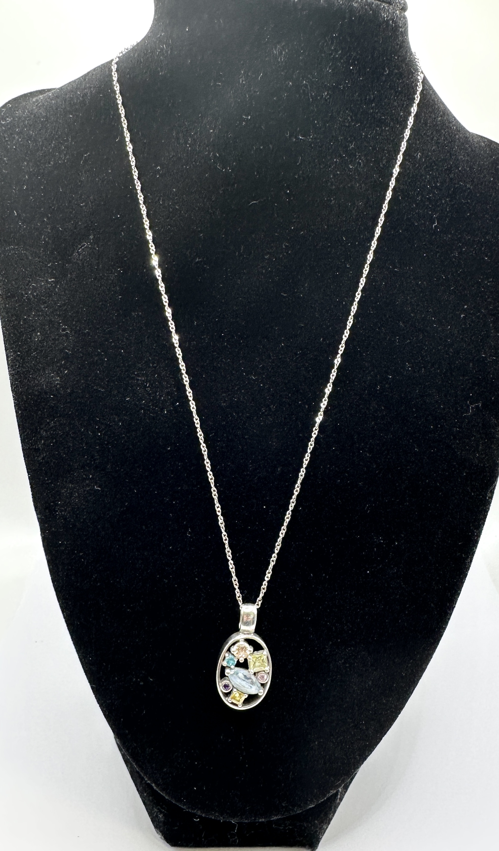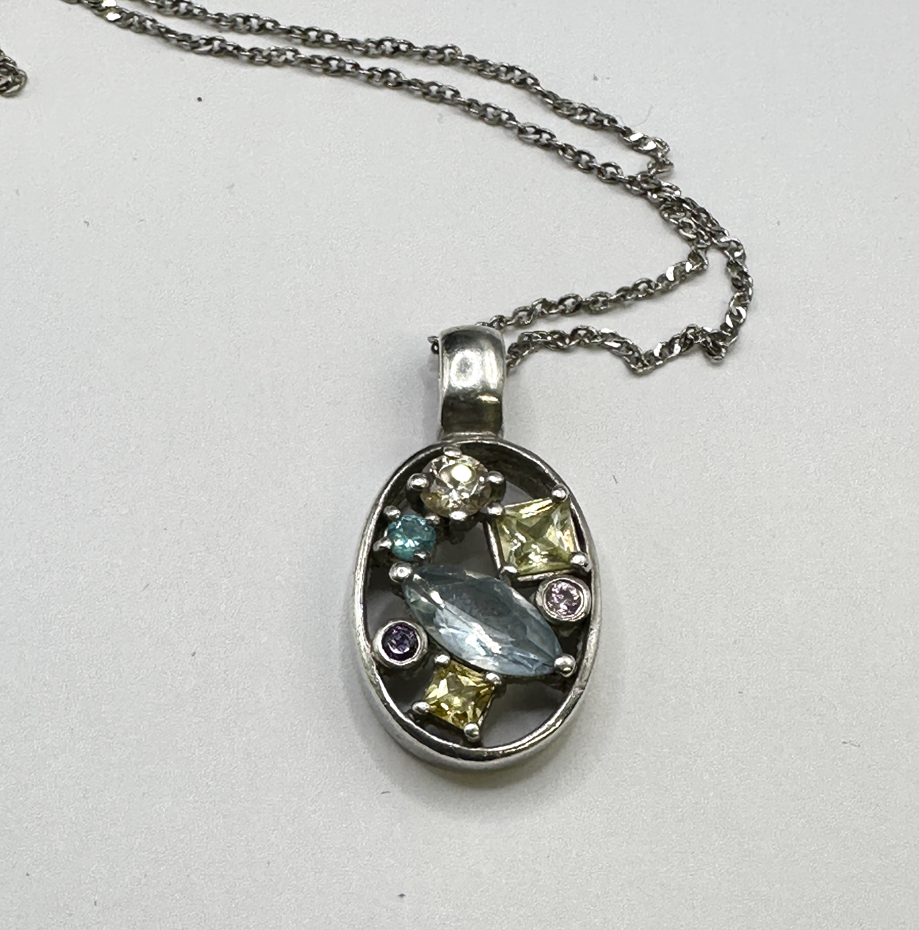 This 925 silver necklace features a pendant in the Paparazzi Easter Basket Brilliance pattern. The jewellery comprises a fine trace-link chain and a detachable pendant suspended from a polished tapered bale. The pendant is designed with an oval openwork frame housing an asymmetrical cluster of multi-coloured gemstones. The arrangement includes a central marquise-cut light blue gemstone, two square-cut stones in yellow and light green hues, and four small round-cut stones in purple, pink, teal, and white. No hallmarks or maker’s marks are visible on the metal components.