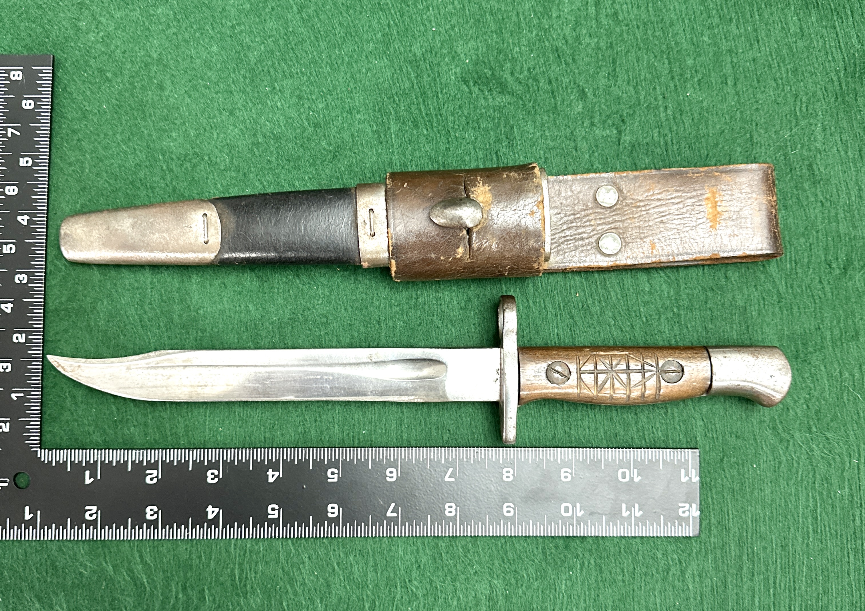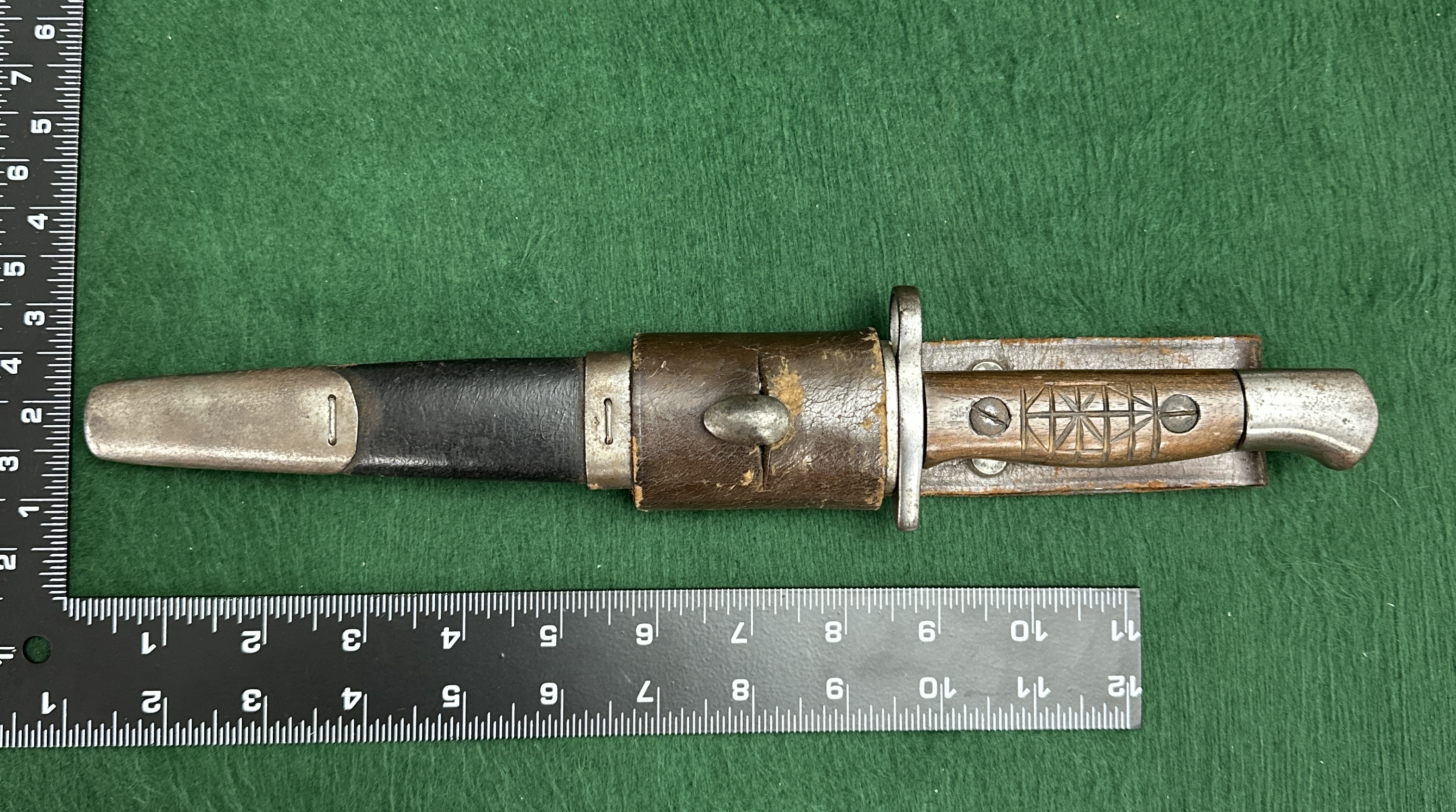 A military-style bayonet, in the style of a German pattern short dress bayonet, likely dating from the mid-20th century. The item features a single-edged steel blade with a fuller and a clip-point tip. The hilt consists of a metal crossguard and a rounded pommel with a mounting mechanism, fitted with wooden grips secured by two screws. One side of the wooden grip has been hand-carved with a geometric starburst or cross-hatched motif, suggesting personal modification or trench art. The metal scabbard has a darkened finish with a metallic locket and chape. The assembly is completed by a brown leather frog.