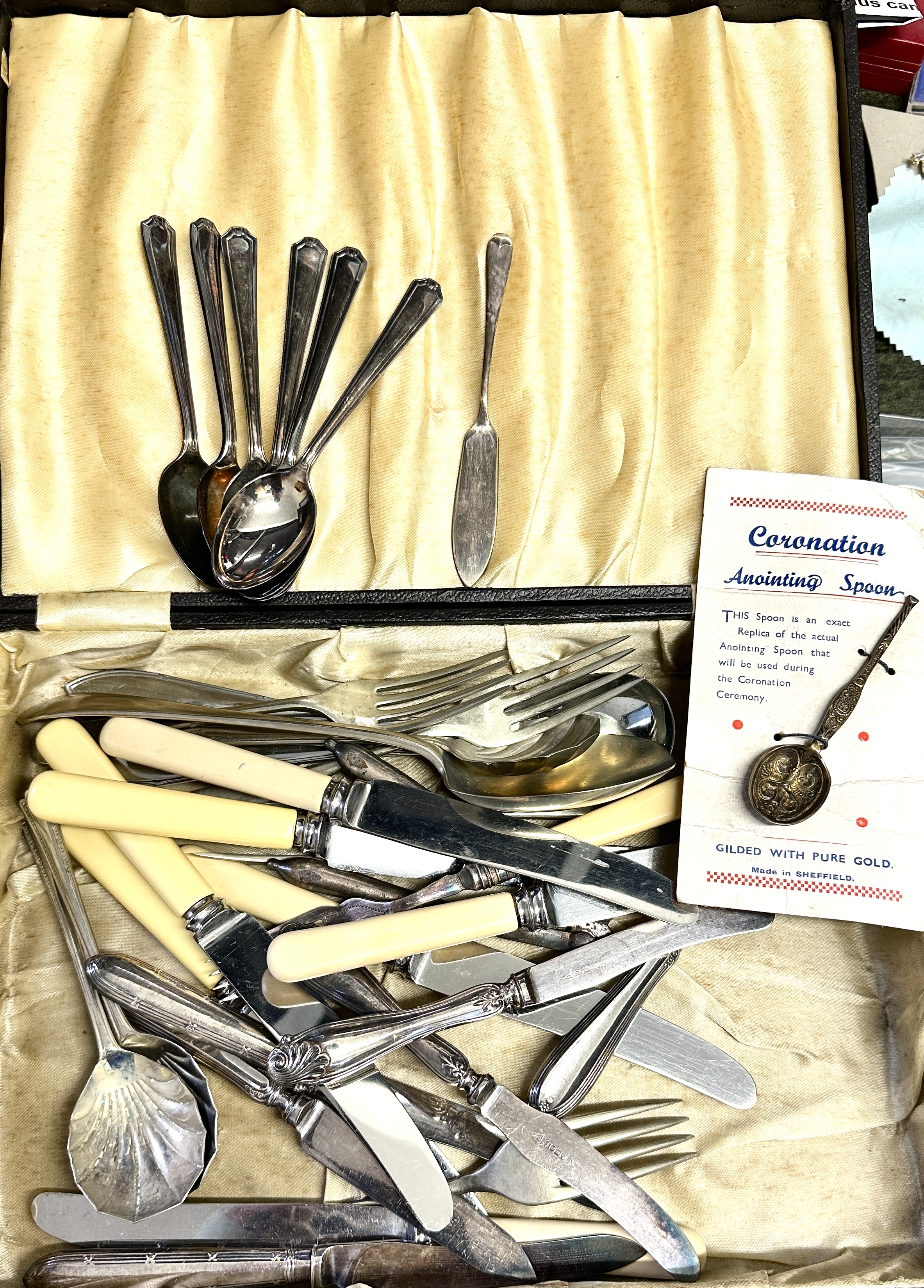 An assortment of silver-plated and stainless steel flatware, including various spoons, forks, and knives. The collection features several knives with cream-coloured bone or synthetic handles and a variety of patterns, such as a shell-motif spoon and faceted handle designs. Included is a replica Coronation Anointing Spoon, gilded with pure gold and manufactured in Sheffield, which remains on its original printed backing card. The items are housed in a black pebbled-texture presentation case with a champagne-coloured satin lining.