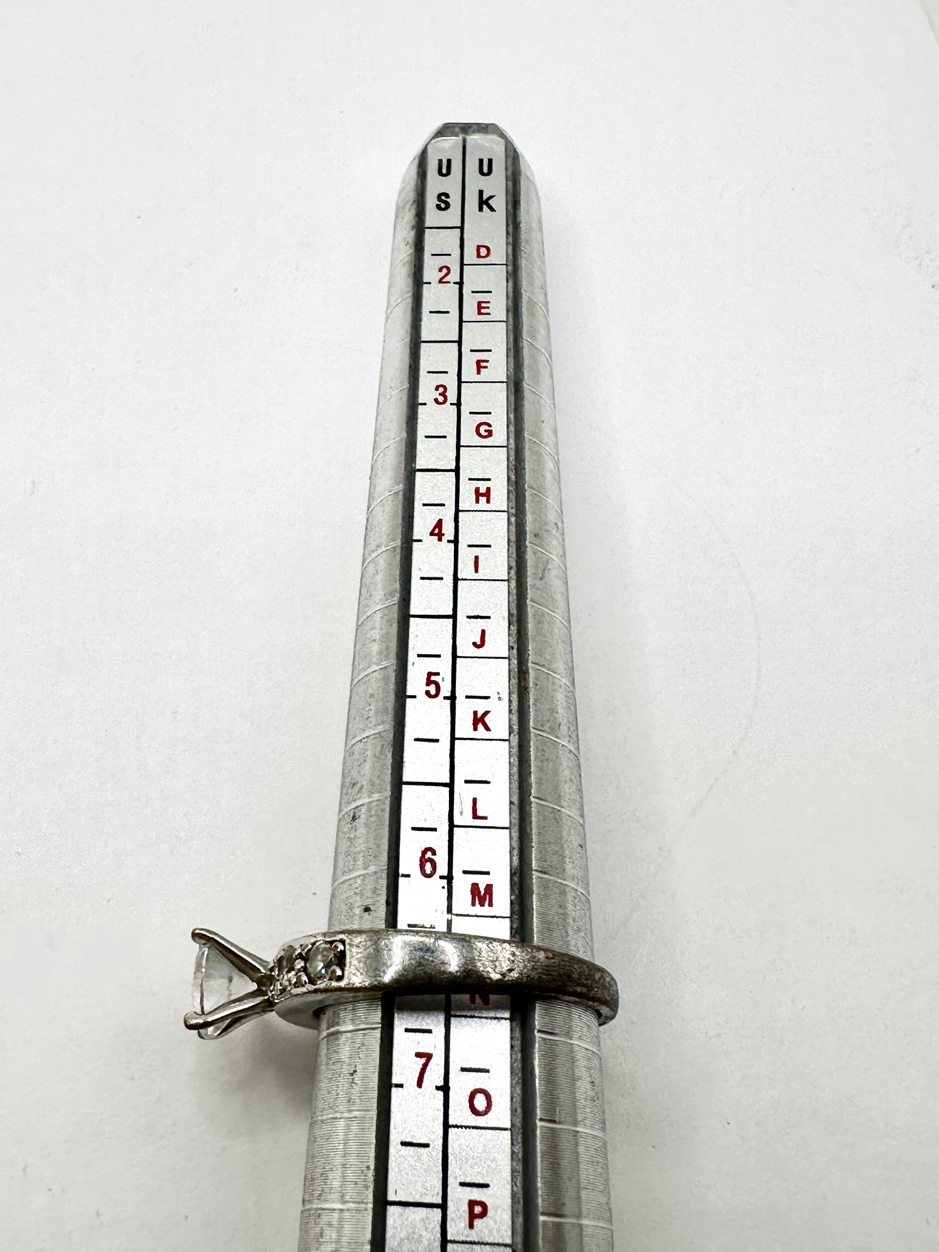 A 925 silver ring featuring a central round brilliant-cut colourless stone. The primary stone is secured in a four-prong setting, flanked by shoulders embellished with several smaller round-cut colourless accent stones. The band is of a simple design. No hallmarks or maker’s marks are visible in the provided images.