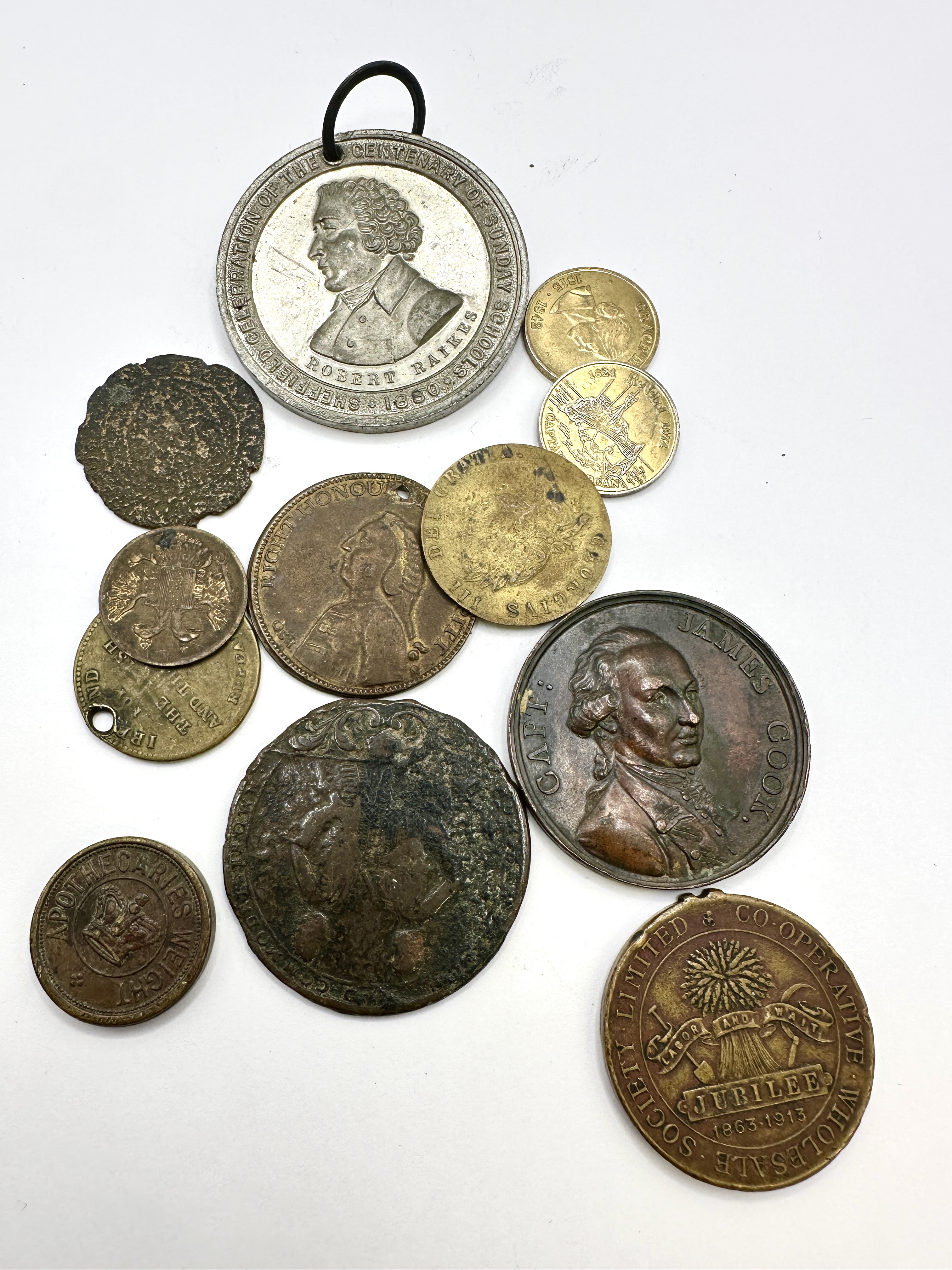 Items range in condition from fine to heavily corroded. The Robert Raikes medal shows surface marks and toning. The Captain James Cook medal exhibits significant verdigris and oxidation on the reverse. The CWS medal shows moderate wear and toning. Several smaller tokens and coins are heavily worn, corroded, or exhibit significant verdigris and loss of detail. One token is pierced.