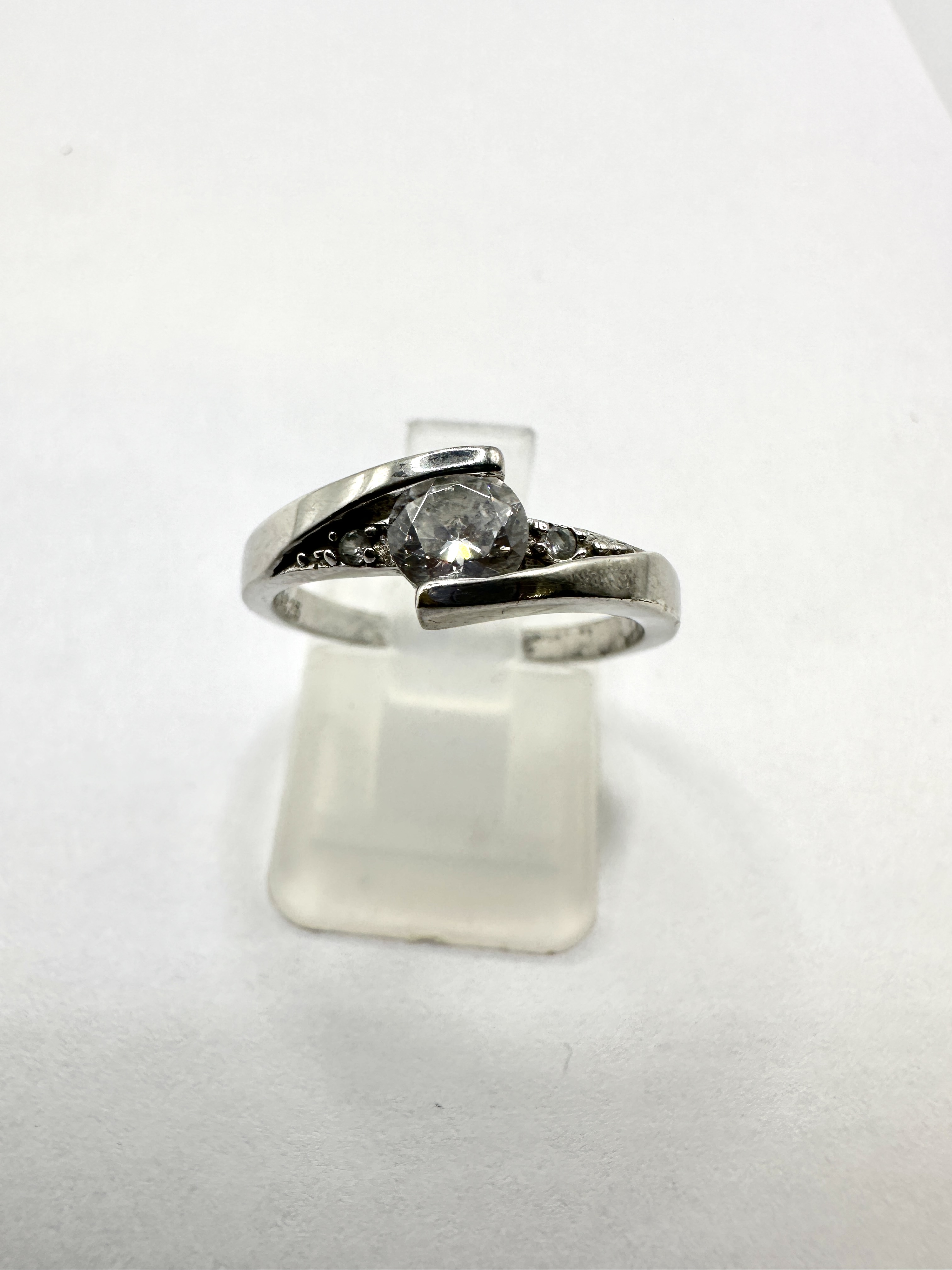 A contemporary bypass-style ring crafted from a silver 925 The design features a central round brilliant-cut clear stone secured within the overlapping ends of the band. The shoulders are accented with several smaller inset round clear stones.