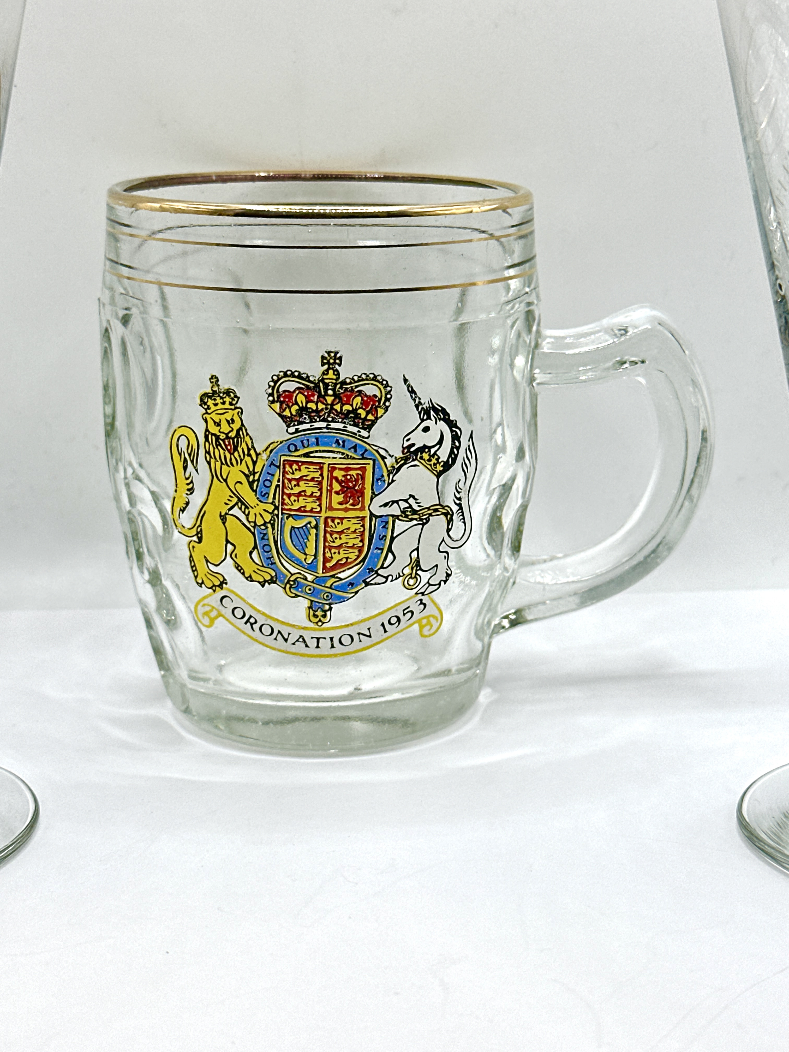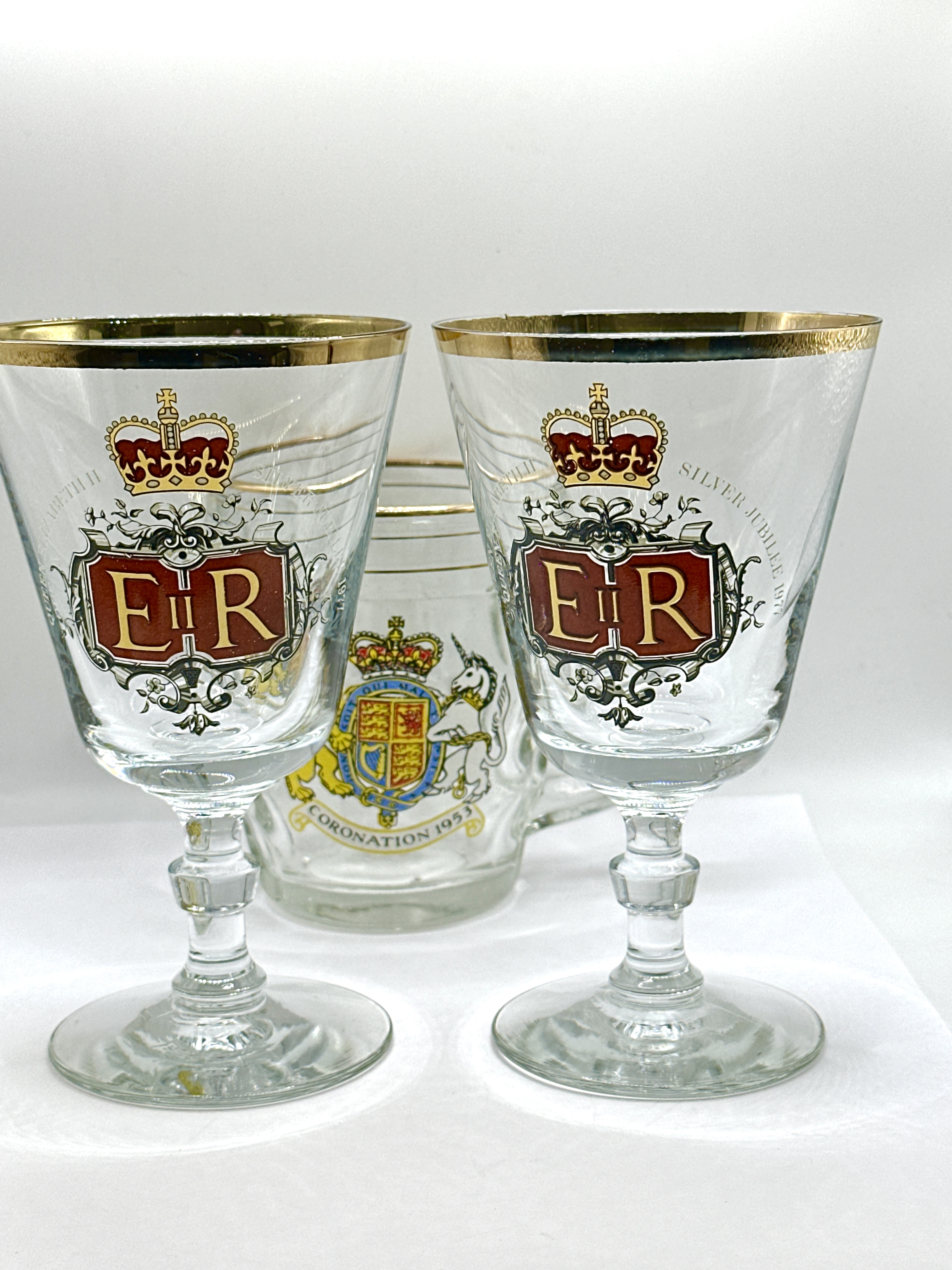 Three British royal commemorative glass items comprising two stemmed goblets and one handled mug. The two goblets commemorate the 1977 Silver Jubilee of Queen Elizabeth II and are attributed to Ravenhead. They feature clear glass bodies with gilt-decorated rims and are printed with the royal EIIR cypher beneath a crown, inscribed QUEEN ELIZABETH II SILVER JUBILEE 1977. The goblets are designed with a knopped stem and circular foot. The handled mug commemorates the 1953 Coronation, displaying the Royal Coat of Arms of the United Kingdom in polychrome above a banner marked CORONATION 1953. The mug is constructed of clear moulded glass with a gilt rim and horizontal gilt bands.