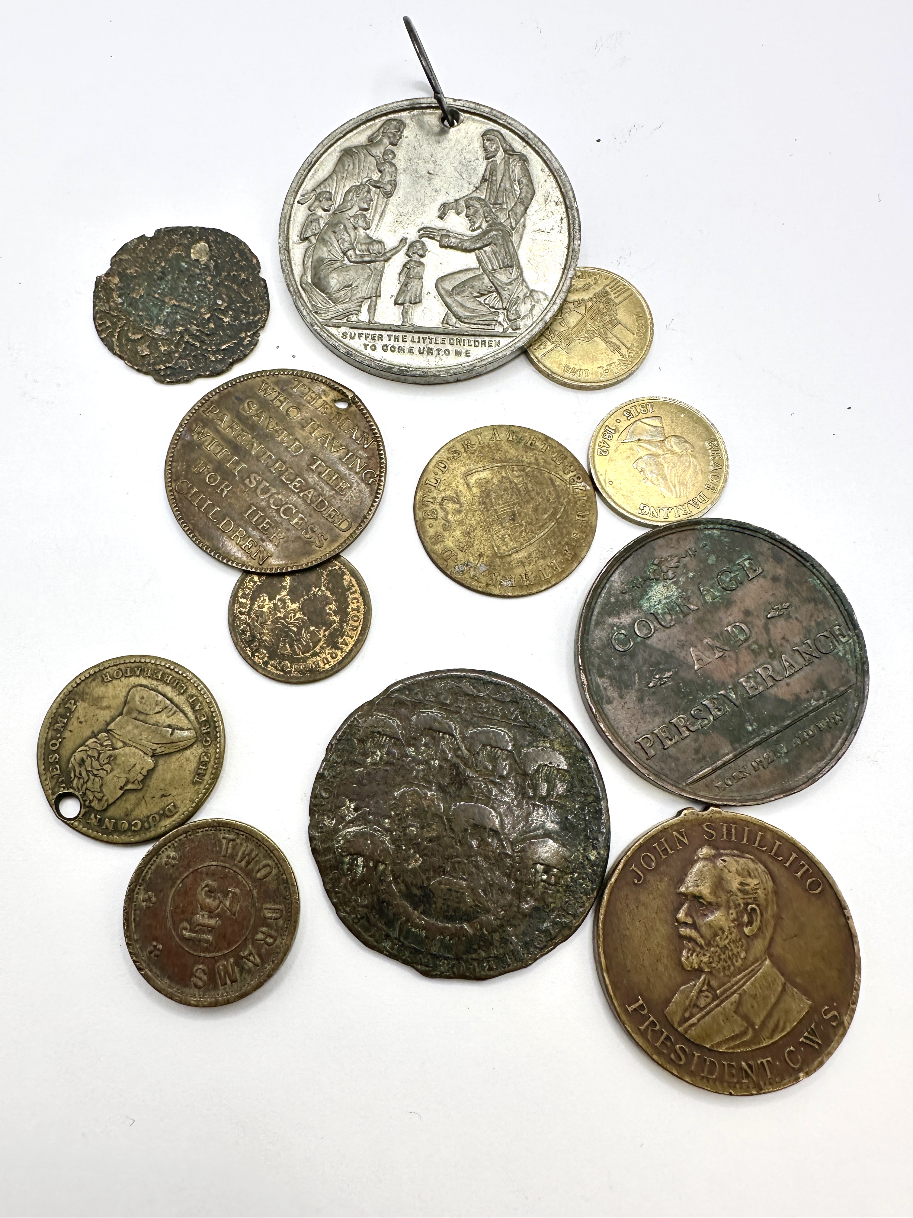 Condition ranges from poor to good. The Sheffield Sunday School medal is pierced for suspension with an attached ring. The Daniel O\'Connell token is also pierced. Several copper-alloy pieces exhibit heavy oxidation, surface corrosion, and significant wear. The Captain Cook and C.W.S. medals show moderate surface wear and toning.