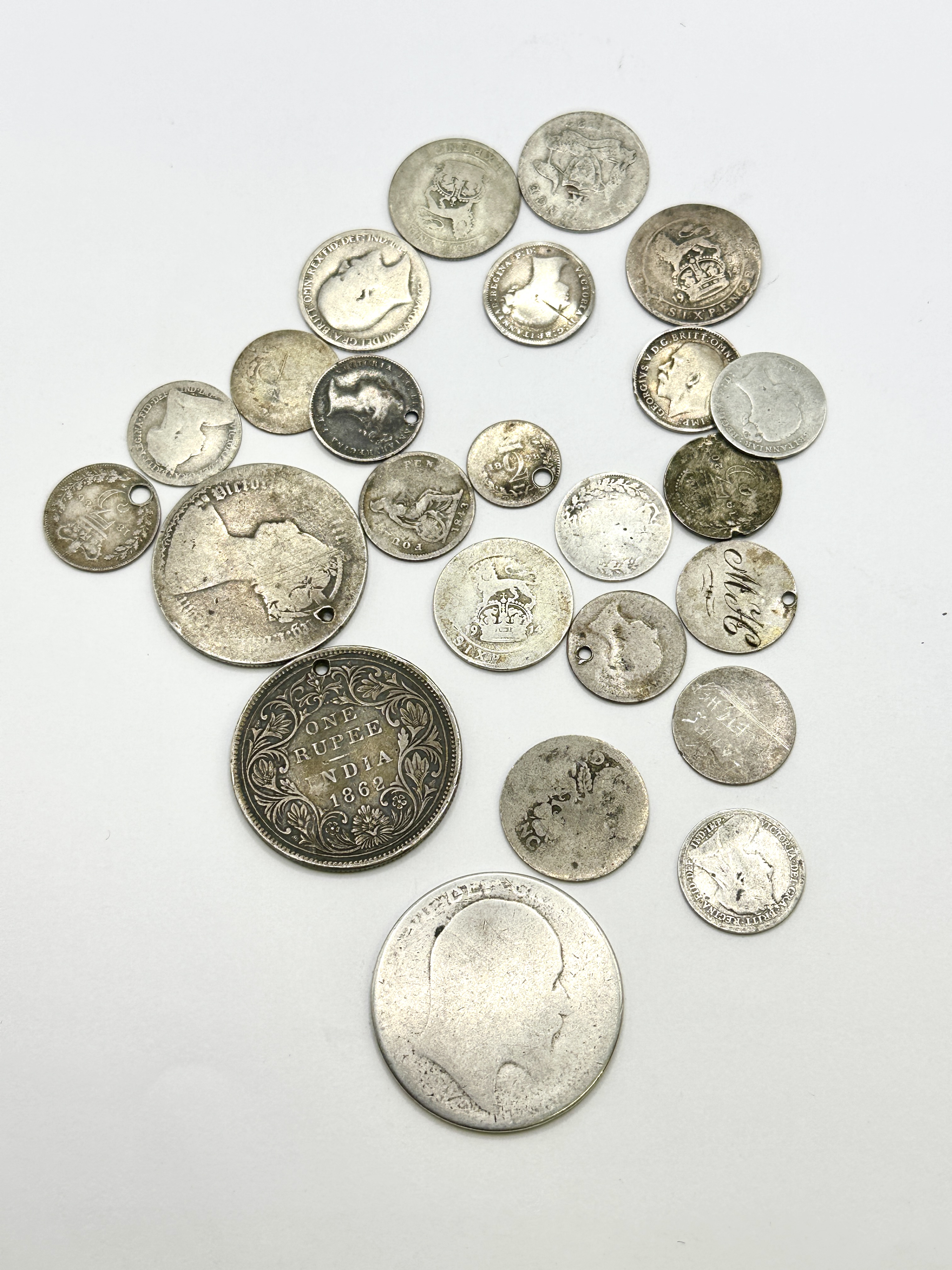 A collection of British and British Colonial coinage, predominantly struck in silver. The group includes a British India One Rupee dated 1862 with a floral wreath reverse and a British silver fourpence dated 1843 featuring a seated Britannia reverse. Other denominations present include sixpences and threepences. Obverses feature portraits of Queen Victoria in young, jubilee, and veiled head variations, as well as Edward VII and George V. Notable items include a large, heavily worn silver-coloured disk with a central circular stamp depicting the Victoria Regina VR cypher surmounted by a crown, and a silver disk engraved with the initials MH. Several pieces have been modified with circular piercings.