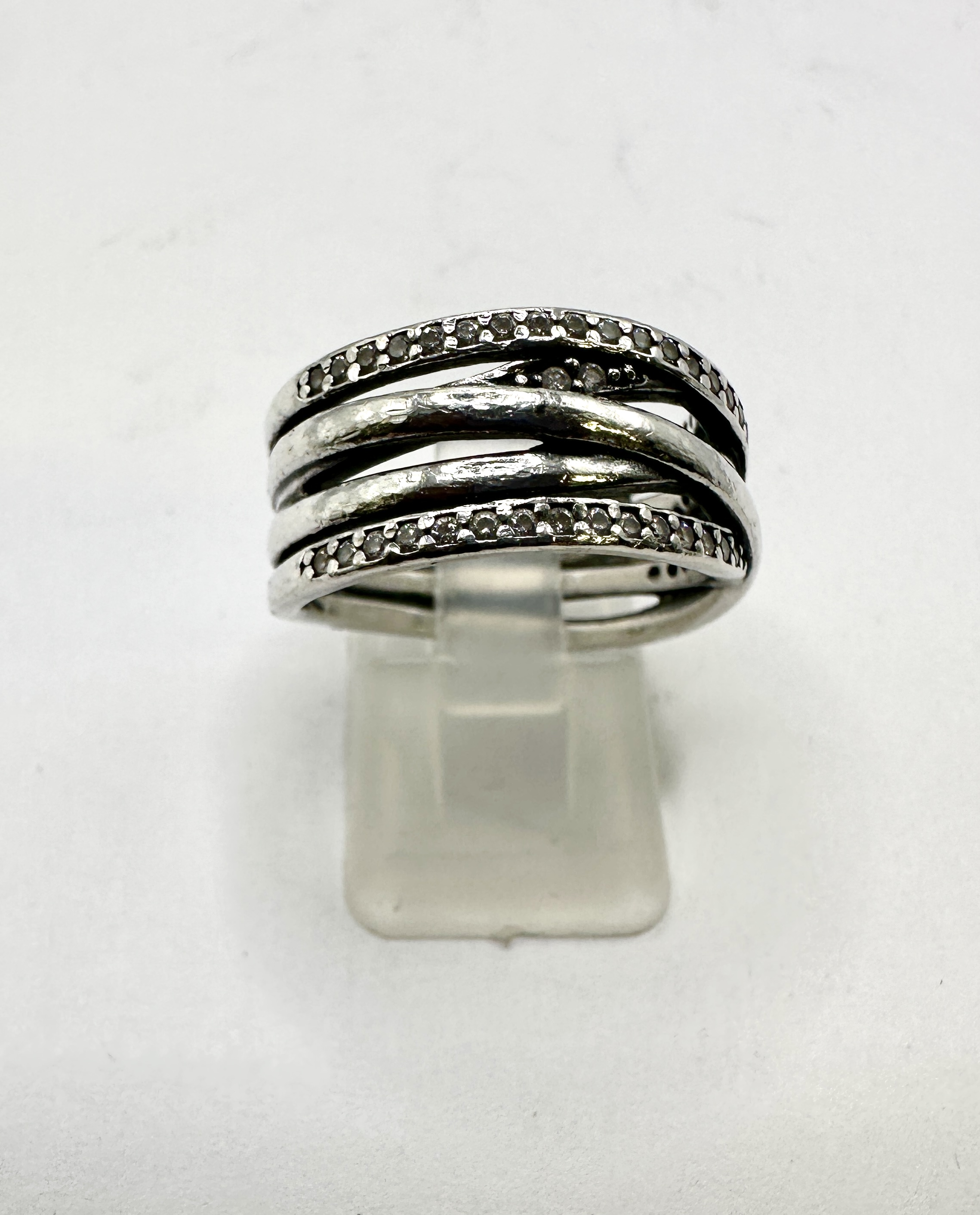 A Pandora Entwined multi-strand ring crafted from 925 silver. The crossover design comprises five intertwined bands, alternating between two bands pave-set with small round-cut clear stones and three bands featuring a hammered finish. The interior of the band is incised with the characters S, 9, 2, 5, A, L, E, indicating the maker’s mark for Pandora and the silver purity.
