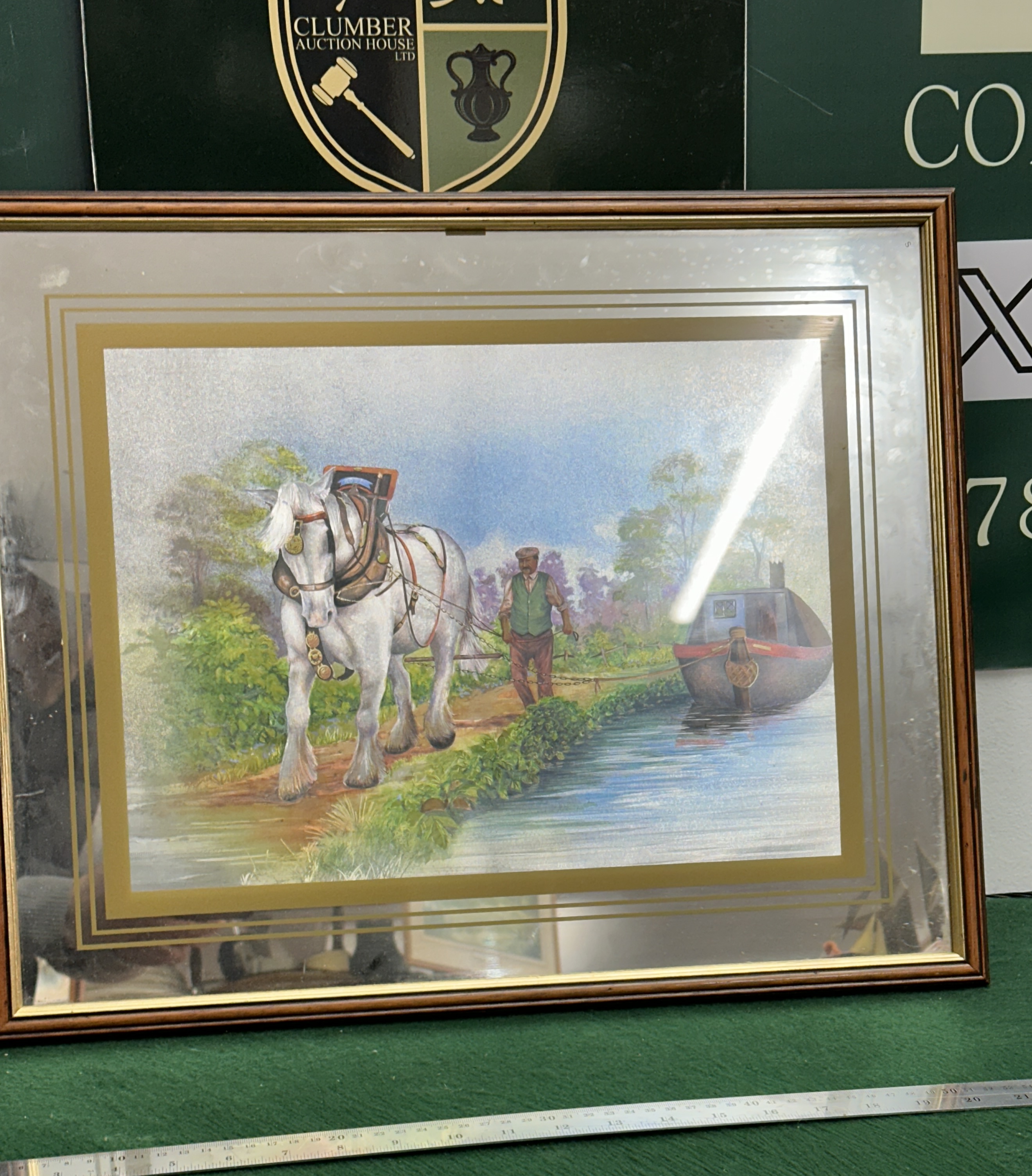 A decorative screenprint on a mirrored glass substrate, depicting a traditional English canal scene. The composition features a heavy horse in harness towing a narrowboat along a waterway, led by a man dressed in a green waistcoat and flat cap. The central image is surrounded by a triple-banded gilt slip and wide mirrored borders. The work is housed in a dark wood-effect frame with a gilt-lined inner edge. No artist signature, edition number, or publisher marks are visible on the front of the piece.