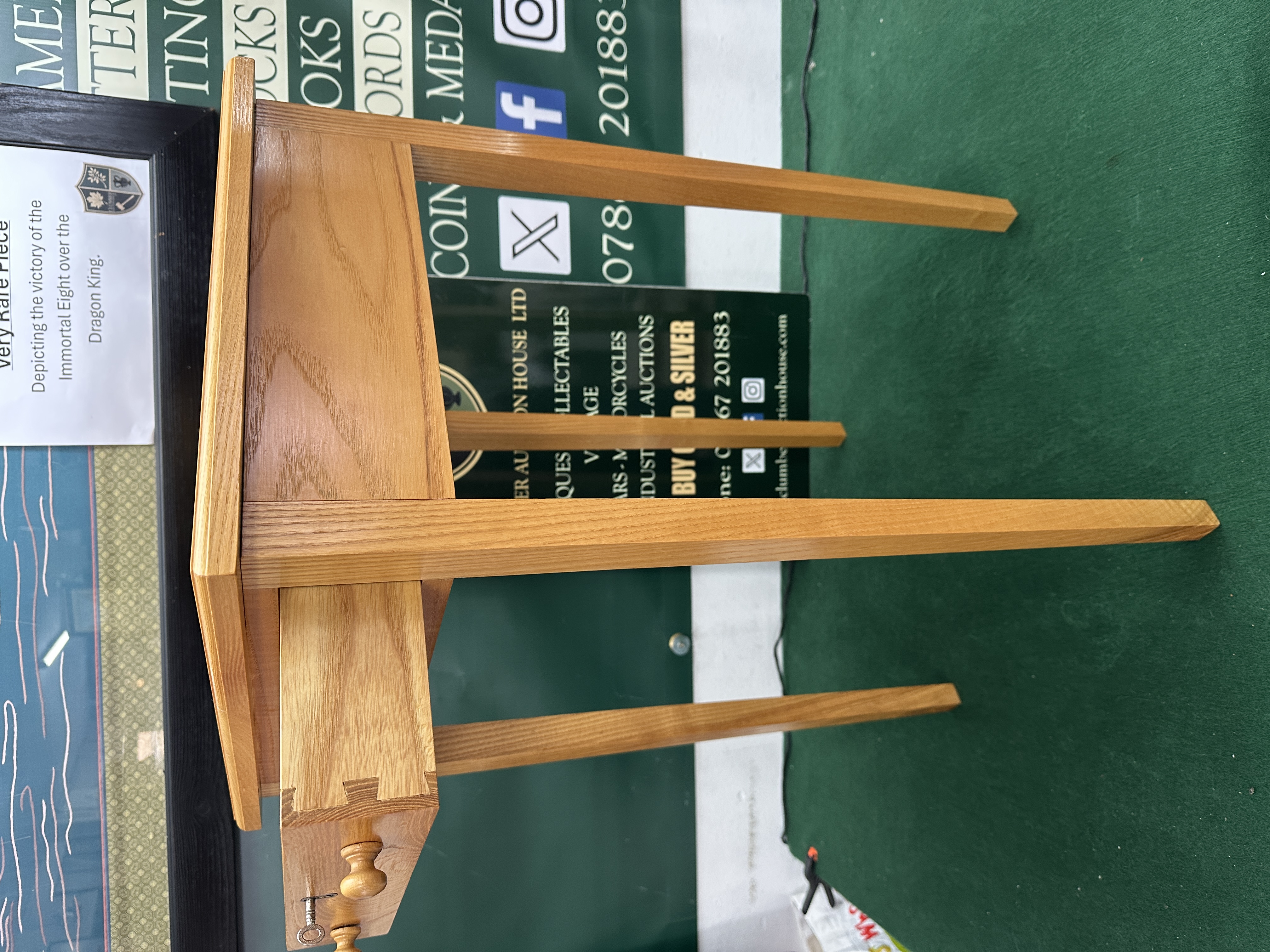 A contemporary side or lamp table crafted from solid light-coloured wood, likely ash or oak, displaying a prominent natural grain. The design features a single drawer over four square tapered legs, reflecting a minimalist aesthetic influenced by Hepplewhite and Shaker traditions. The drawer is assembled using through-dovetail joints and is equipped with two turned wooden knobs and a metal escutcheon. A key is included. The piece is finished in a clear, natural-toned coating. No maker’s marks or stamps were identified during inspection.