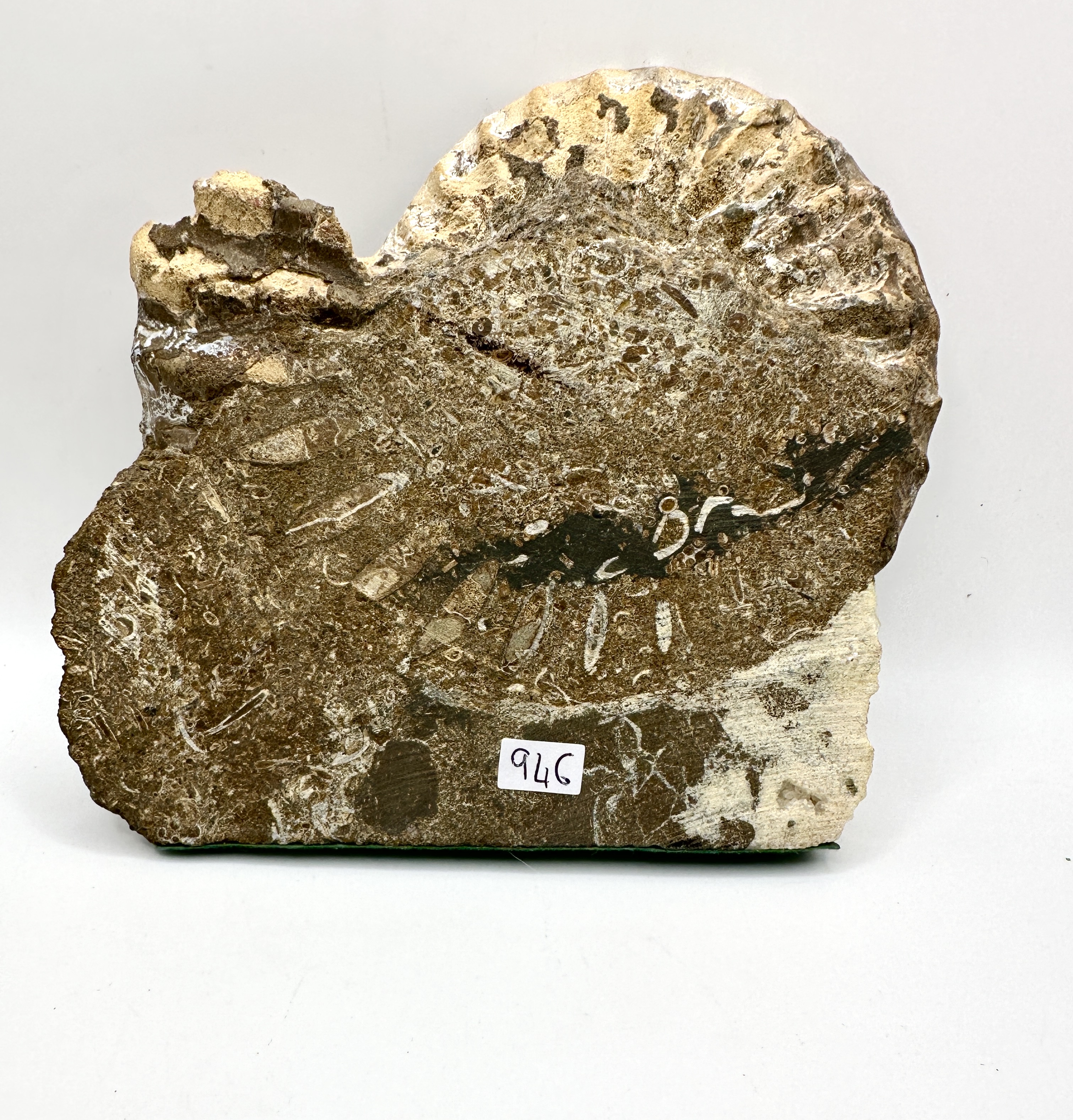 A mantel clock set into a large, cross-sectioned ammonite fossil. The piece features polished surfaces that reveal internal chambers filled with pale crystalline deposits. The inset clock has a white dial with black Roman numerals and a gold-toned bezel; the dial is marked with the letters QUARTZ, indicating a quartz movement. The specimen is mounted on its own natural, unpolished stone matrix which provides a stable, flat base. The reverse of the piece displays the rough-hewn natural texture of the fossil matrix and bears a small paper lot sticker with the handwritten numbers 946.