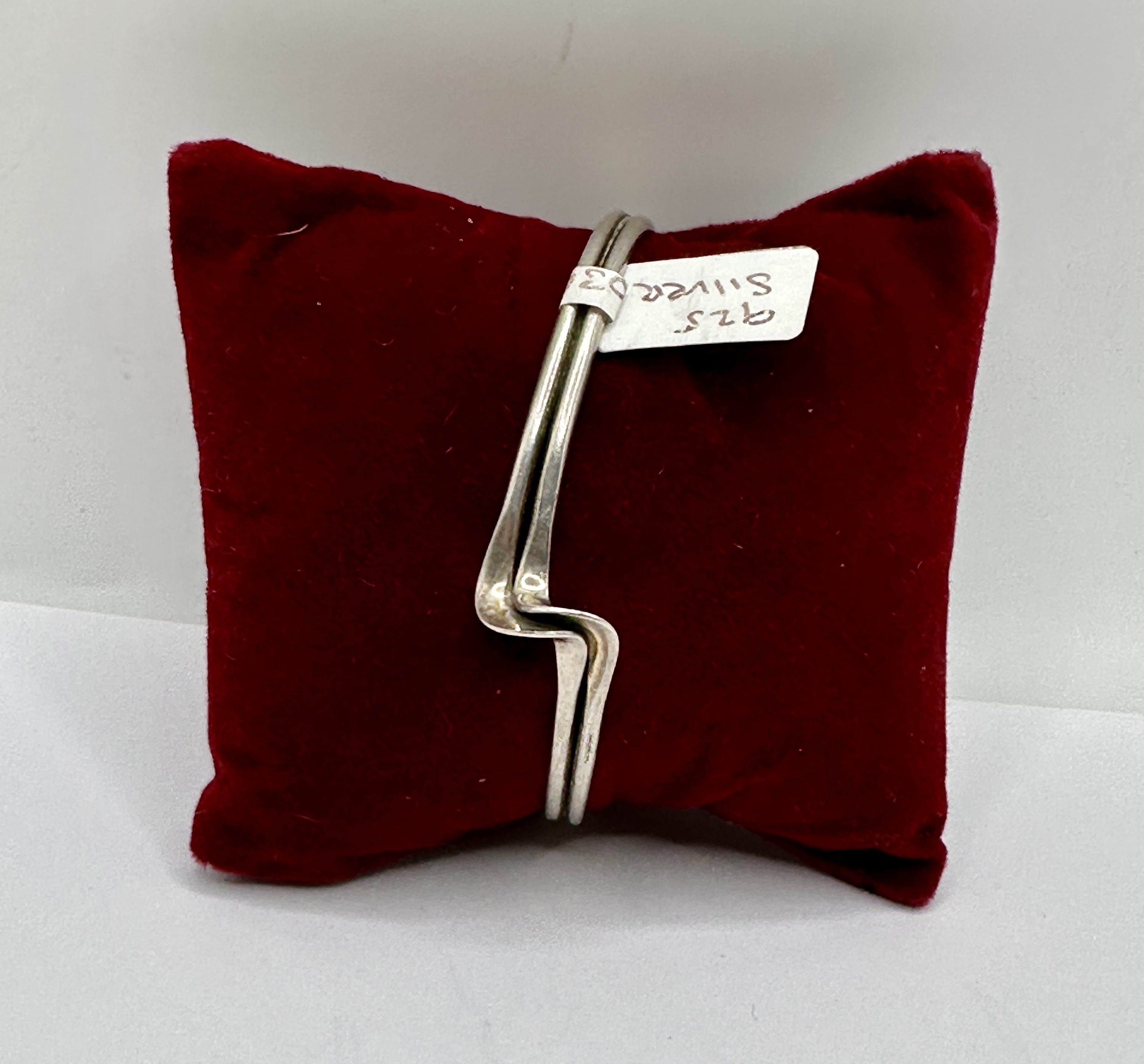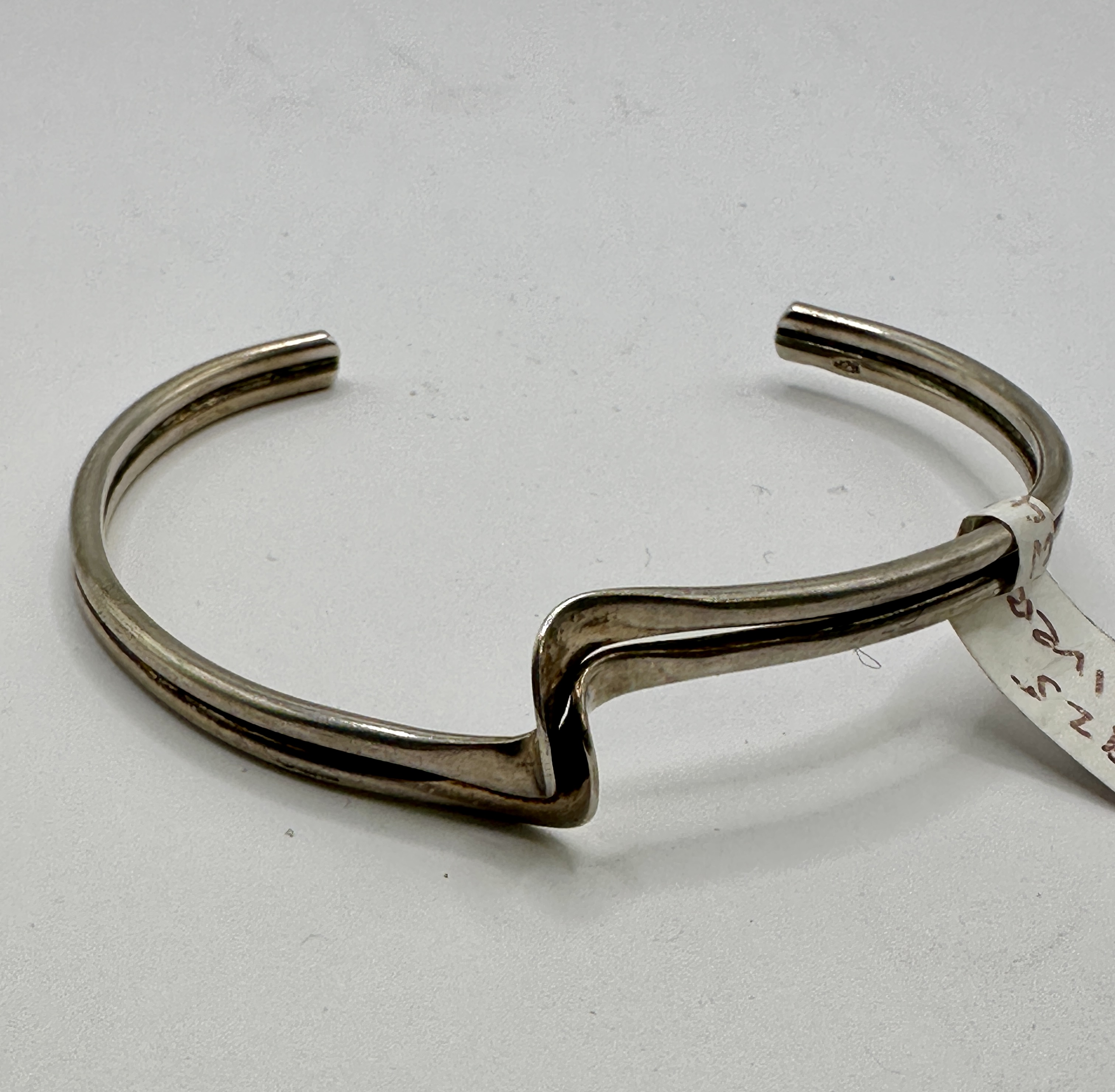 A modernist style cuff bracelet crafted from 925 sterling silver. The design features two parallel round-section wires that curve to form an open cuff, manipulated at the centre into an interlocking step or wave-like twist. The piece is constructed with an open back for ease of wear. The interior surface of one terminal end is stamped with a 925 mark within an oval reserve, indicating the silver purity. No further maker marks are present.