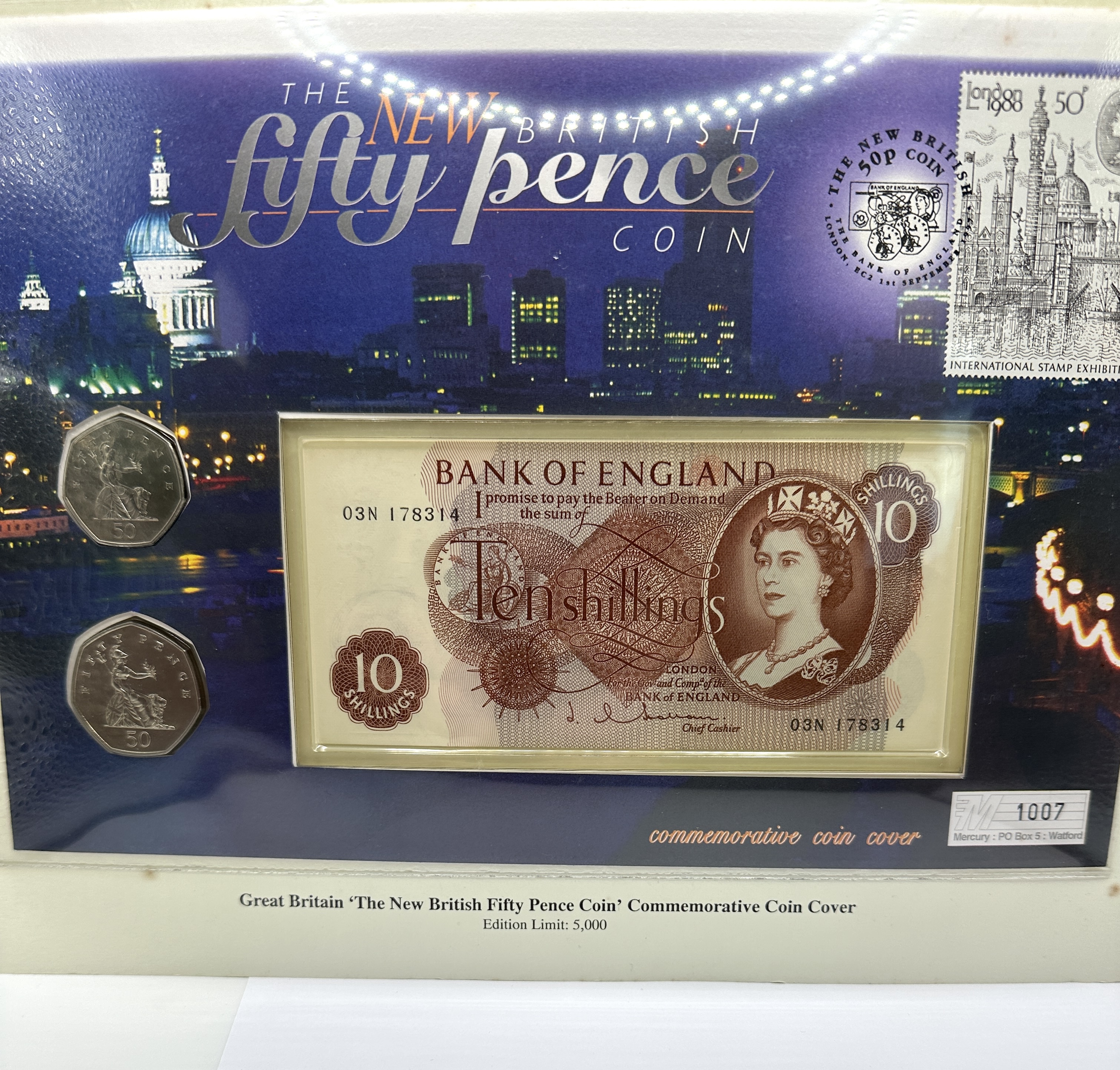 A Mercury ‘The New British Fifty Pence Coin’ commemorative coin cover, numbered 1007 of a limited edition of 5,000. The set comprises a Bank of England ten-shilling banknote and two 1997 heptagonal fifty-pence coins. The banknote, serial number 03N 178314, features the portrait of Queen Elizabeth II and the signature of Chief Cashier J. S. Fforde. The two cupro-nickel coins represent the reduced-size 50p specification introduced in 1997, featuring the seated Britannia reverse. The cover is franked with a pictorial London stamp and a Bank of England, London circular postmark dated 1st September 1997, marking the official issue date of the new coinage. The items are presented in a decorative card folder featuring a London skyline illustration.