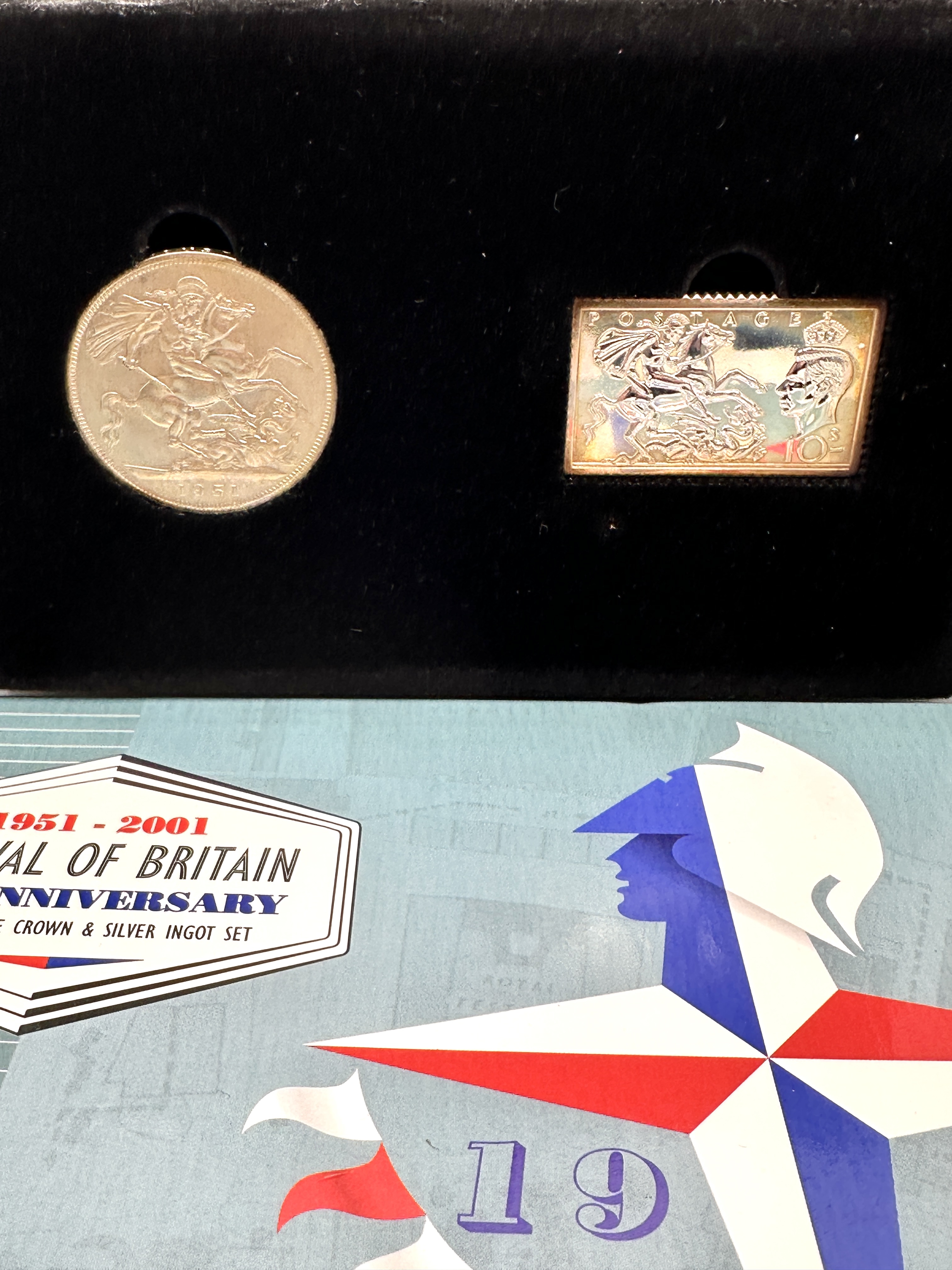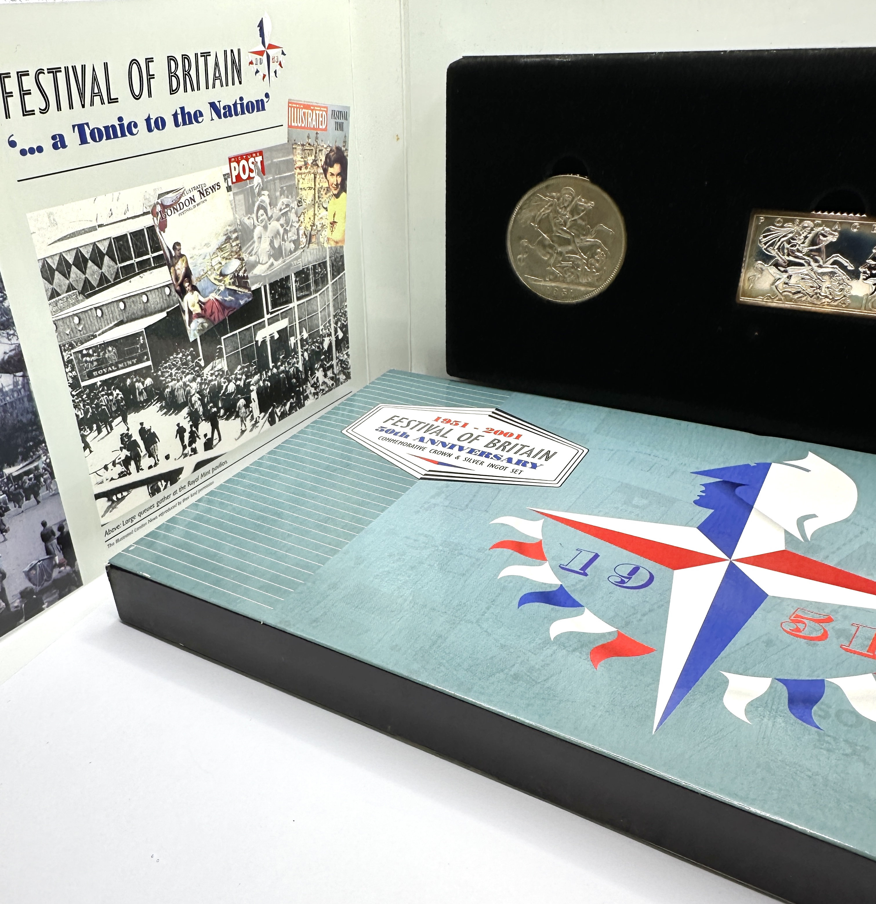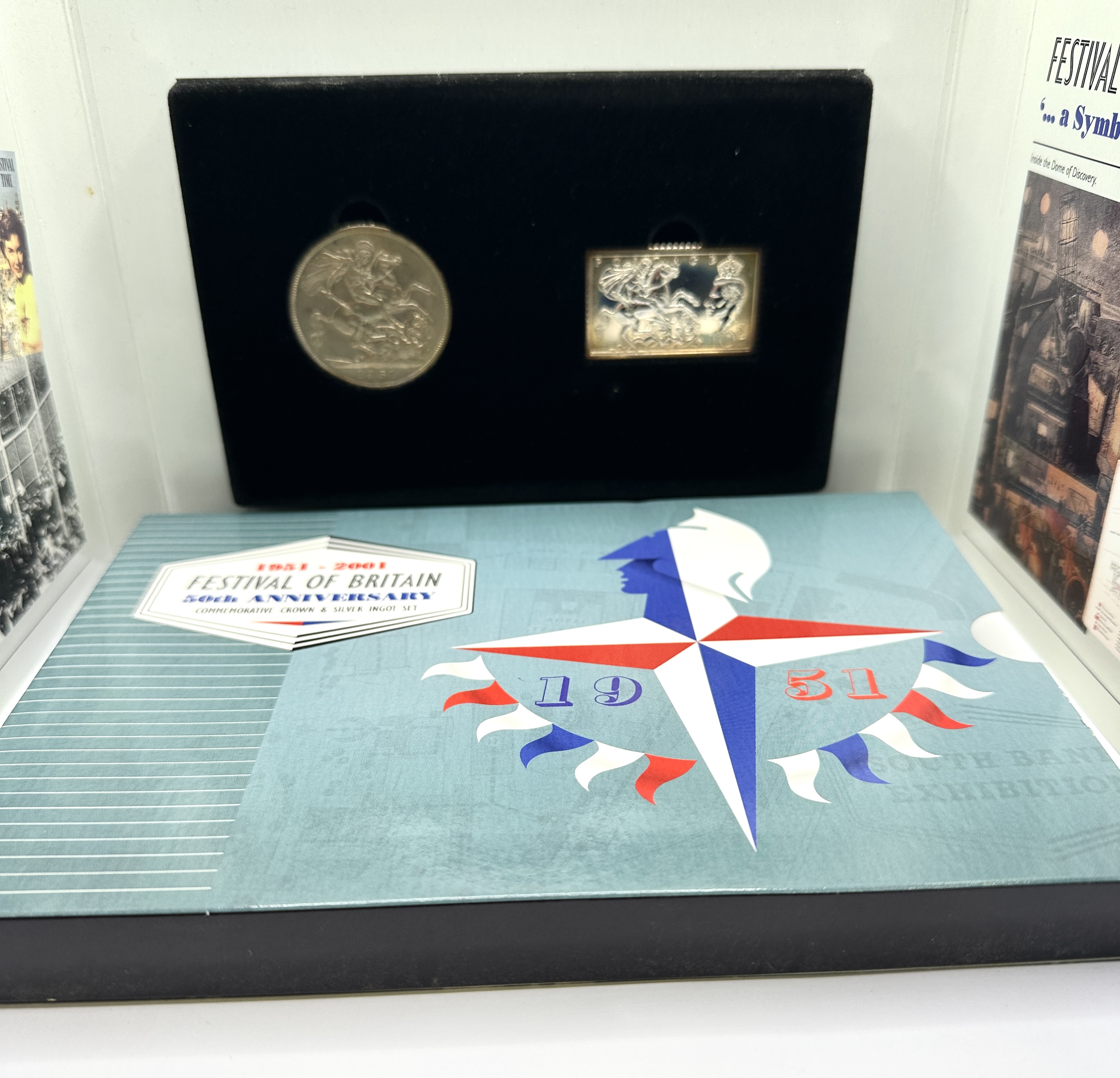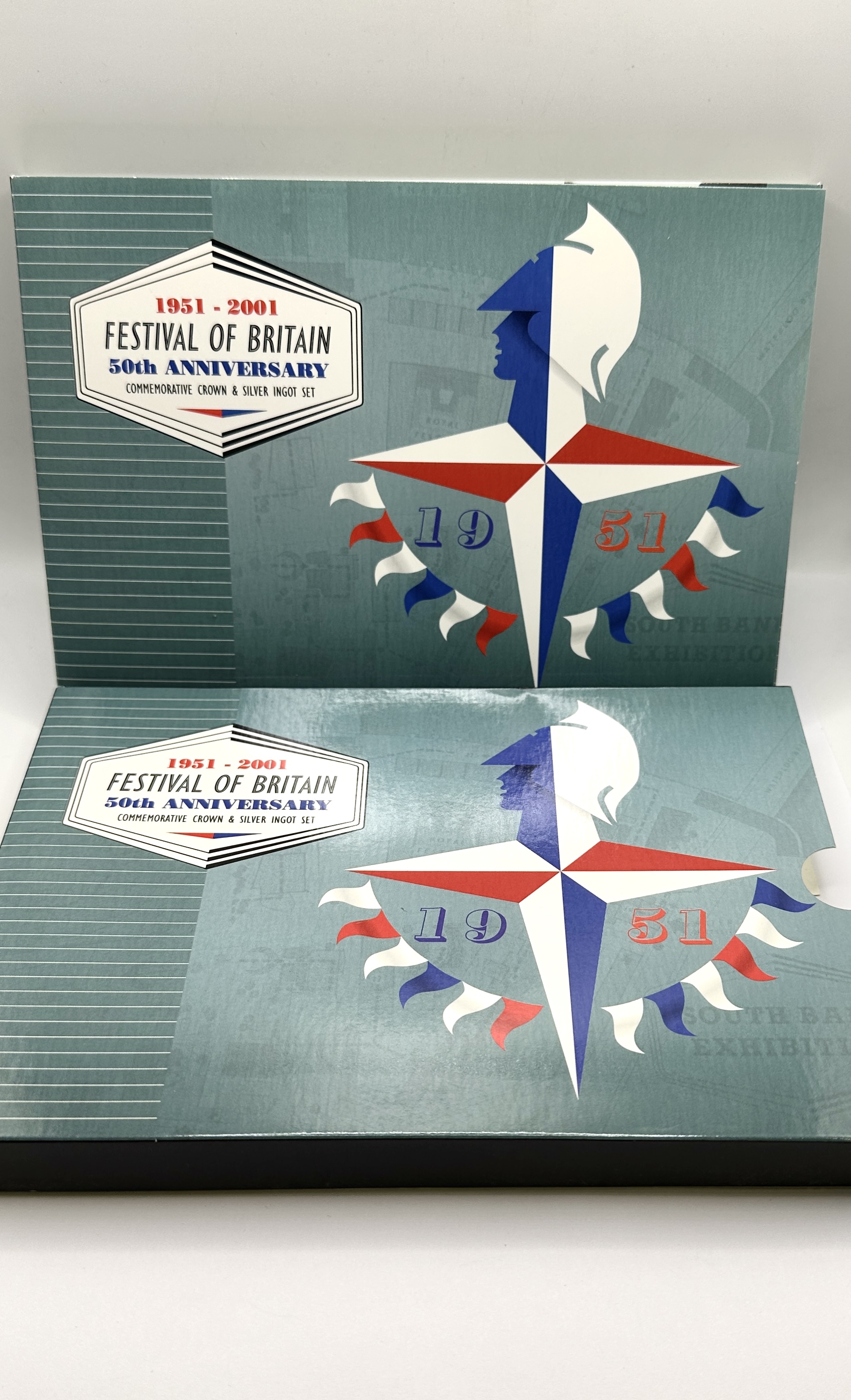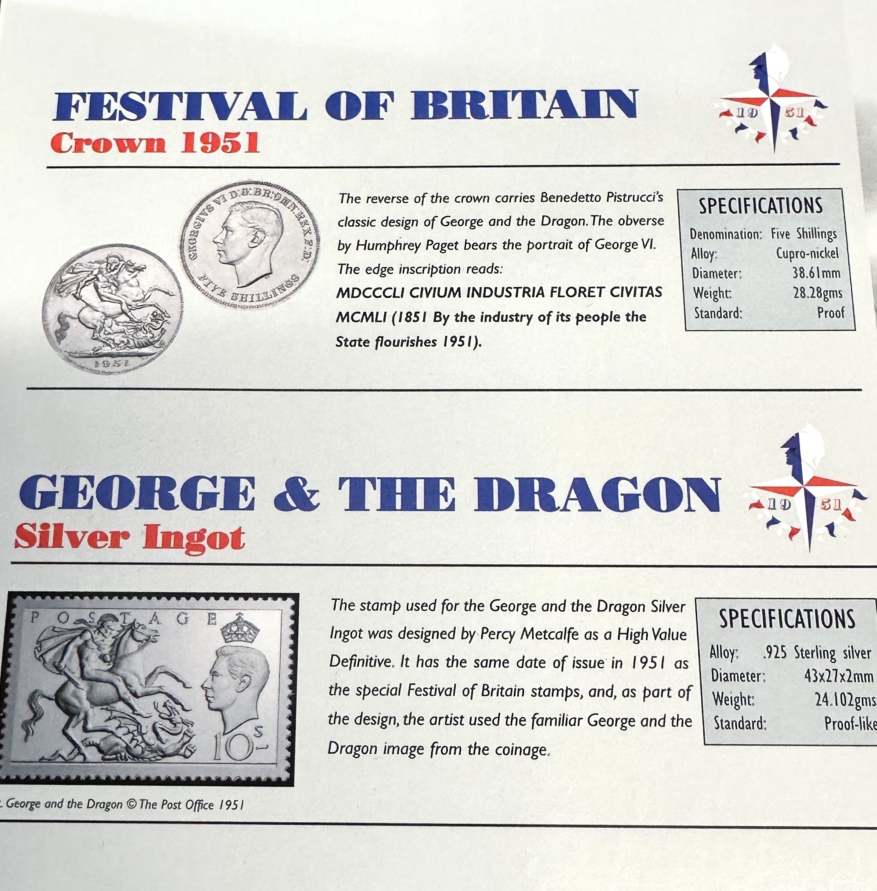 A commemorative numismatic set issued in 2001 to celebrate the 50th anniversary of the 1951 Festival of Britain. The collection includes a 1951 cupro-nickel crown and a sterling silver ingot. The crown is a Five Shilling piece featuring the Humphrey Paget portrait of King George VI on the obverse and the Benedetto Pistrucci St. George and the Dragon design on the reverse, dated 1951. The rectangular silver ingot is struck in .925 sterling silver, replicating the 1951 10-shilling postage stamp designed by Percy Metcalfe, which depicts the George VI portrait and St. George and the Dragon motif. The items are presented in a black velvet-lined box with a pictorial outer sleeve featuring the Abram Games festival symbol, accompanied by a technical specification sheet and illustrated folder.