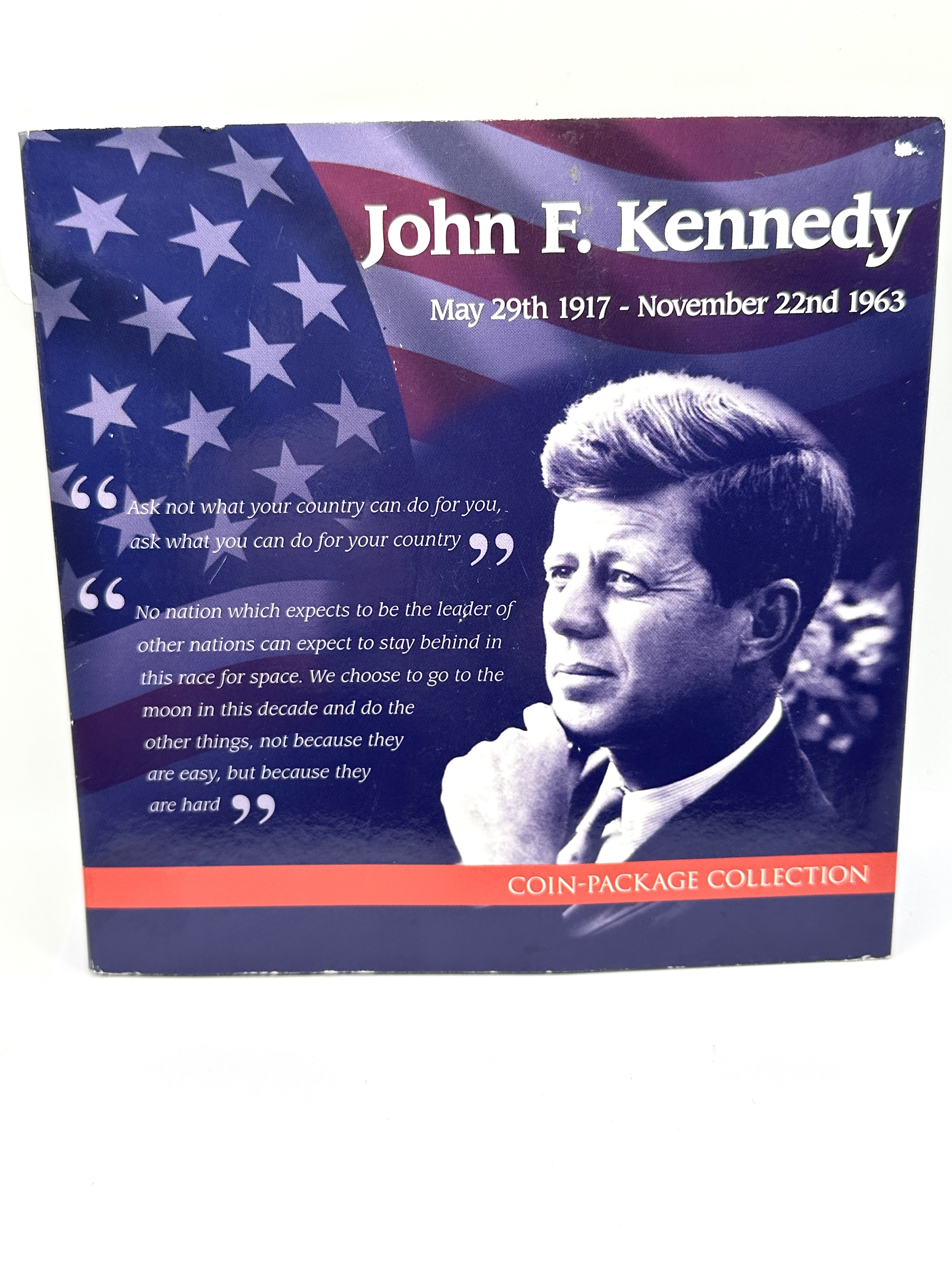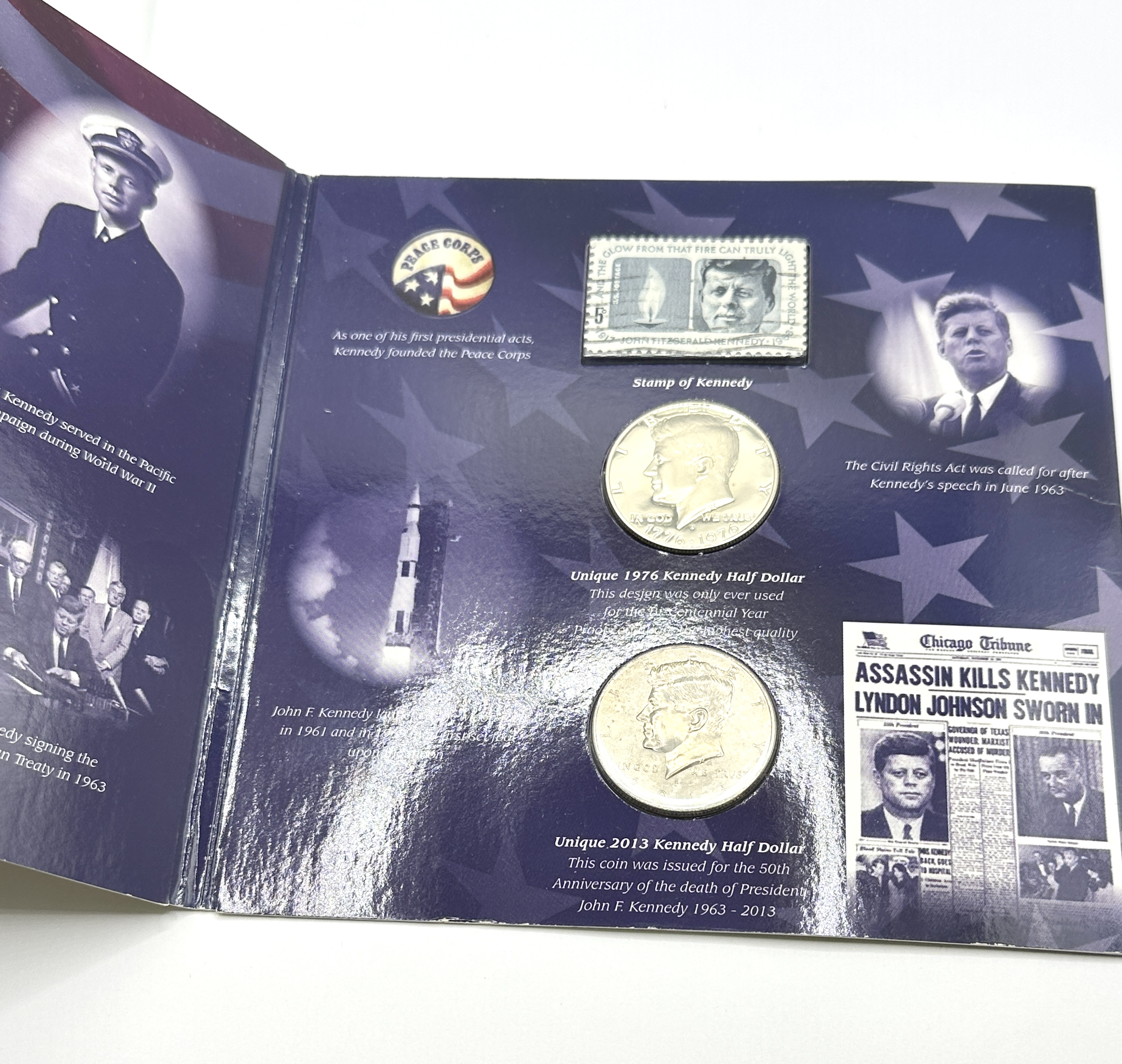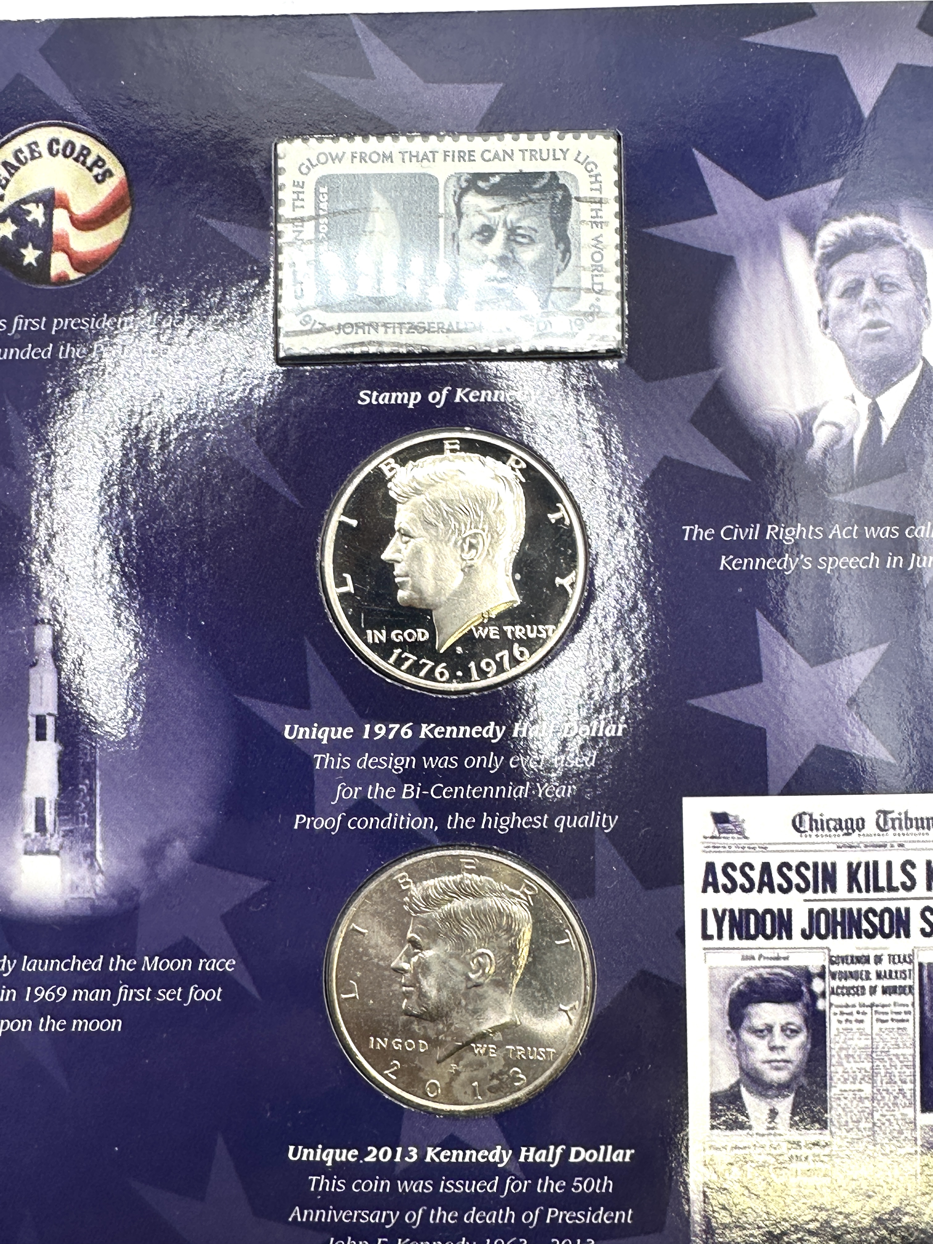 A numismatic and philatelic commemorative display titled John F. Kennedy Coin-Package Collection, issued to mark the 50th anniversary of the death of President Kennedy. The lot comprises a pair of Kennedy Half Dollars and a commemorative postage stamp. The first coin is a 1776-1976 S Bicentennial Kennedy Half Dollar, exhibiting a proof finish with mirrored fields and frosted devices. The second coin is a 2013 D Kennedy Half Dollar in uncirculated condition. The philatelic component is a US 5-cent memorial postage stamp featuring the eternal flame and the legend AND THE GLOW FROM THAT FIRE CAN TRULY LIGHT THE WORLD. The items are housed in a blue, star-patterned card folder illustrated with historical photographs and quotes, including the Peace Corps logo, a Saturn V rocket launch, and a reproduction of the Chicago Tribune headline from 22 November 1963. The coins are silver-coloured in appearance.