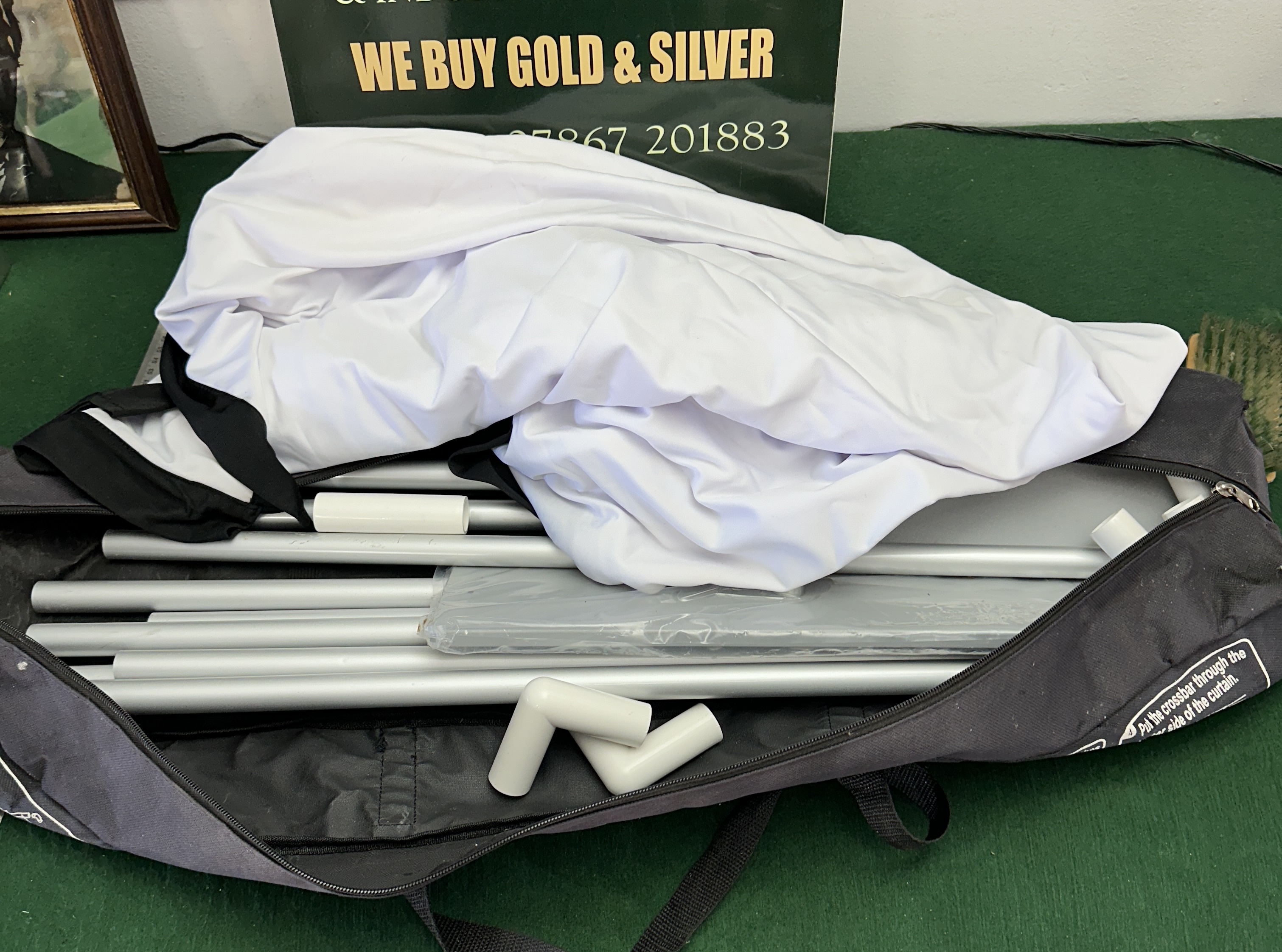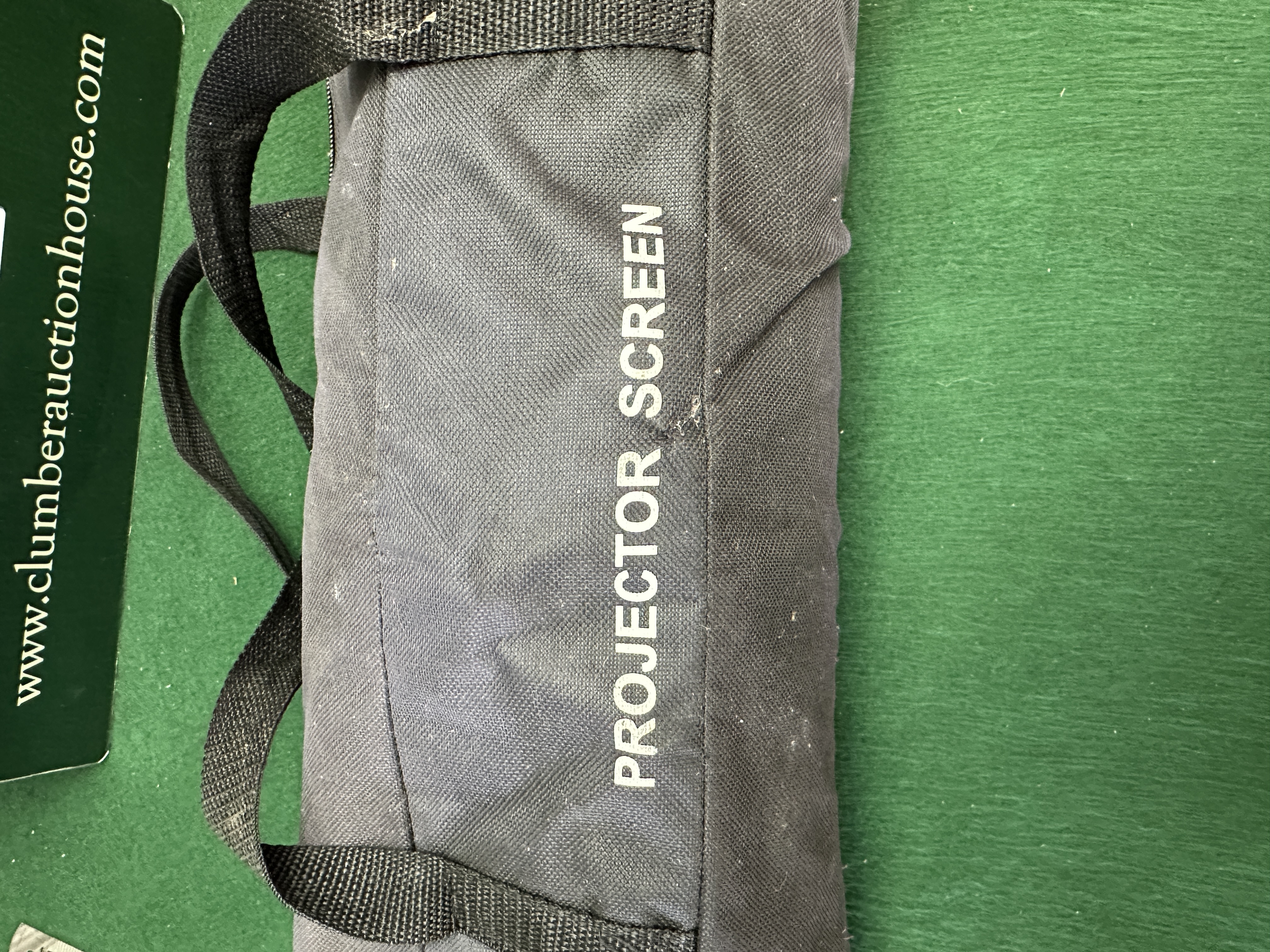 A portable projector screen kit comprising several silver-toned metal poles, white plastic corner connectors, and a large white fabric screen. The components are housed within a black synthetic zippered carrying bag printed with the text PROJECTOR SCREEN in white capital letters. An instructional label on the interior edge of the bag reads Put the crossbar through the side of the curtain. The kit includes a flat, rectangular component sealed in clear plastic packaging. The items are of modern manufacture.
