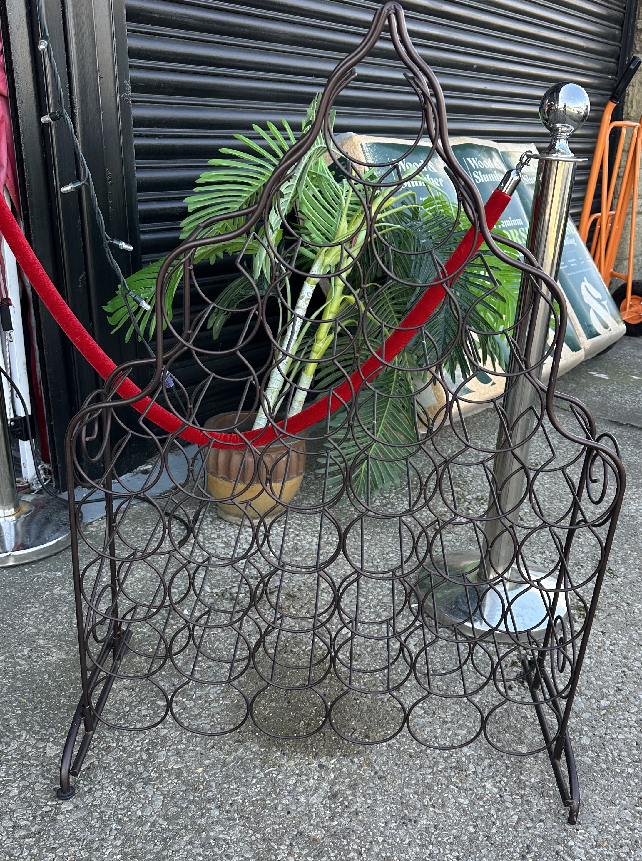 A large floor-standing wine rack of wrought metal construction, finished in a dark brown or bronze-coloured patina. The frame features a decorative ogee-arched top and is composed of multiple circular metal wire rings welded together to create individual bottle storage compartments. The unit is supported by four out-swept slender feet. The design is contemporary and lacks any visible maker marks or inscriptions.