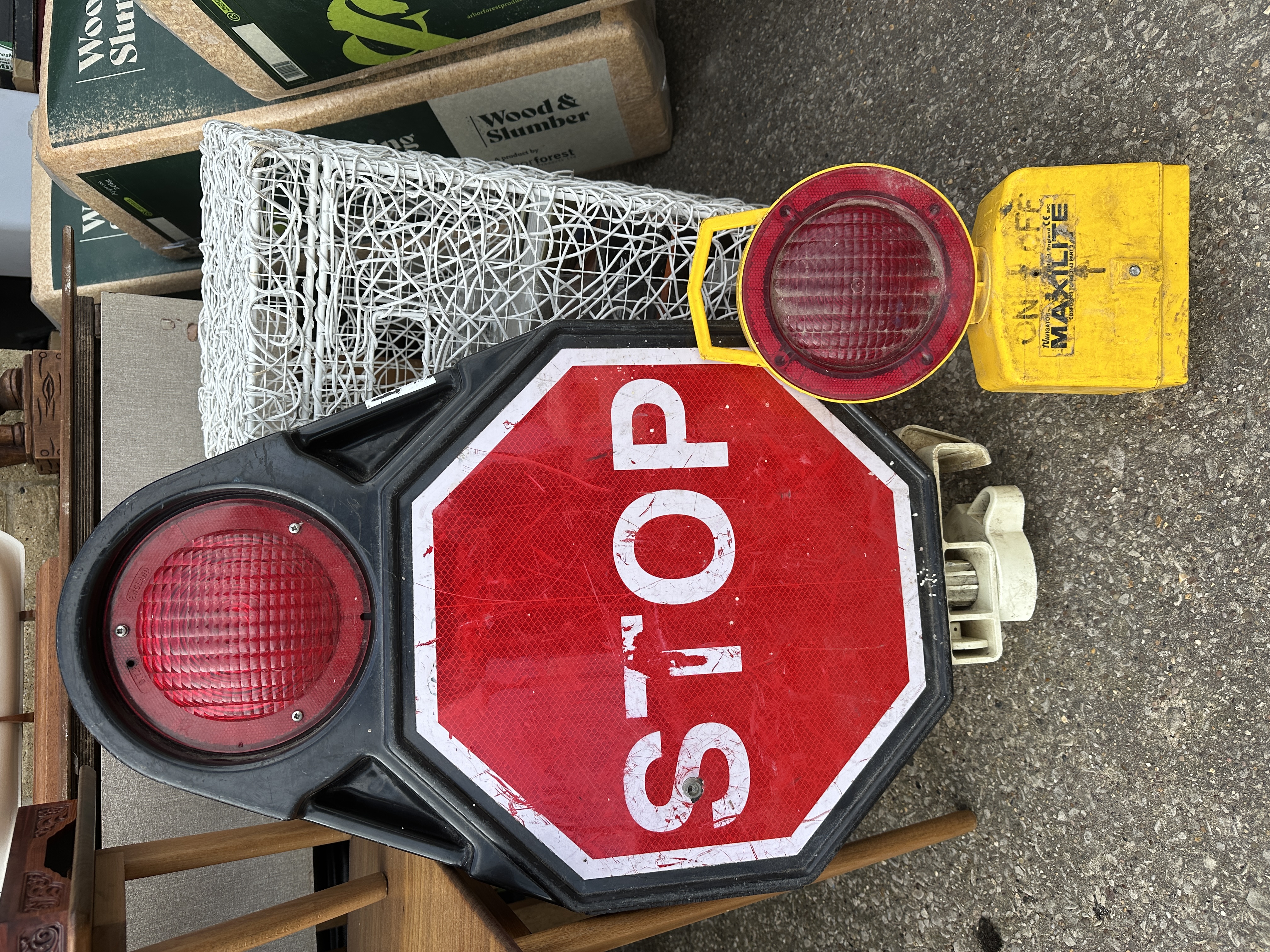 The items show visible signs of outdoor use and storage, including significant surface scratching, scuffing, and ingrained dirt to the plastic housings and lenses. The reflective sign surface shows minor abrasions and surface marking. The miscellaneous items, including the wire basket and furniture components, show varying degrees of surface wear consistent with storage. All electrical and battery-operated components are untested.