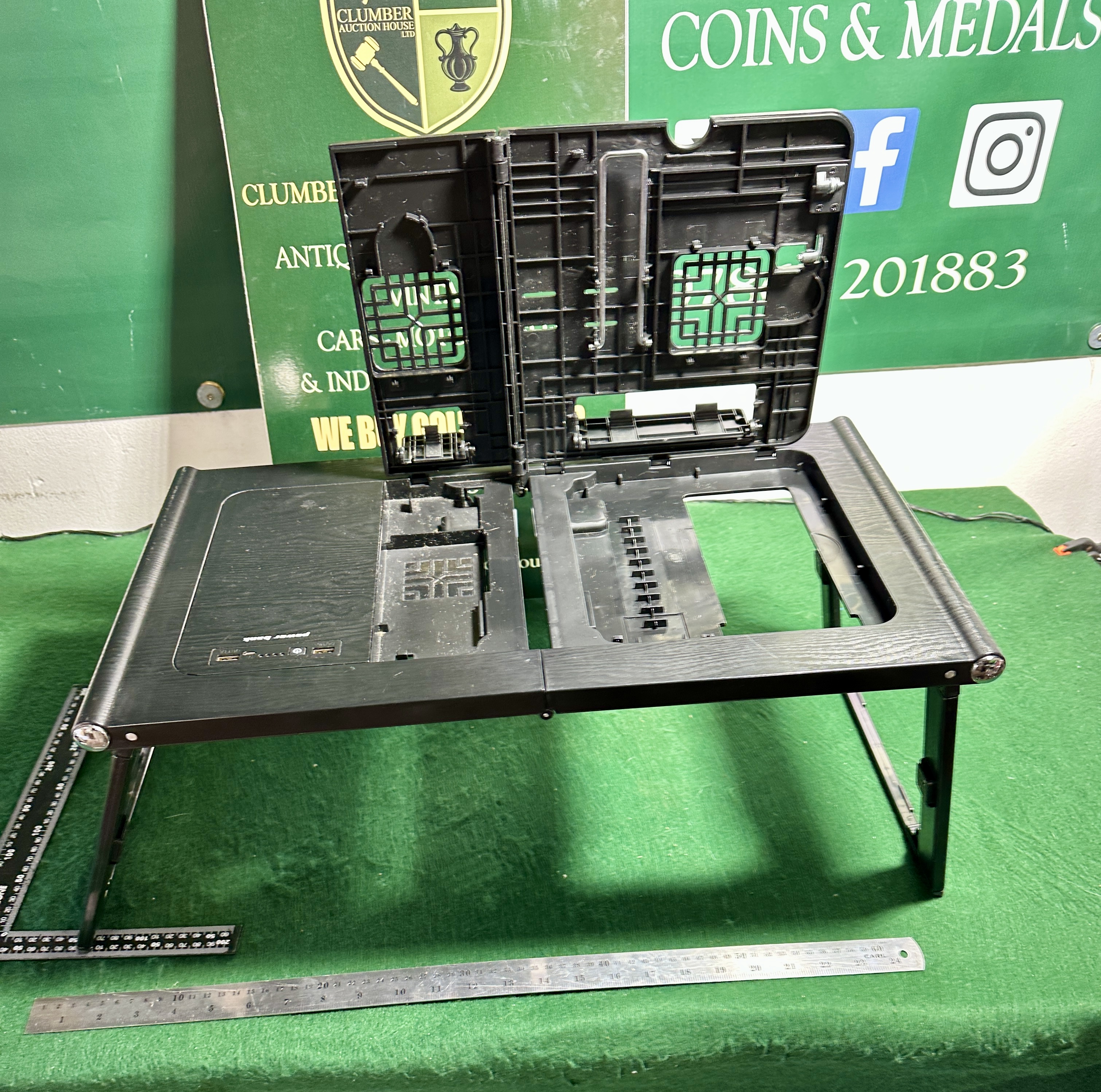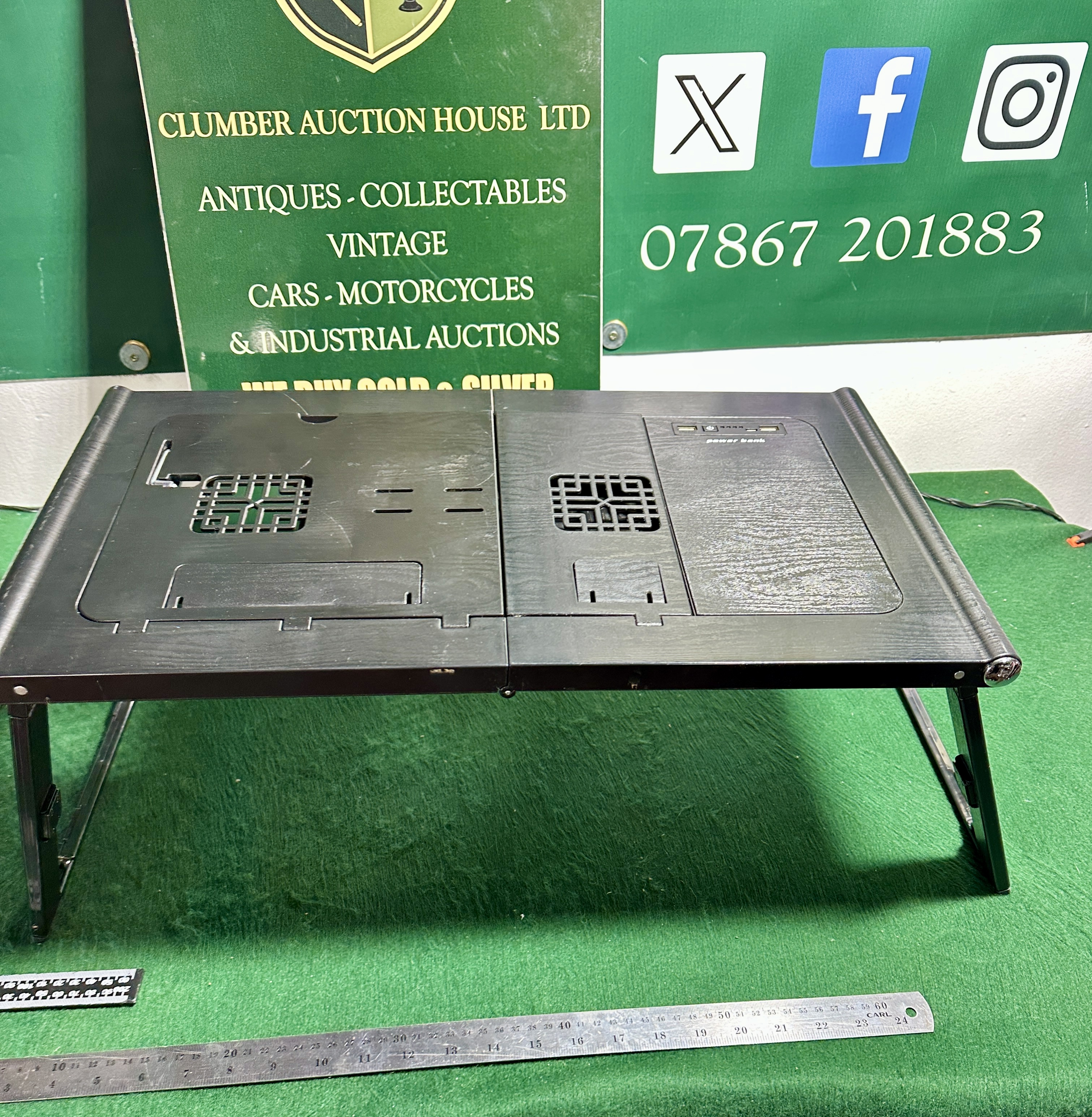 Attributed to iMounTEK, this multi-functional portable folding laptop desk features a black plastic construction with a wood-grain textured finish. The unit includes integrated dual cooling fans positioned beneath decorative grilles and a built-in power bank. The power bank interface consists of two USB-A output ports marked OUT 2A and OUT 1A, a micro-USB input port, a power button, and four LED battery status indicators. The work surface is divided into a tilting laptop support and a fixed side section, with additional retractable components for device support. The desk stands on foldable legs and can be collapsed for storage.