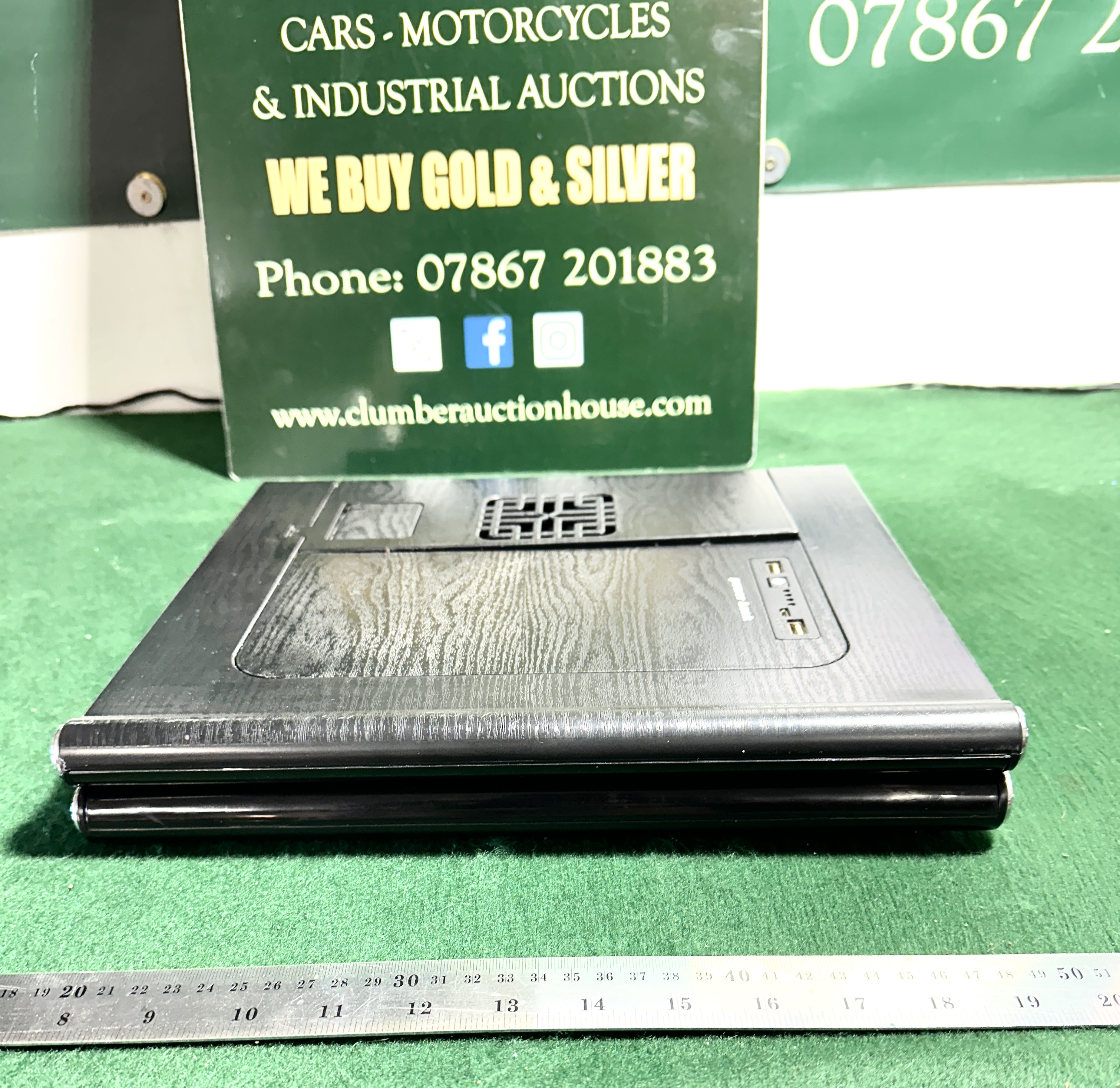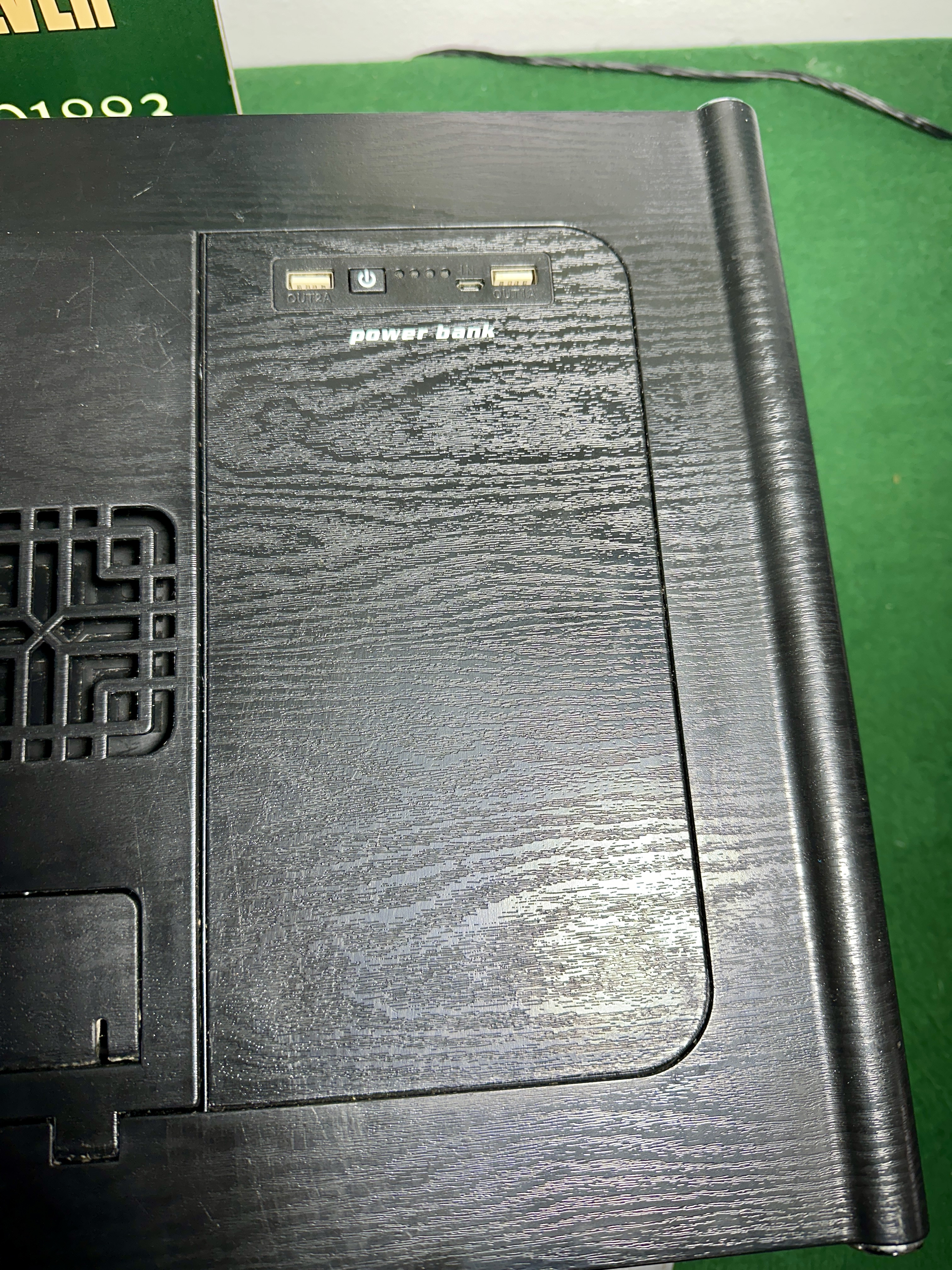 The item shows minor cosmetic wear, including surface scuffs and scratches. The power-on status is not demonstrated, and all electronic components, including the fans and power bank, are untested.
