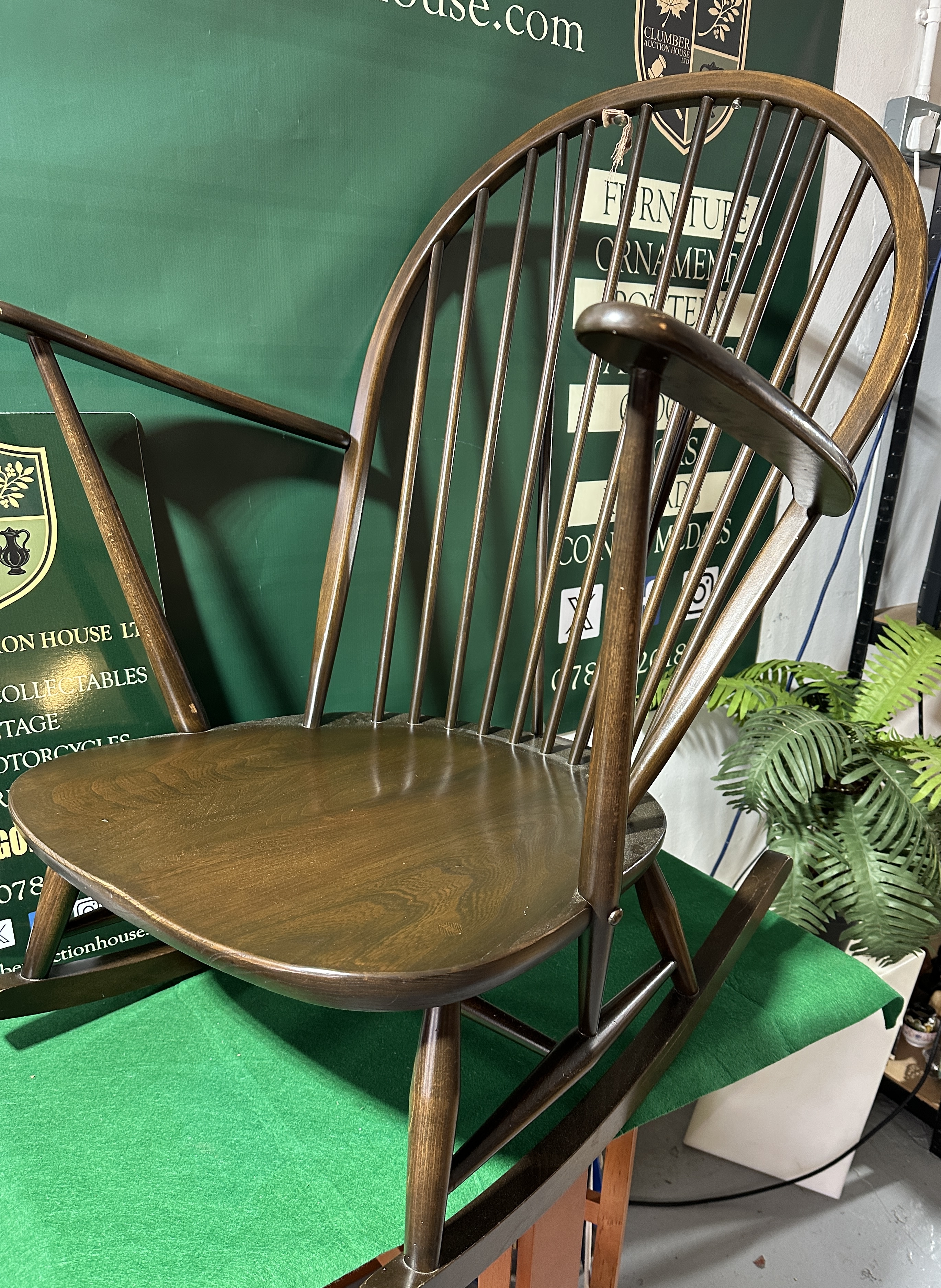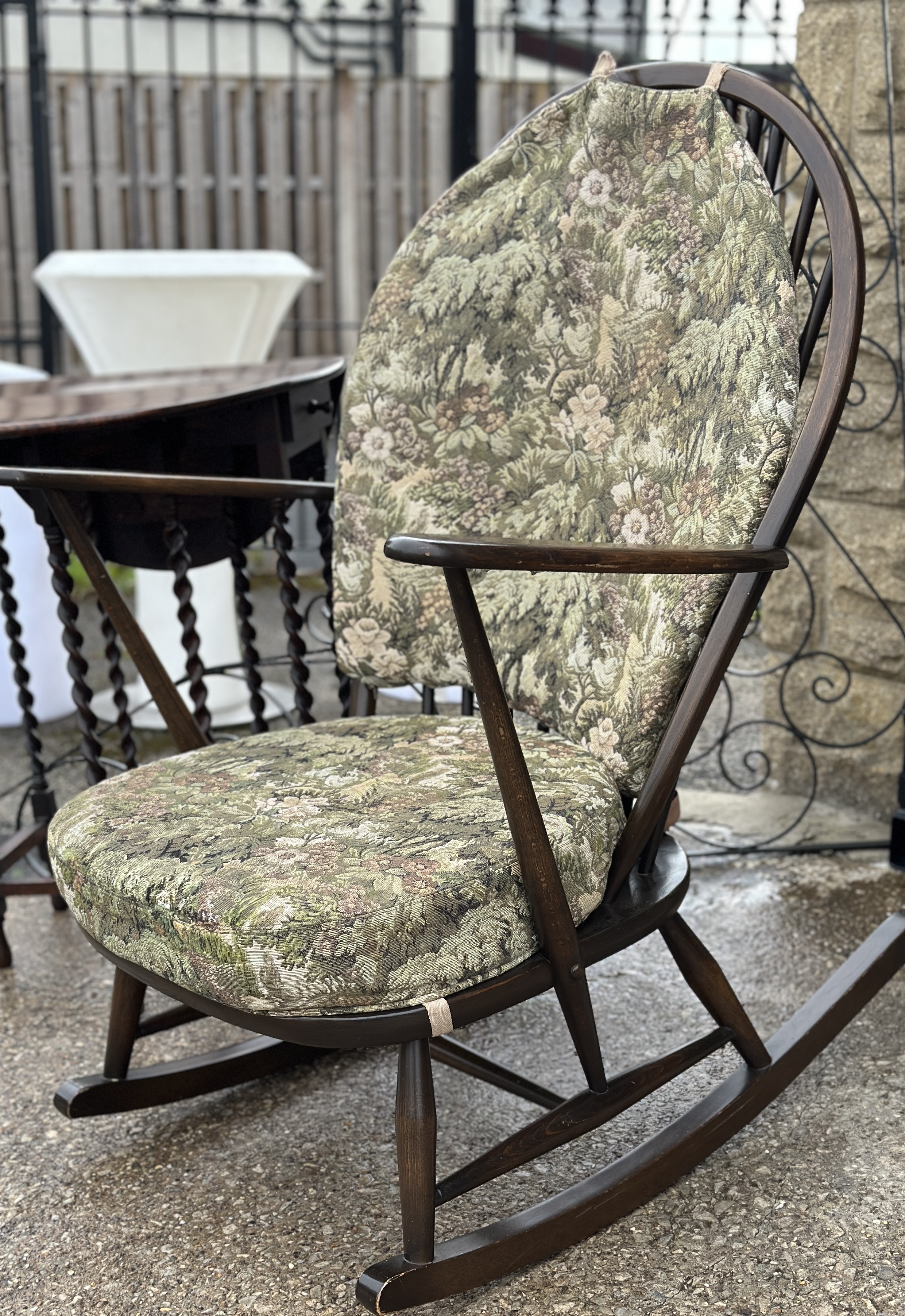 Attributed to Ercol, this mid-century modern Windsor style rocking chair is the Grandfather model 315. The piece is constructed with a beech wood frame and spindles and a solid elm wood saddle seat, featuring a dark stained finish. The design includes a high, arched bentwood hoop back enclosing thirteen vertical spindles. The out-swept arms are supported by tapering spindles. The solid, shaped seat is mounted on turned legs and H-pattern stretchers, all set upon curved rockers. The chair is accompanied by a two-piece detachable cushion set for the seat and back, featuring a floral tapestry-patterned fabric, secured to the frame with fabric ties. No maker’s marks, labels, or stamps are visible.