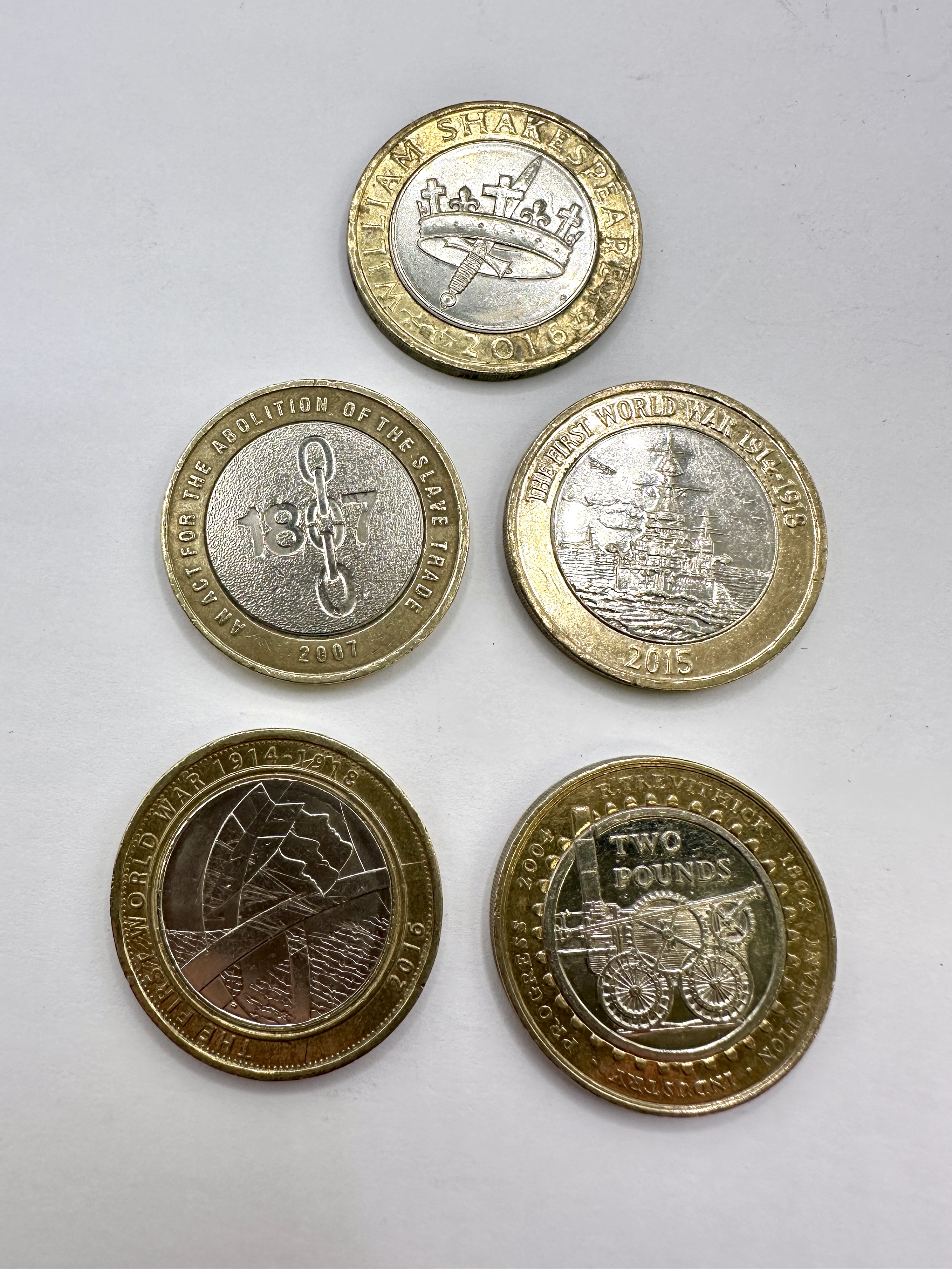 A collection of five UK commemorative bi-metallic two pound coins. The group comprises: a 2016 William Shakespeare Tragedies coin with a crown and dagger design; a 2007 Abolition of the Slave Trade coin featuring the date 1807 and a chain link; a 2015 First World War Royal Navy battleship coin; a 2016 First World War Army coin with a stylized geometric design; and a 2004 Richard Trevithick steam locomotive coin. Each coin is composed of a nickel-brass outer ring and a cupro-nickel inner core with a milled edge. Inscriptions include WILLIAM SHAKESPEARE 2016, AN ACT FOR THE ABOLITION OF THE SLAVE TRADE 2007, THE FIRST WORLD WAR 1914-1918, and R. TREVITHICK 1804 INVENTION INDUSTRY PROGRESS 2004. These coins were issued by the Royal Mint to commemorate significant British historical events and figures.