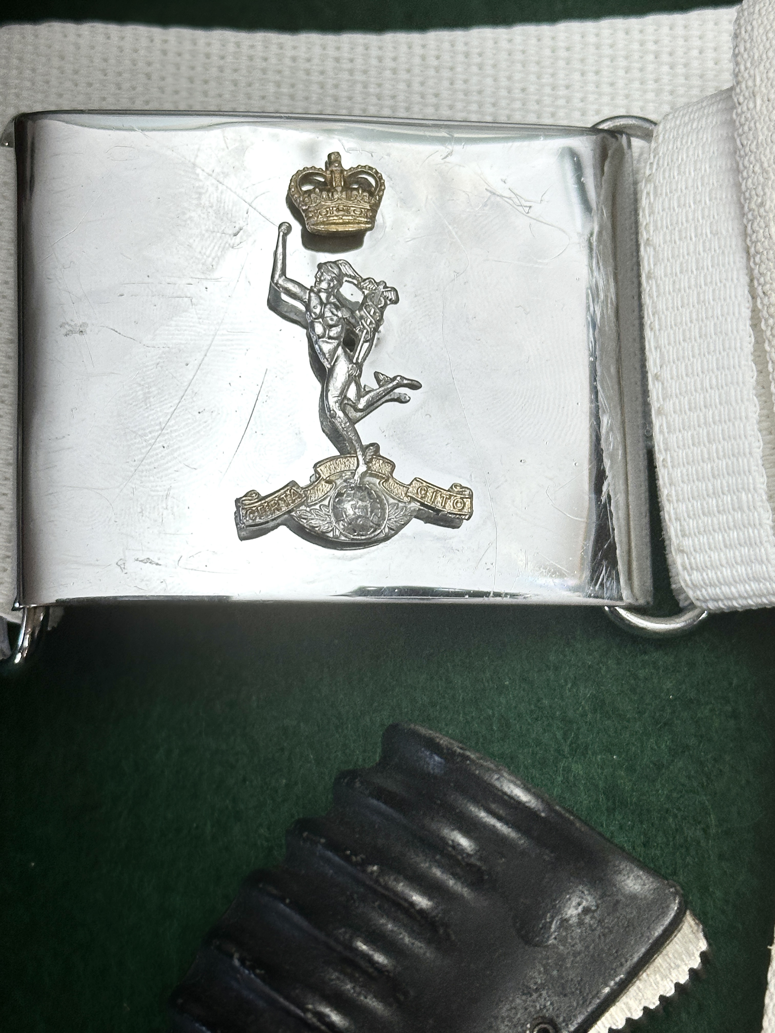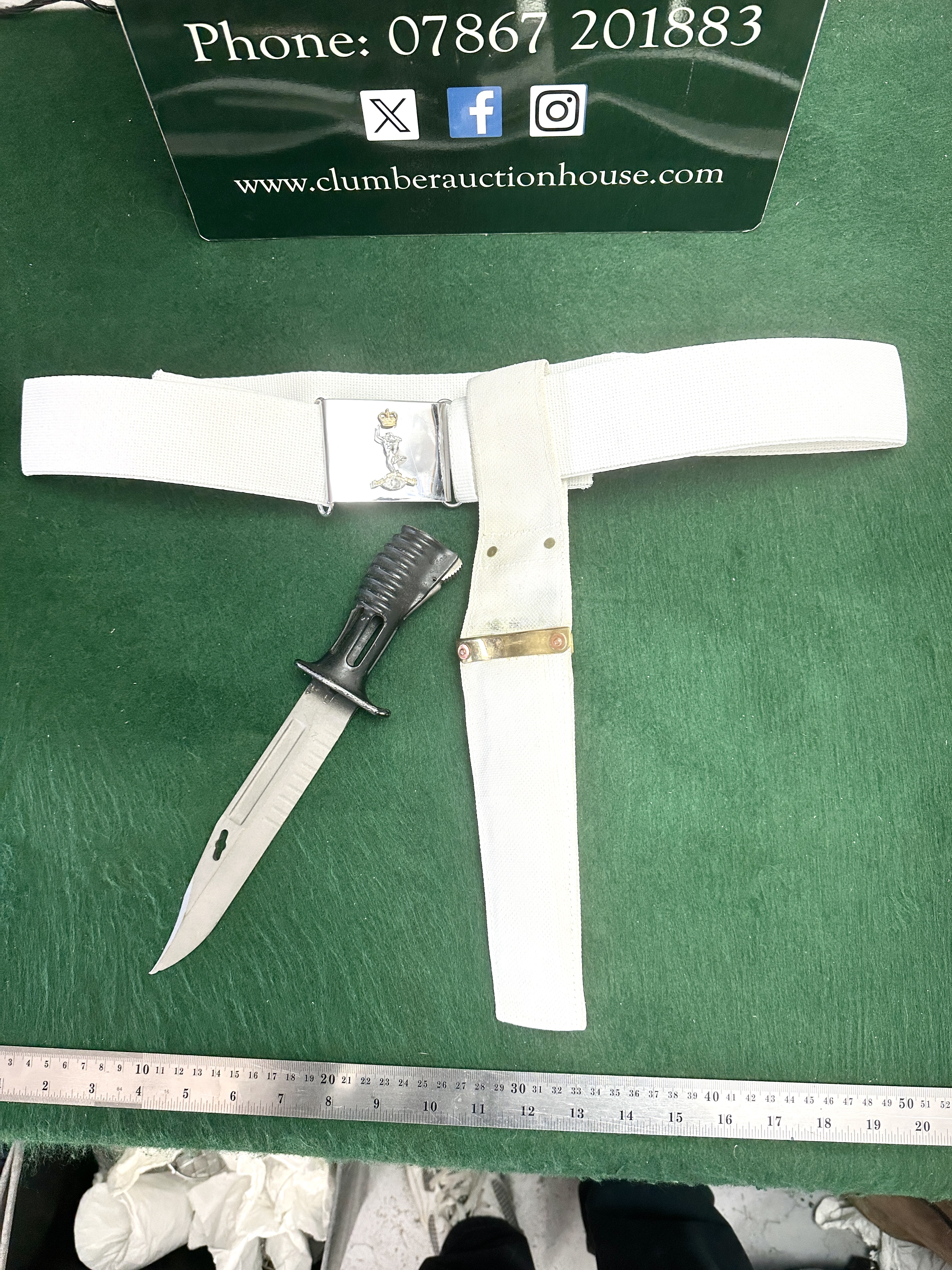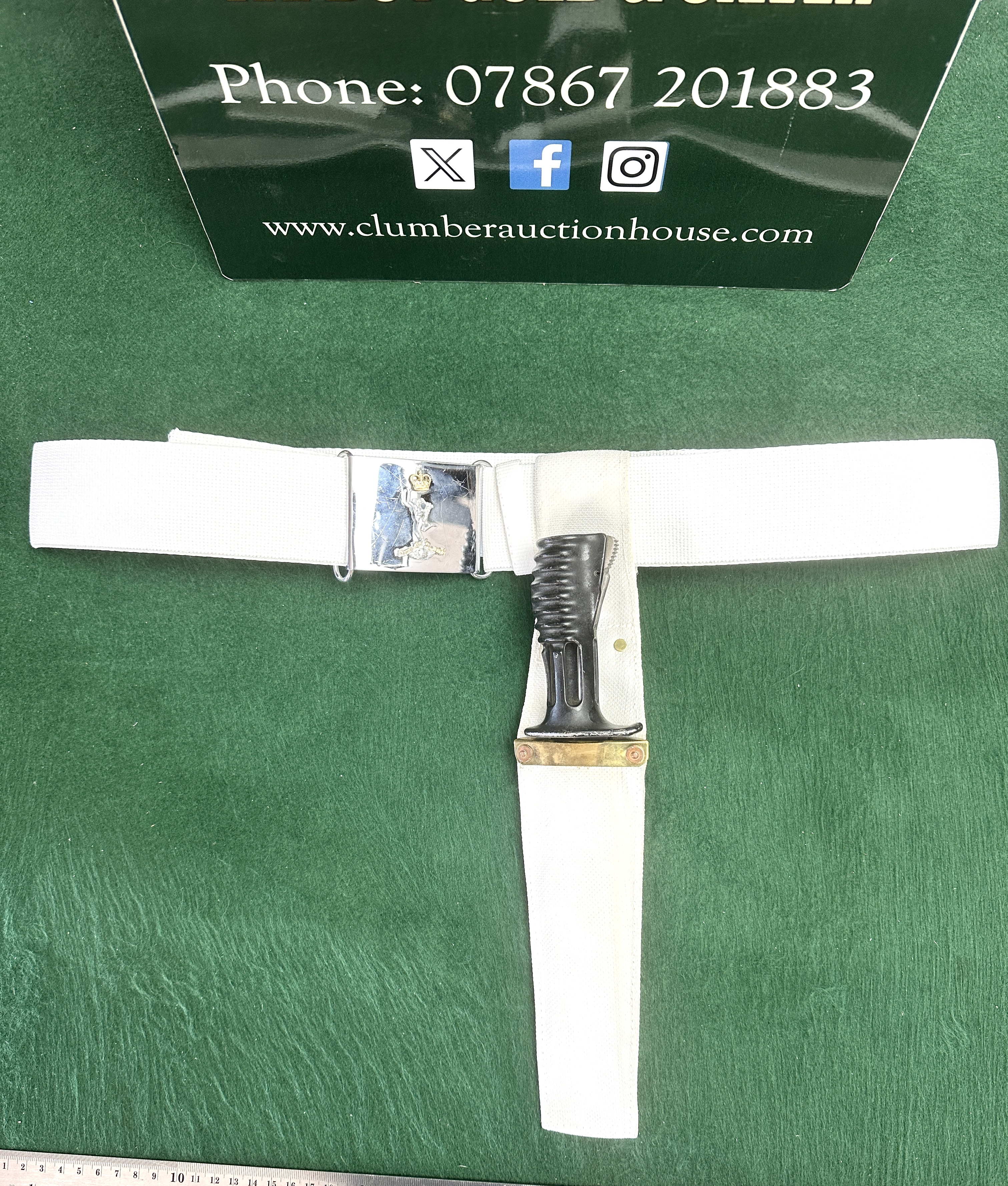 A British Army ceremonial dress set associated with the Royal Corps of Signals. The lot comprises a white web belt and an L3A1 socket bayonet with a matching frog. The belt is fitted with a polished chrome-finish rectangular buckle featuring a centrally mounted bimetal insignia. This insignia depicts the figure of Mercury, known as Jimmy, standing upon a globe and surmounted by a St Edward’s Crown. The base of the insignia features a scroll with the raised motto Certa Cito. The L3A1 socket bayonet, designed for the SA80 rifle series, features a black ribbed synthetic grip with a spring-loaded catch. The bowie-style blade is designed with a wire-cutter notch and a partially serrated edge. The bayonet is housed in a white web ceremonial frog with a brass-tone metal throat fitting.