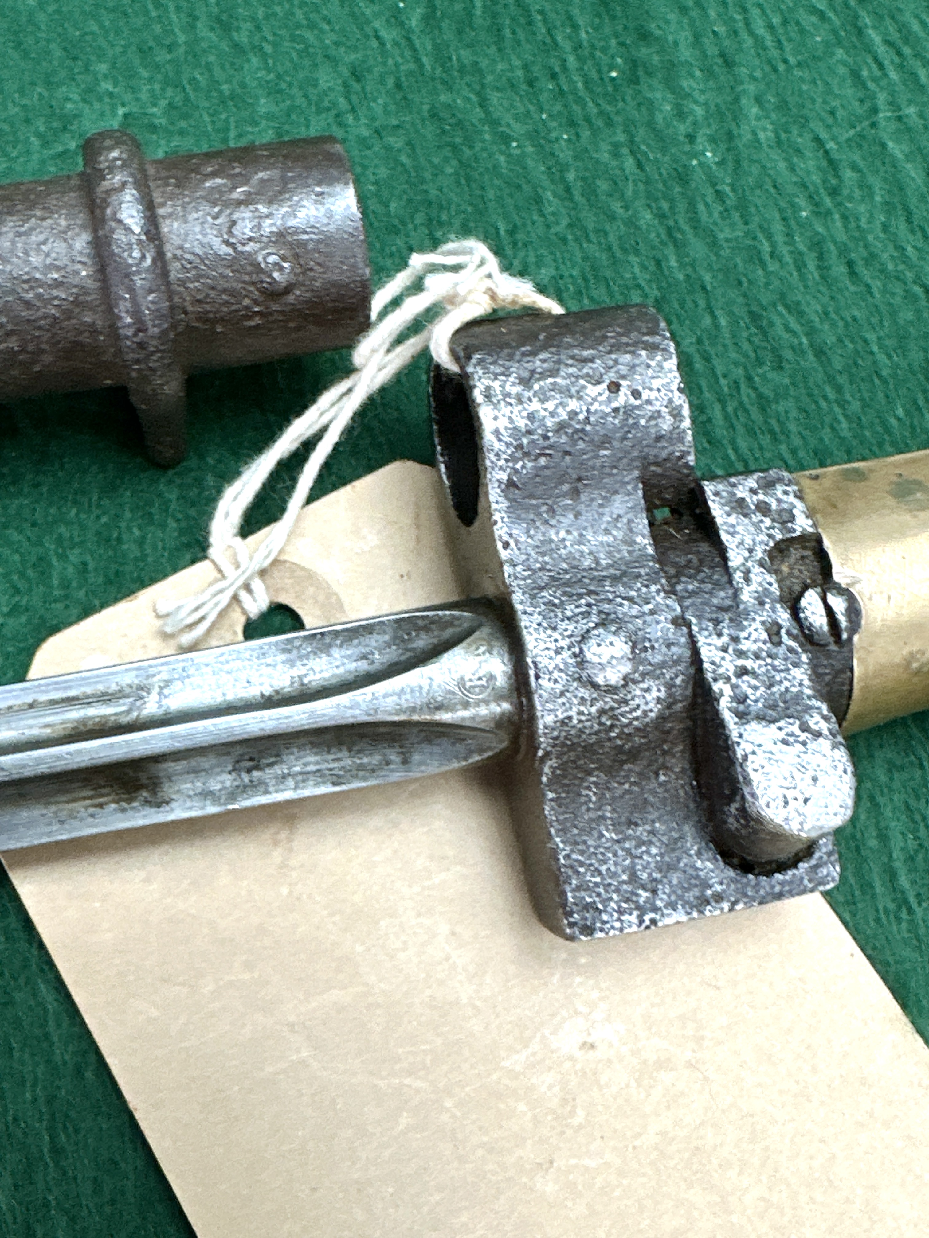 The item is in fair condition. The steel crossguard and the entire exterior surface of the scabbard show significant oxidation and heavy pitting. The brass hilt has a dark age-related patina with some minor surface scuffs. The blade remains relatively bright with some surface wear and minor spotting. The locking button on the hilt is present and functional.