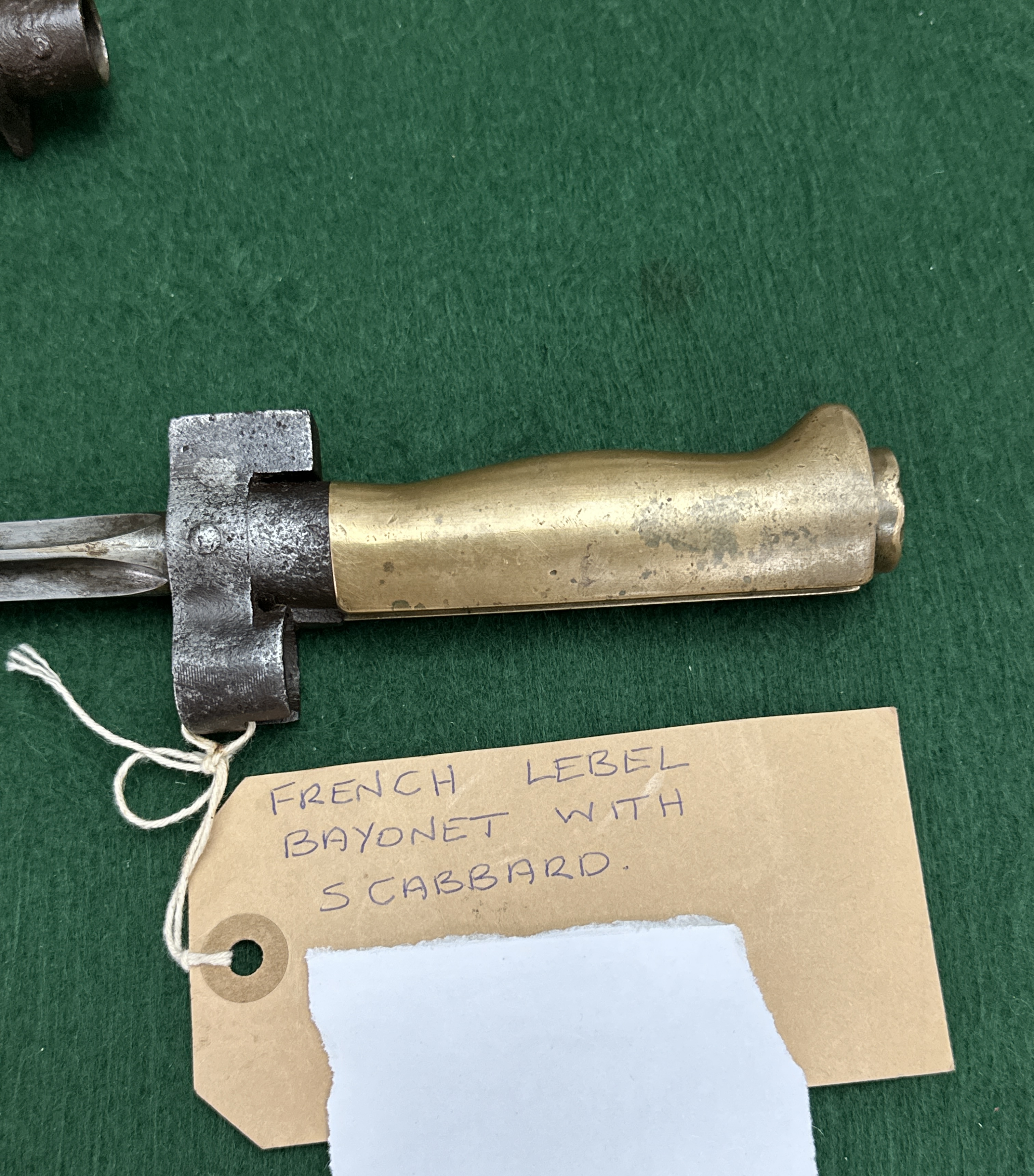 A French Model 1886/15 Lebel infantry bayonet, often referred to by the colloquialism Rosalie. This example features a steel cruciform blade designed for thrusting, paired with a cast brass hilt and a steel crossguard. The crossguard is fitted with a muzzle ring and notably lacks the hooked quillon, a design simplification introduced in 1916 during the First World War. The bayonet is accompanied by its original cylindrical steel scabbard, which terminates in a small ball-shaped tip. A circular French military inspection stamp, known as a poincon, is visible on the ricasso of the blade.