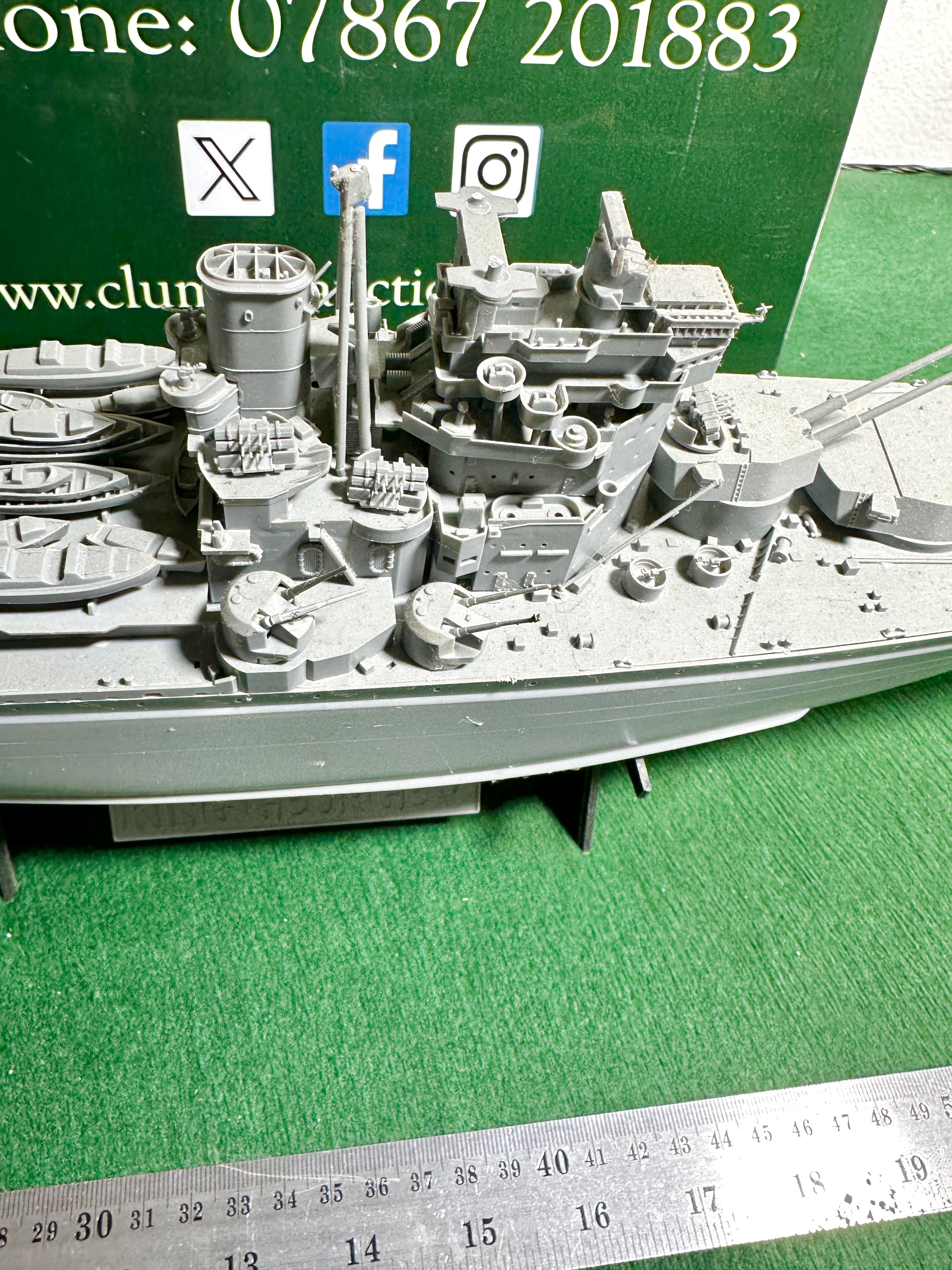 This is a pre-assembled plastic model kit of the British battleship HMS King George V. The model is constructed from grey plastic and remains in an unpainted state. It features a high level of detail including the characteristic main armament of two quadruple and one twin gun turrets, alongside secondary batteries, anti-aircraft weaponry, and deck-mounted lifeboats. The superstructure includes intricate bridge details, masts, and twin funnels. The model is mounted upon a black plastic display stand which features an integral nameplate with raised lettering reading BRITISH BATTLESHIP KING GEORGE V. No manufacturer branding or logos are visible on the exterior of the model or the stand.