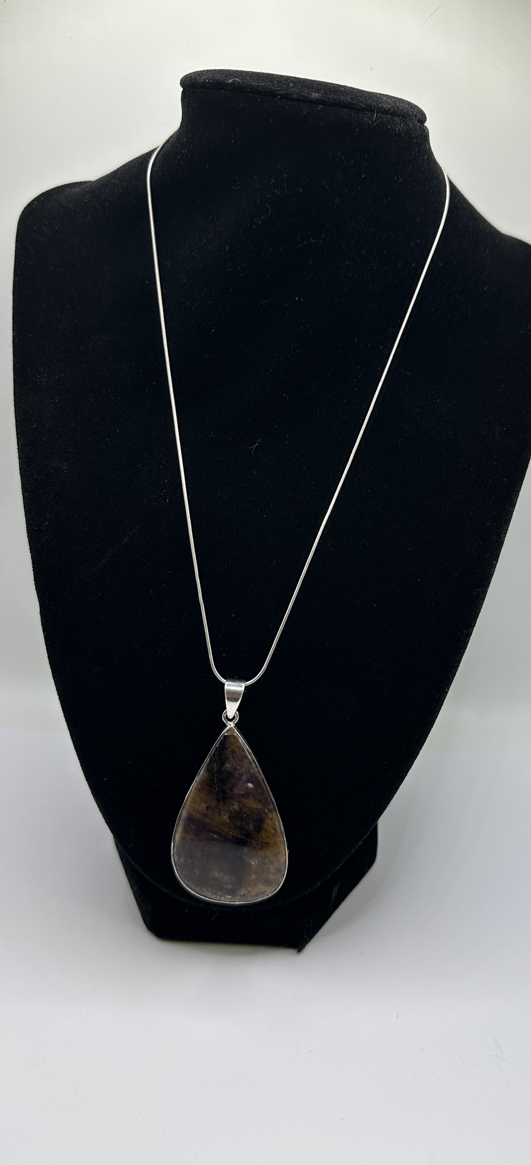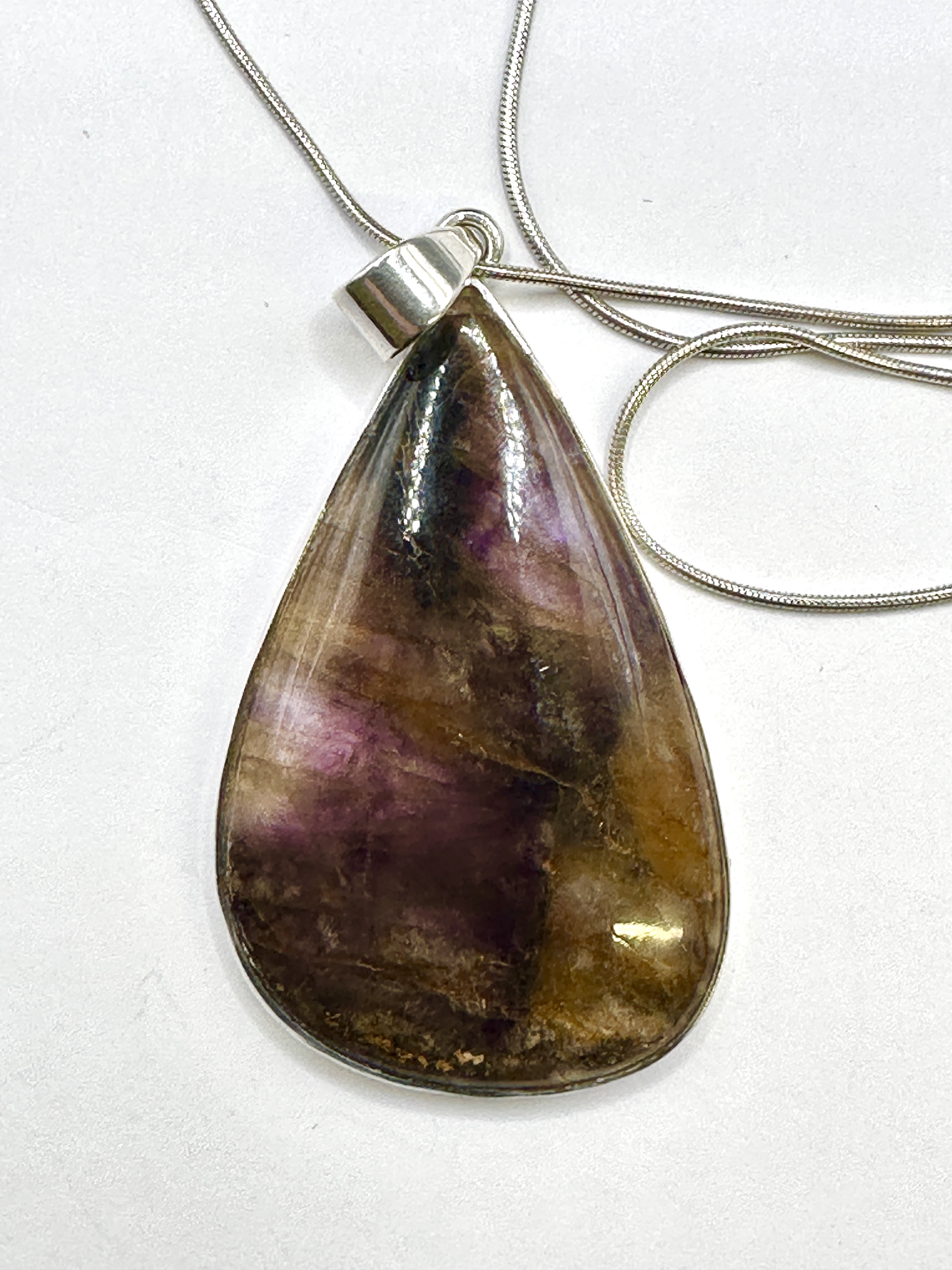 A pendant necklace featuring a large pear-shaped cabochon of Derbyshire Blue John. The stone displays characteristic colour zoning with bands of deep purple, honey-yellow, and dark brown. The pendant is held in a 925 silver bezel setting with a plain, tapered bail. It is suspended from a fine 925 silver snake chain. No hallmarks or maker’s marks are visible on the metalwork.