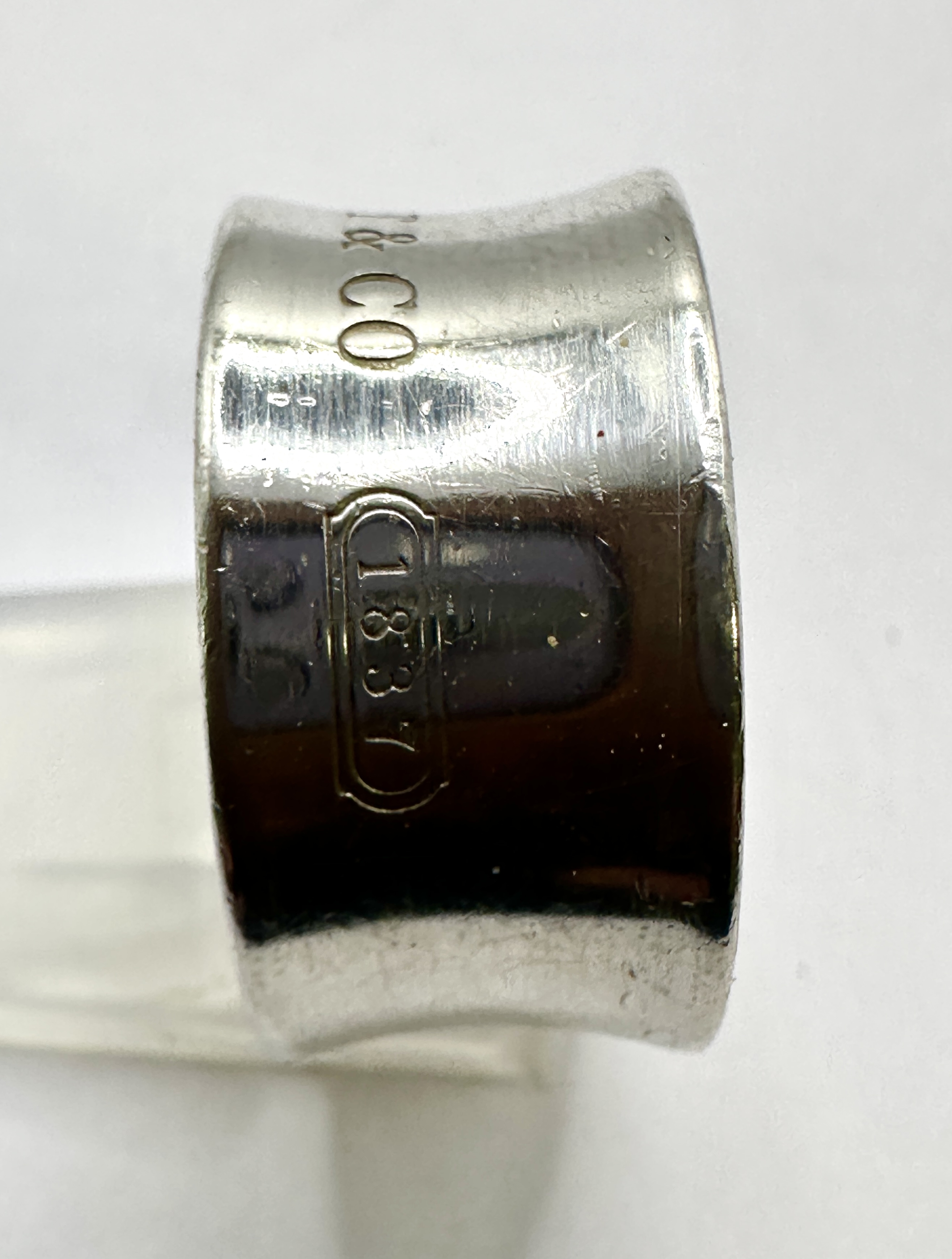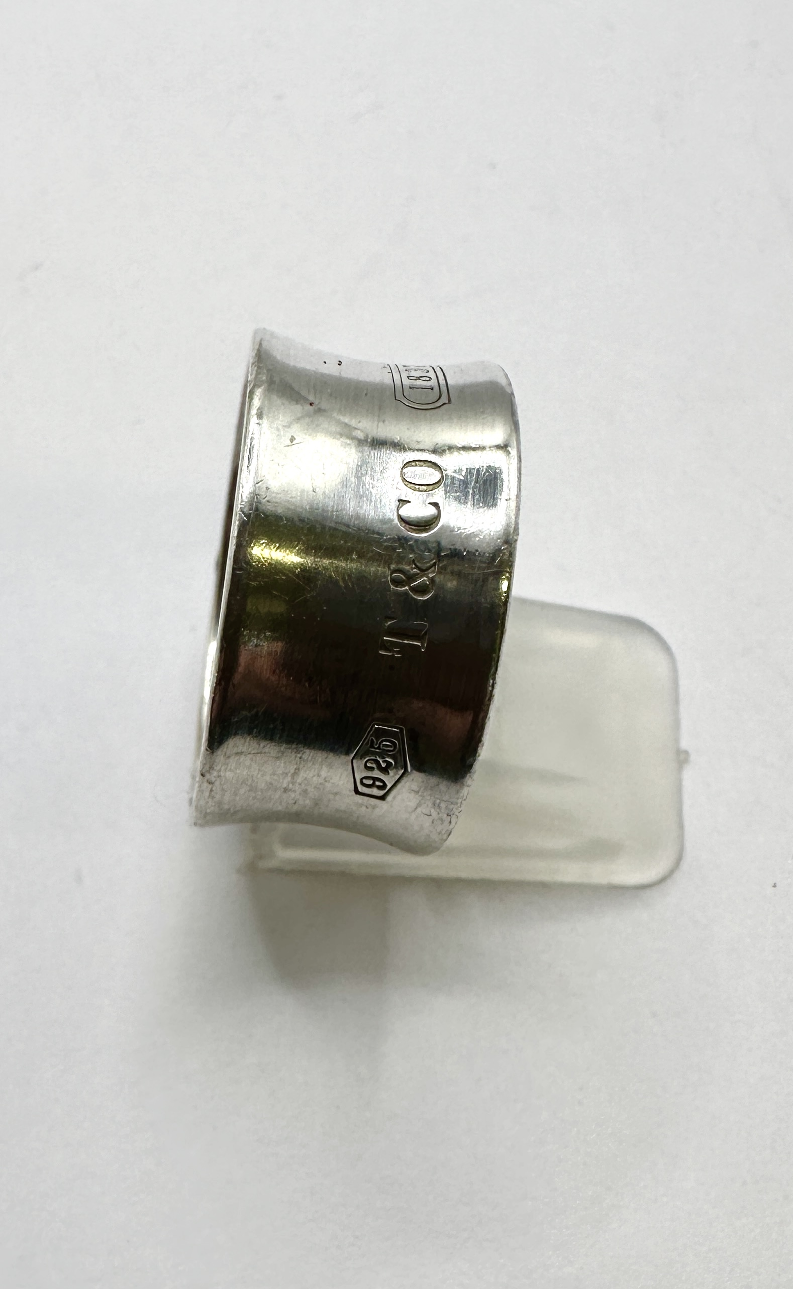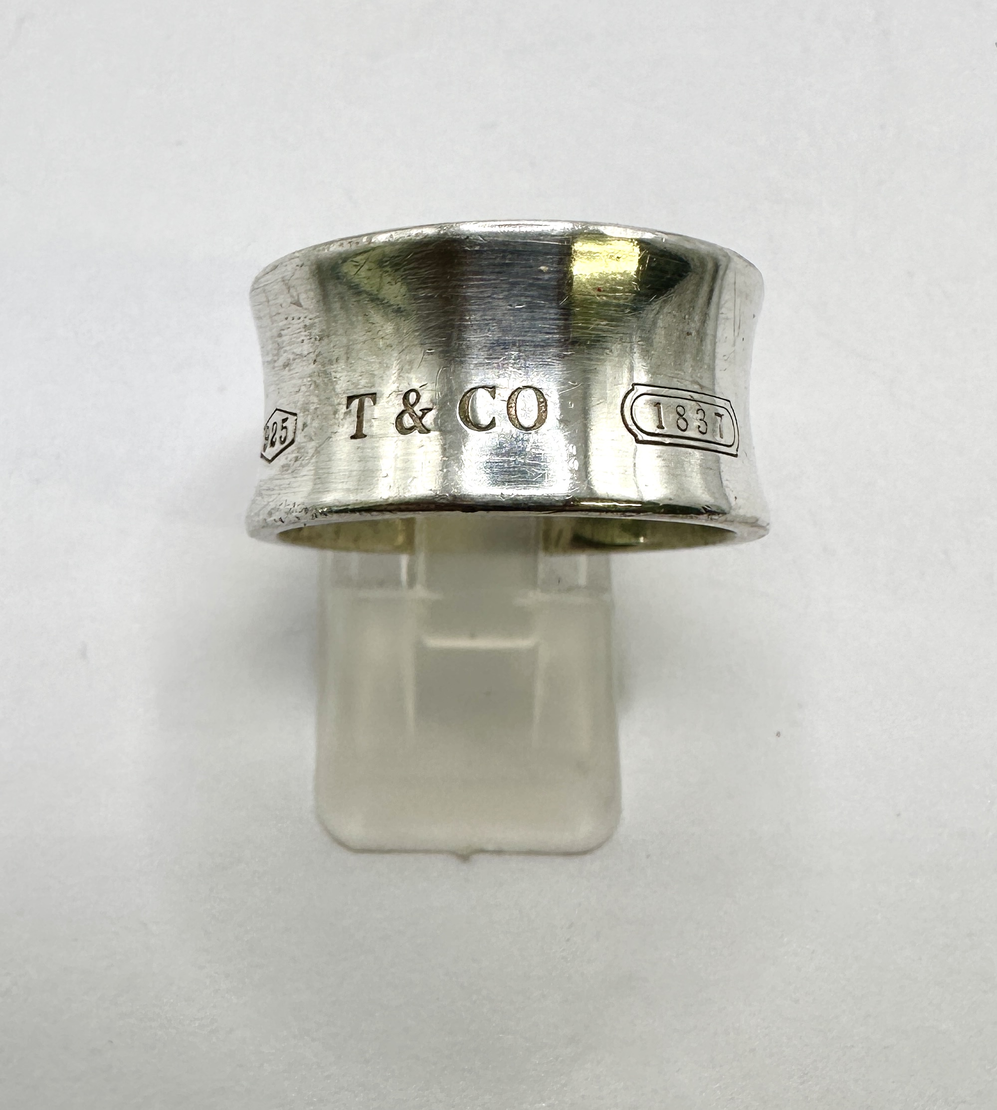 A Tiffany & Co. 1837 wide band ring, also known as a cigar band, crafted from 925 silver. The design features a distinctive concave profile with a high-polish finish. The exterior of the band displays three sets of stamped marks: the numerical fineness mark 925 contained within a hexagonal cartouche, the characters T & CO in a serif typeface, and the year 1837 contained within a rounded rectangular cartouche. The interior of the band is smooth and polished. Due to the significant width of the band, this ring may fit more tightly than a standard narrow band of the same size.