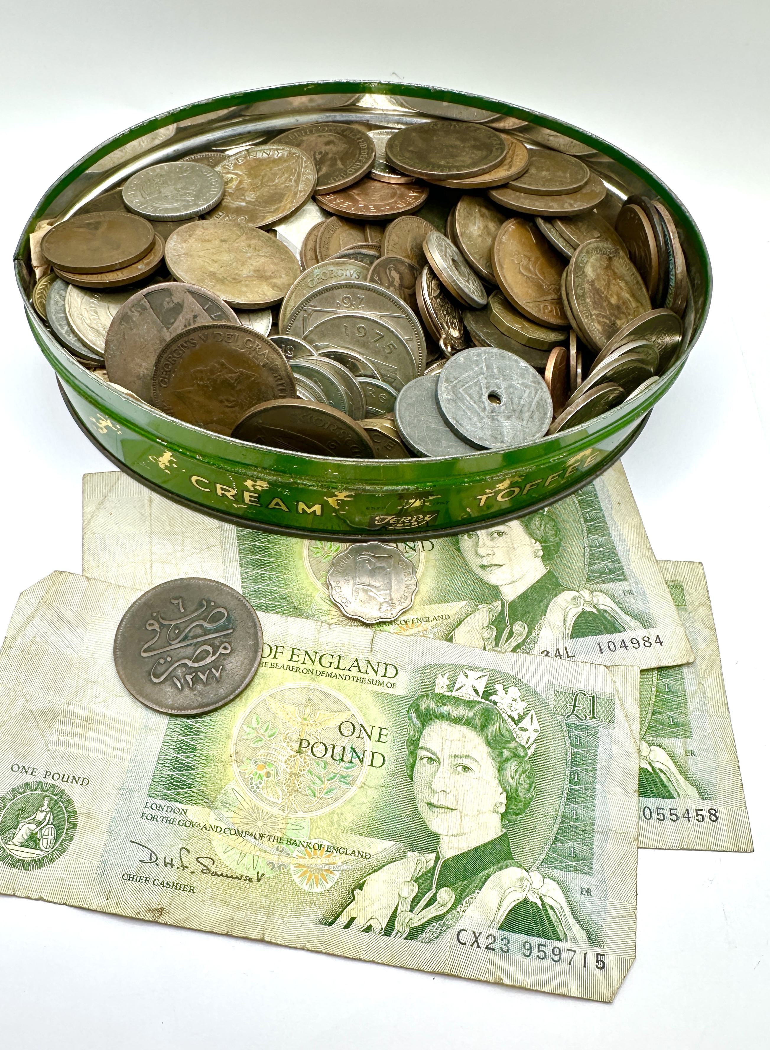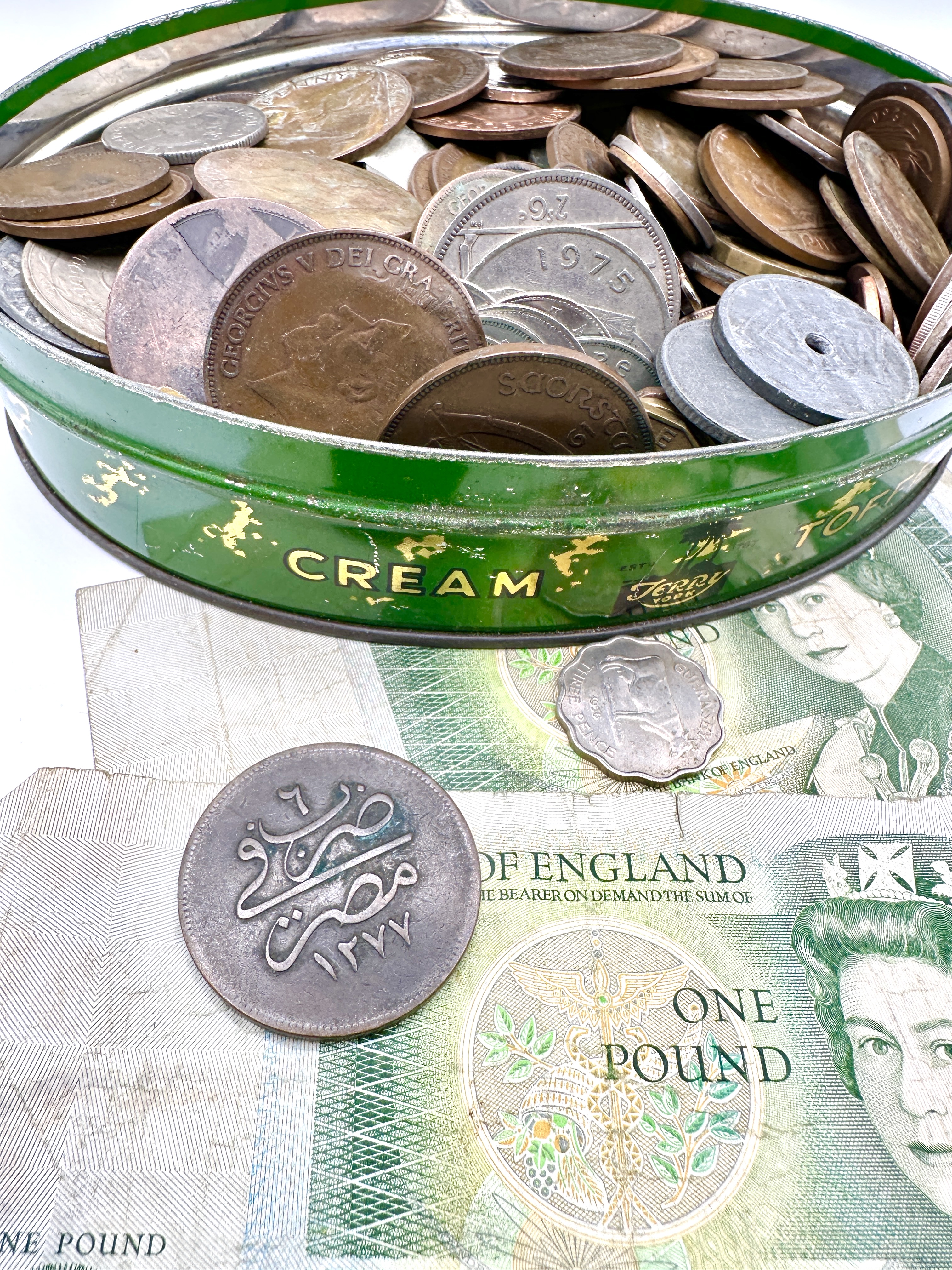 The items are in circulated condition. Banknotes exhibit multiple folds, creasing, and light staining. Coins show varying degrees of wear, toning, and surface marks consistent with age and circulation. The tin exhibits paint loss, scratches, and surface oxidation.