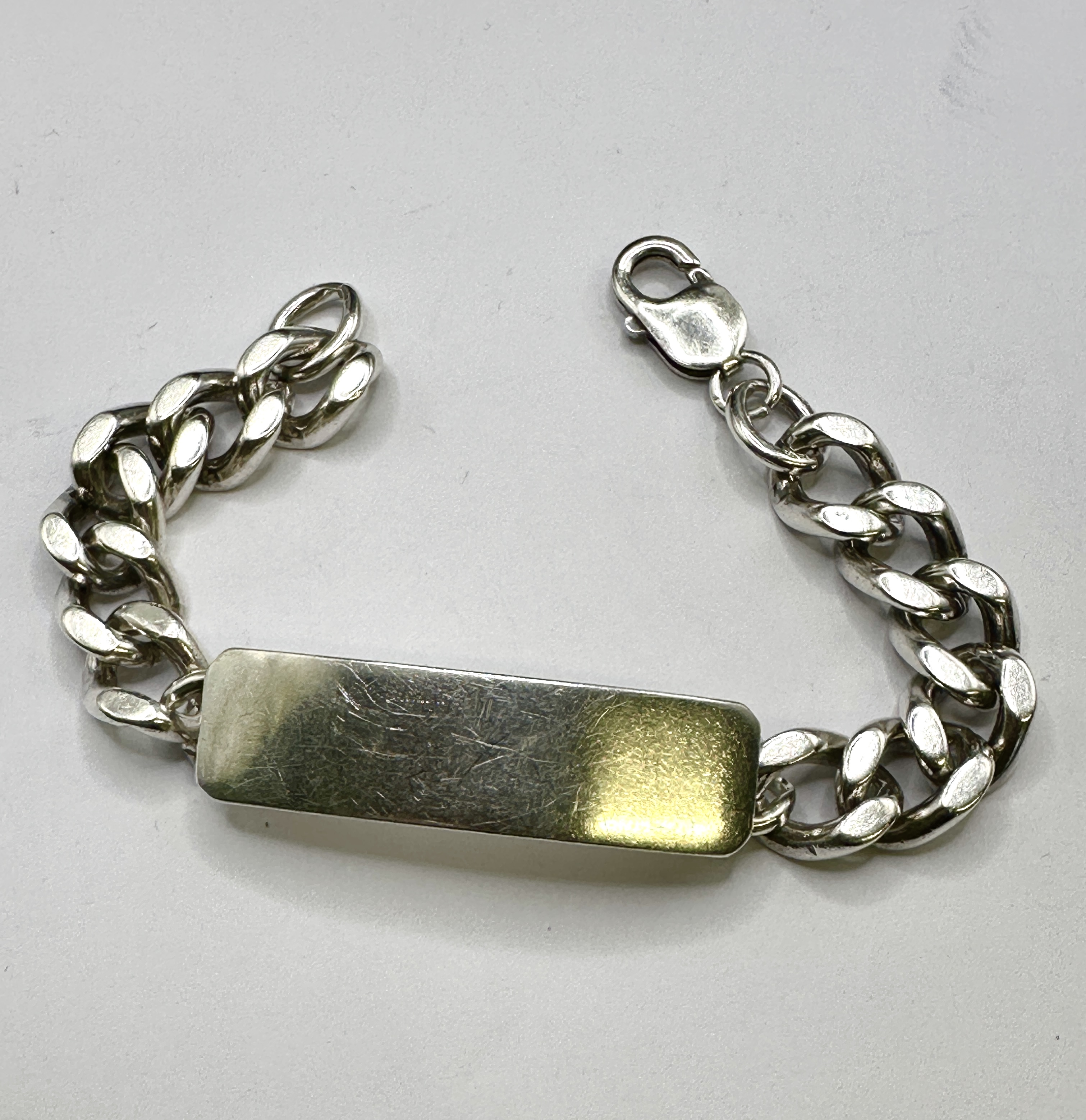 A 925 silver identity bracelet featuring a heavy gauge curb link chain and a central rectangular identification plate. The plate is plain and has not been engraved. The bracelet is fitted with a lobster claw clasp for secure fastening. A 925 mark is stamped on the flat surface of the clasp, denoting the silver purity. No other maker marks or hallmarks are visible.