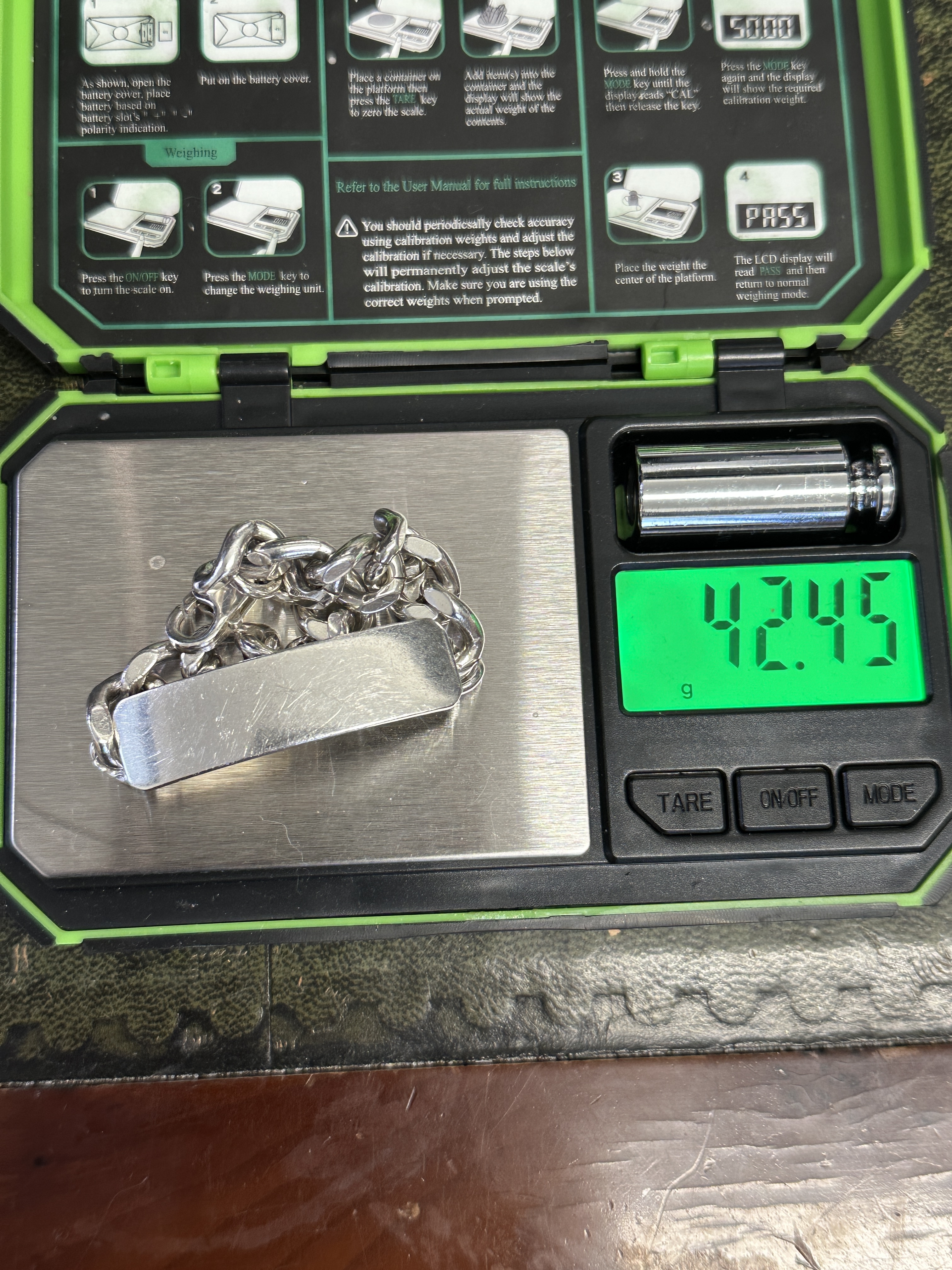 The item is in used condition. There are significant surface scratches, scuffs, and general signs of wear throughout, particularly concentrated on the polished surface of the ID plate. The chain links and clasp mechanism are in good working order.