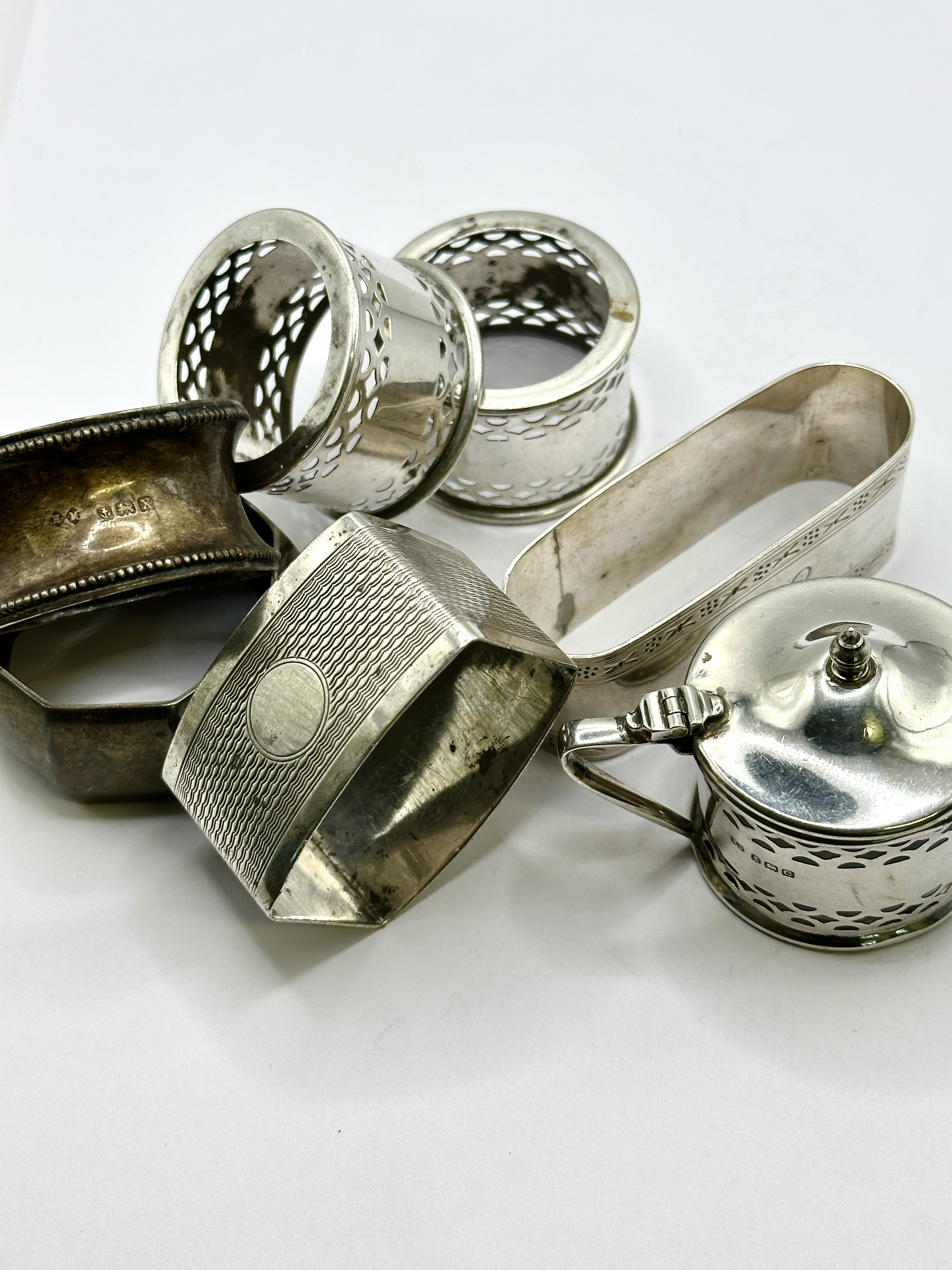 A collection of 925 silver items comprising a pierced mustard pot and various napkin rings. The